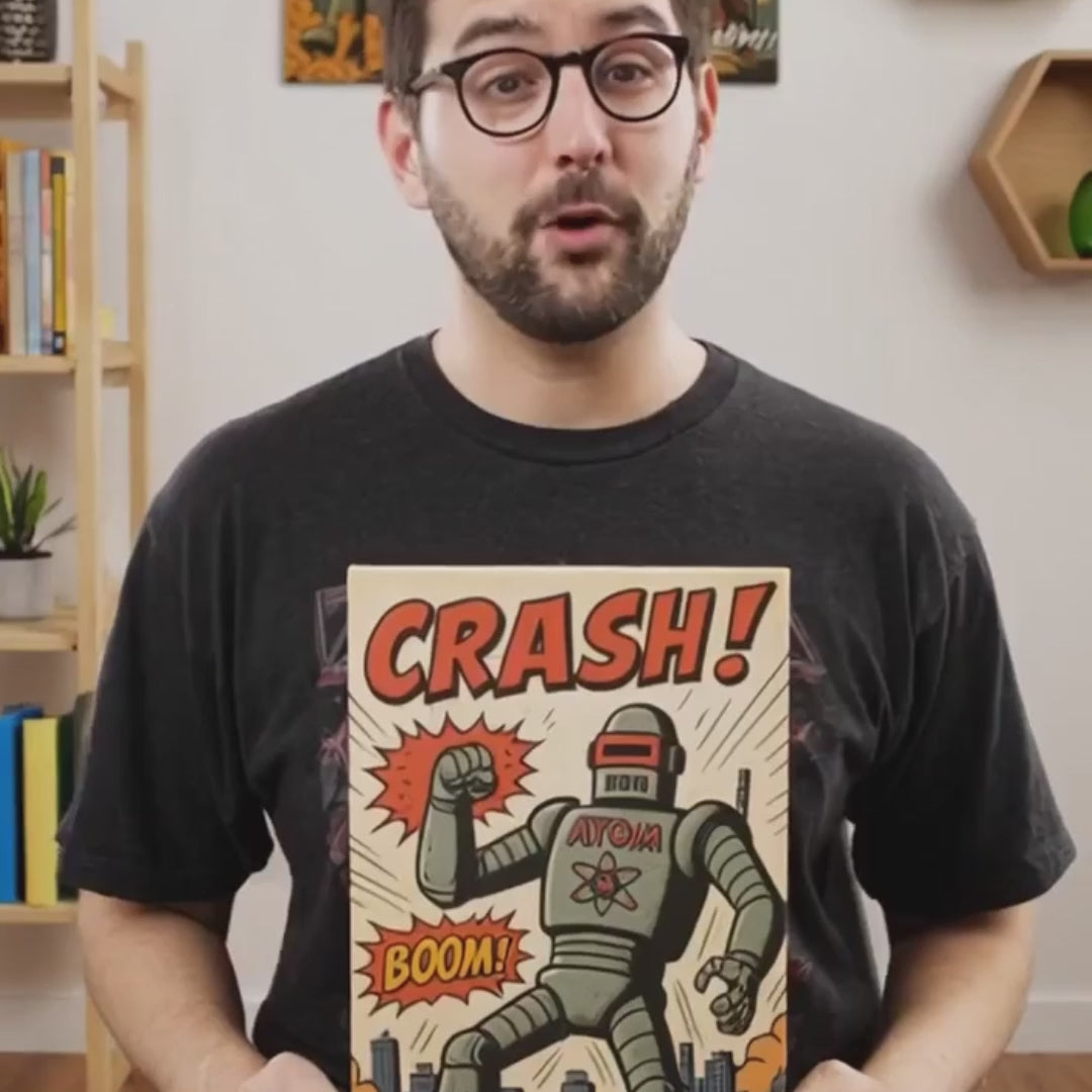 Unleash the chaos of retro sci-fi mayhem with Atomic City Mayhem! A roaring tribute to the atomic-age imagination of 1950s pulp comics. This explosive wall art showcases a colossal robot towering over a vintage city skyline, crushing buildings underfoot as comic bursts scream CRASH! and BOOM! in bold halftone brilliance. Rendered with authentic aged-paper texture, thick inking, and dynamic reds, yellows, and blues, it perfectly channels the nostalgic drama of mid-century adventure art. Ideal for collectors, retro fans, and lovers of bold pop culture design.
