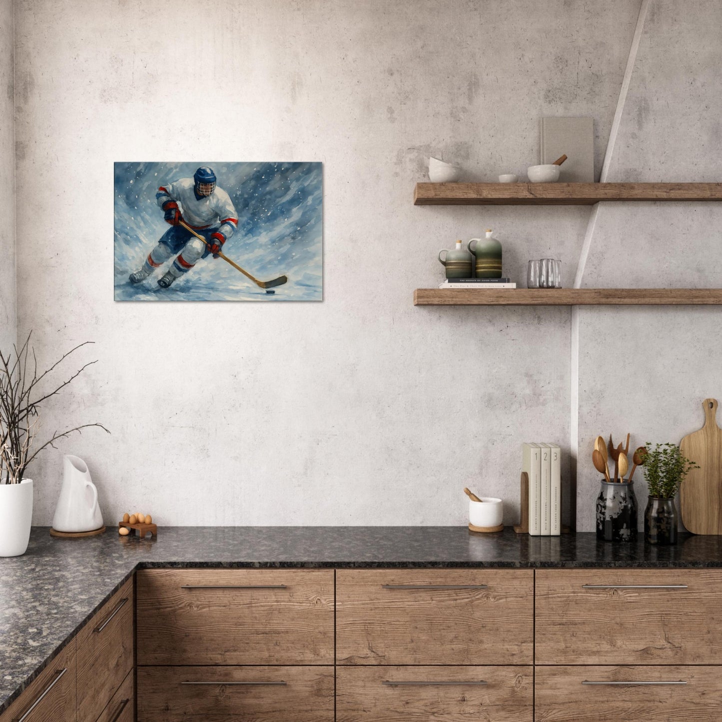 Blizzard Breakaway captures the breathtaking drama of a lone forward storming the ice. Snow whips around him in a frozen halo as he charges toward the goal, every stride laced with determination. The blurred glow of the crowd fades behind, centering the viewer on the athlete’s raw speed and focus. Cool whites and icy blues dominate, broken by flashes of team colour, creating a cinematic vision of adrenaline and precision.