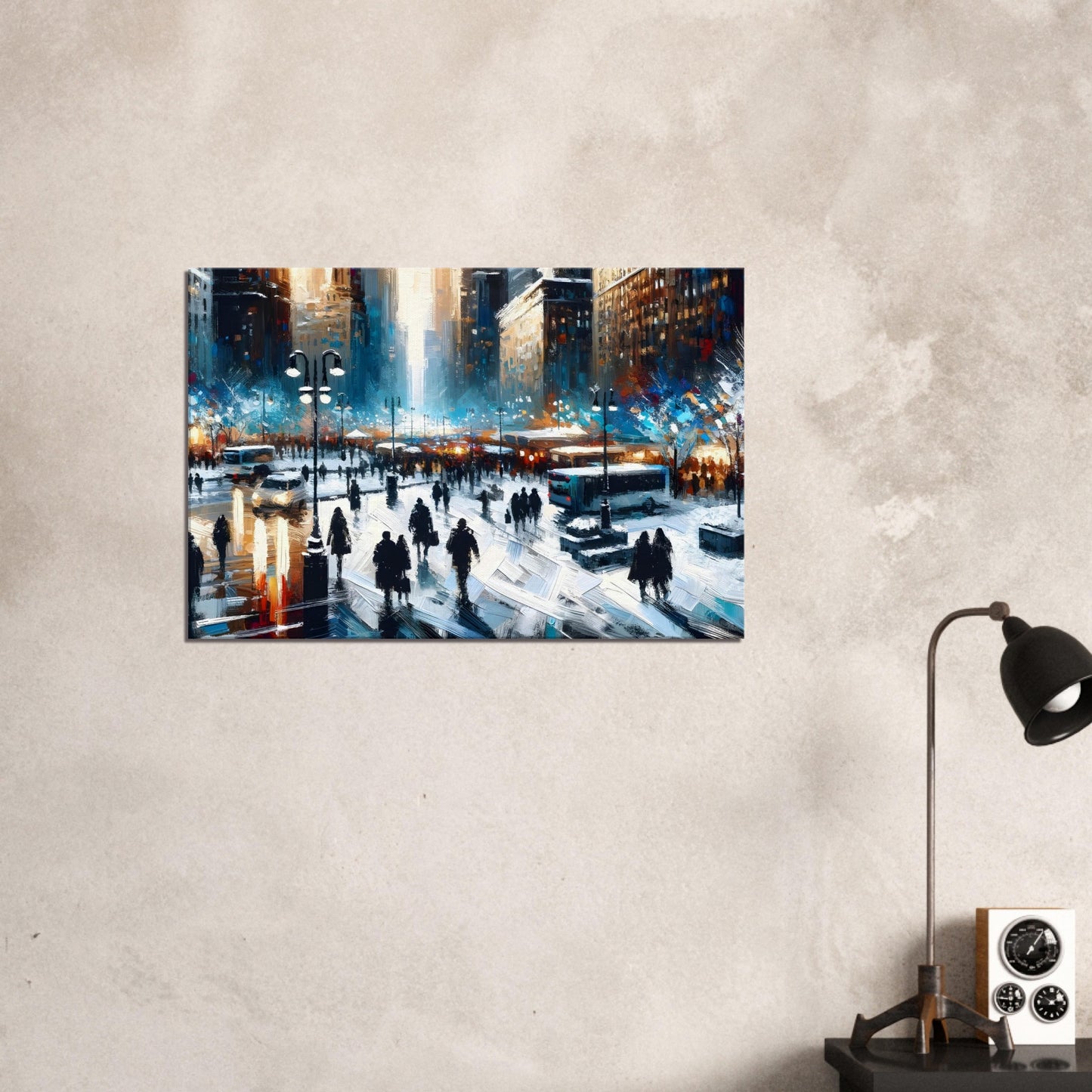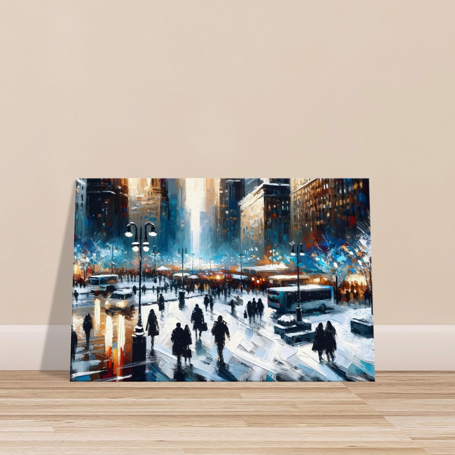 The blend of cool winter tones with vivid urban highlights creates a beautiful contrast, bringing warmth and motion to this snowy metropolis. A perfect statement piece for modern interiors, this original Canvas Connoisseurs artwork radiates city charm and seasonal energy.