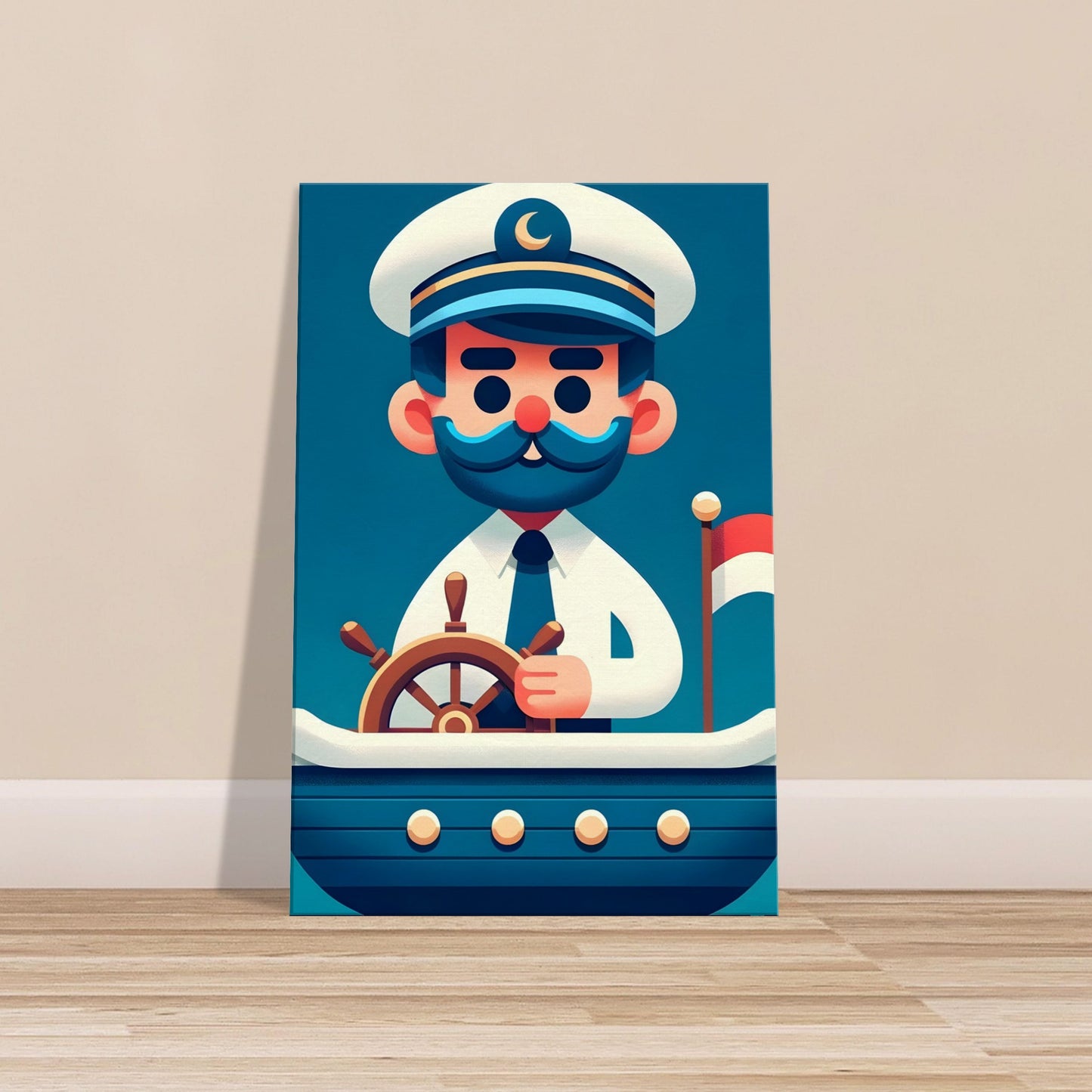 Set sail with Captain Wave: The Sea Explorer, a minimalist wall art piece that celebrates the spirit of nautical adventure and leadership. Dressed in a crisp white and navy uniform, Captain Wave stands confidently at the helm, his captain’s hat and ship’s wheel symbolizing mastery over the seas. His assured expression reflects a deep passion for exploration and command, inspiring young adventurers to dream of open waters and bold voyages. Against a clean, solid background, this animated cartoon illustration transforms any nursery, playroom, or bedroom into a gateway to maritime discovery. Captain Wave invites children to embrace courage, curiosity, and the thrill of the sea.