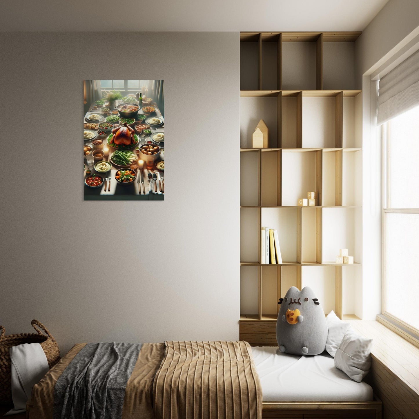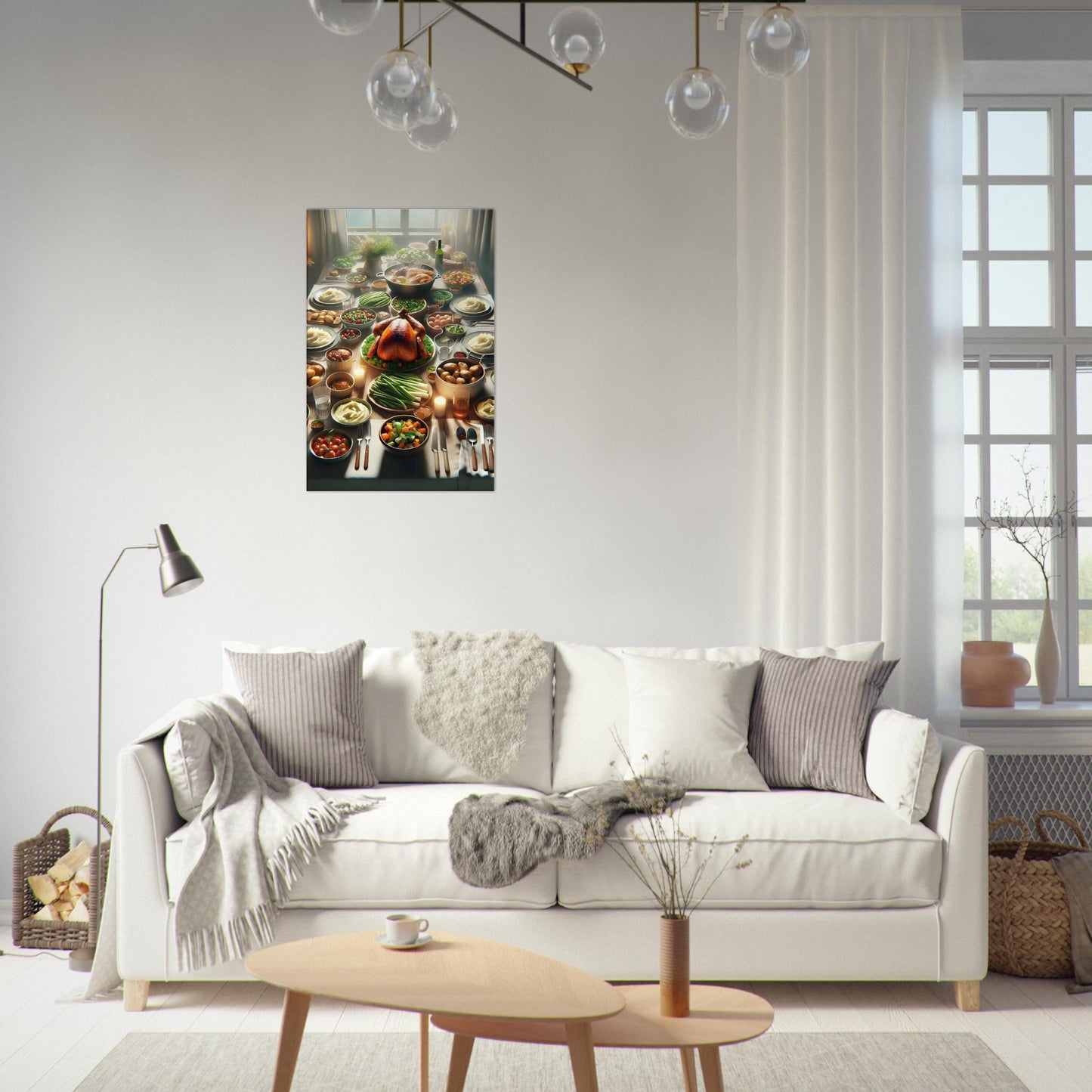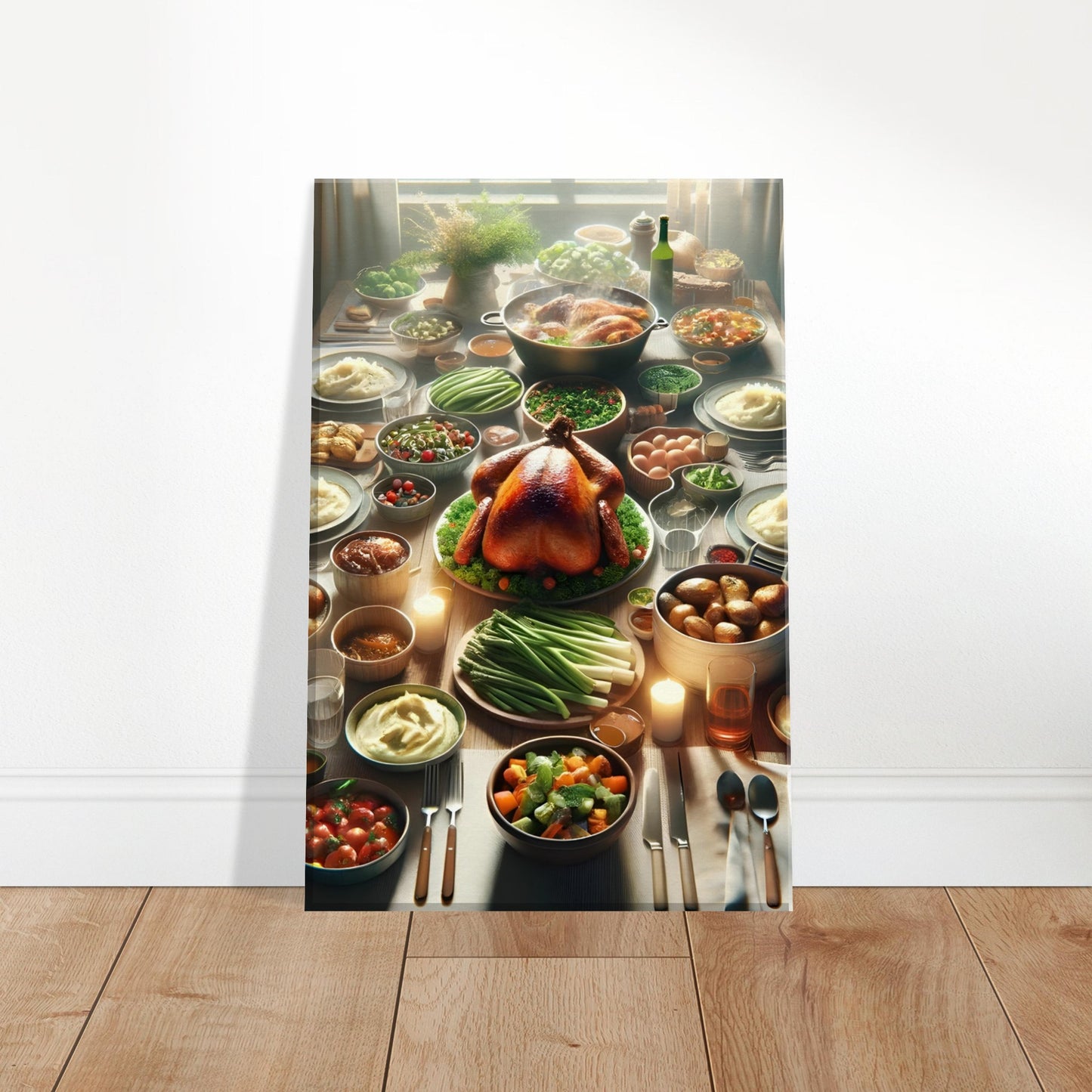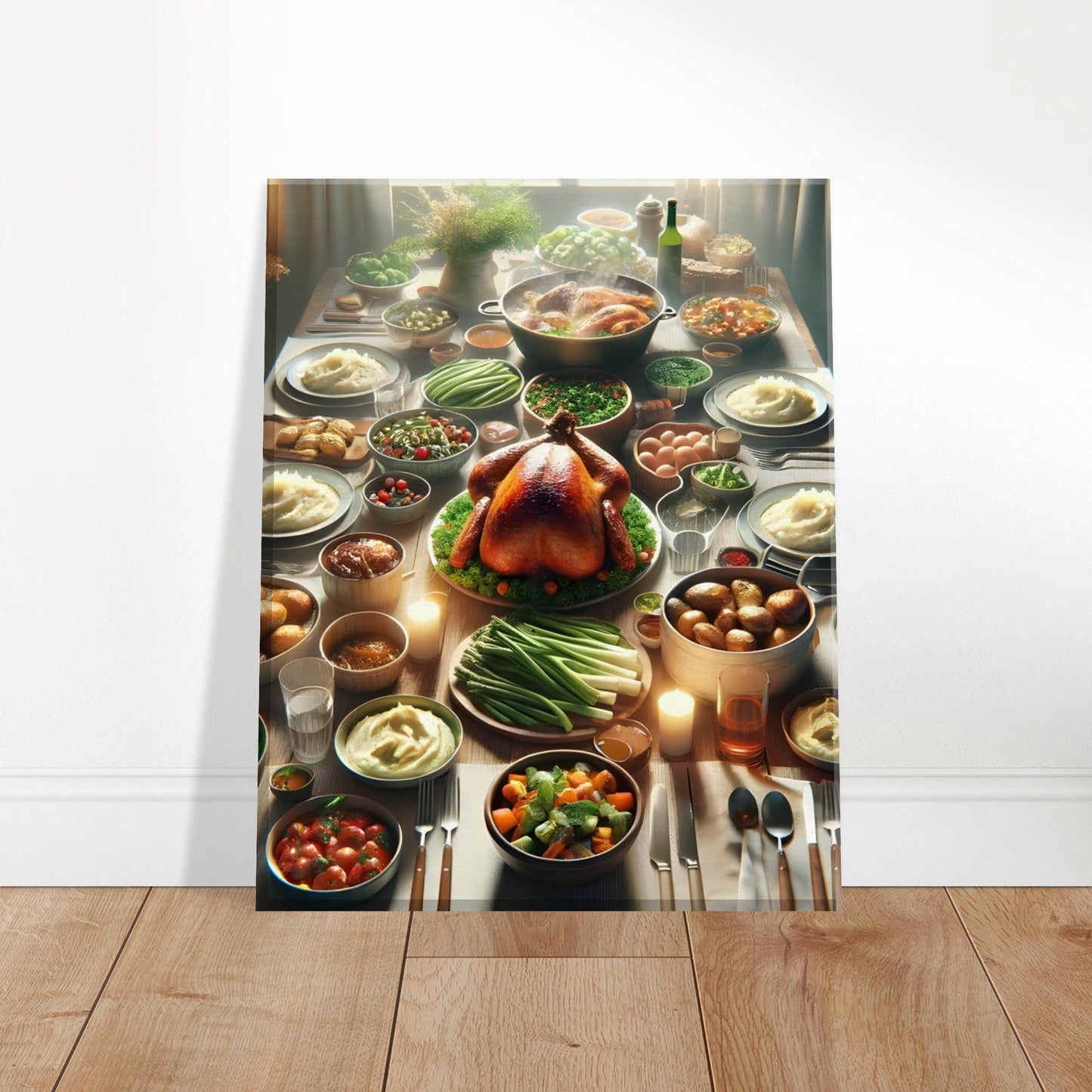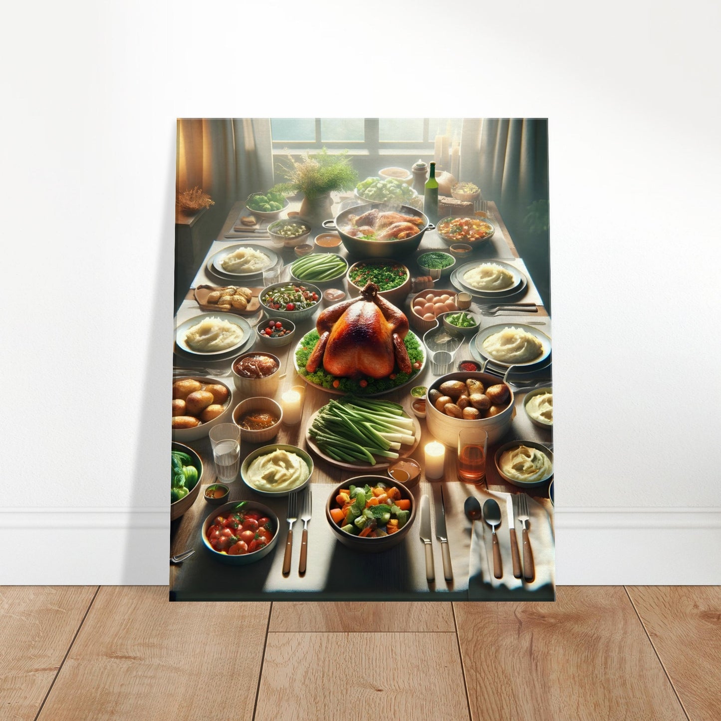 Family Table beautifully captures the warmth and togetherness of a cherished family feast. This canvas print features a rustic wooden table adorned with a perfectly roasted turkey surrounded by creamy mashed potatoes, roasted vegetables, and fresh salads. Bathed in soft natural light and flickering candle glow, the scene evokes the joy and comfort of shared meals and festive gatherings.