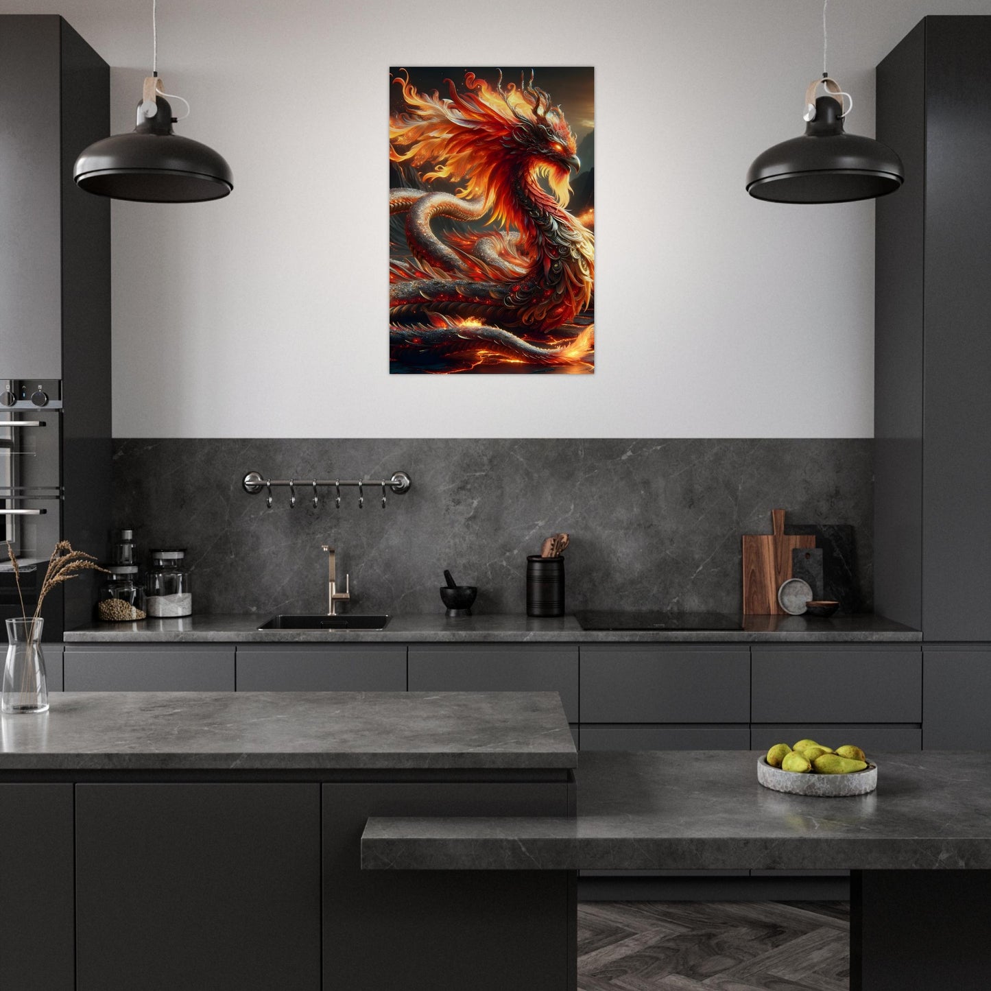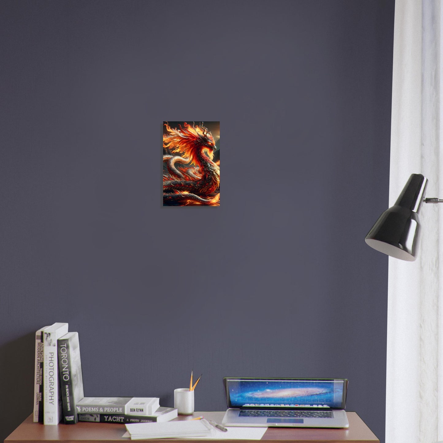 Set against a volcanic landscape of smoking peaks and glowing lava, the metal finish intensifies every luminous detail, casting dramatic reflections and depth across the artwork. Flare Seraphine is more than a piece—it's a statement of rebirth, elemental power, and high fantasy brought to life in rich, unforgettable color. Perfect for bold interiors craving heat, mystique, and motion.