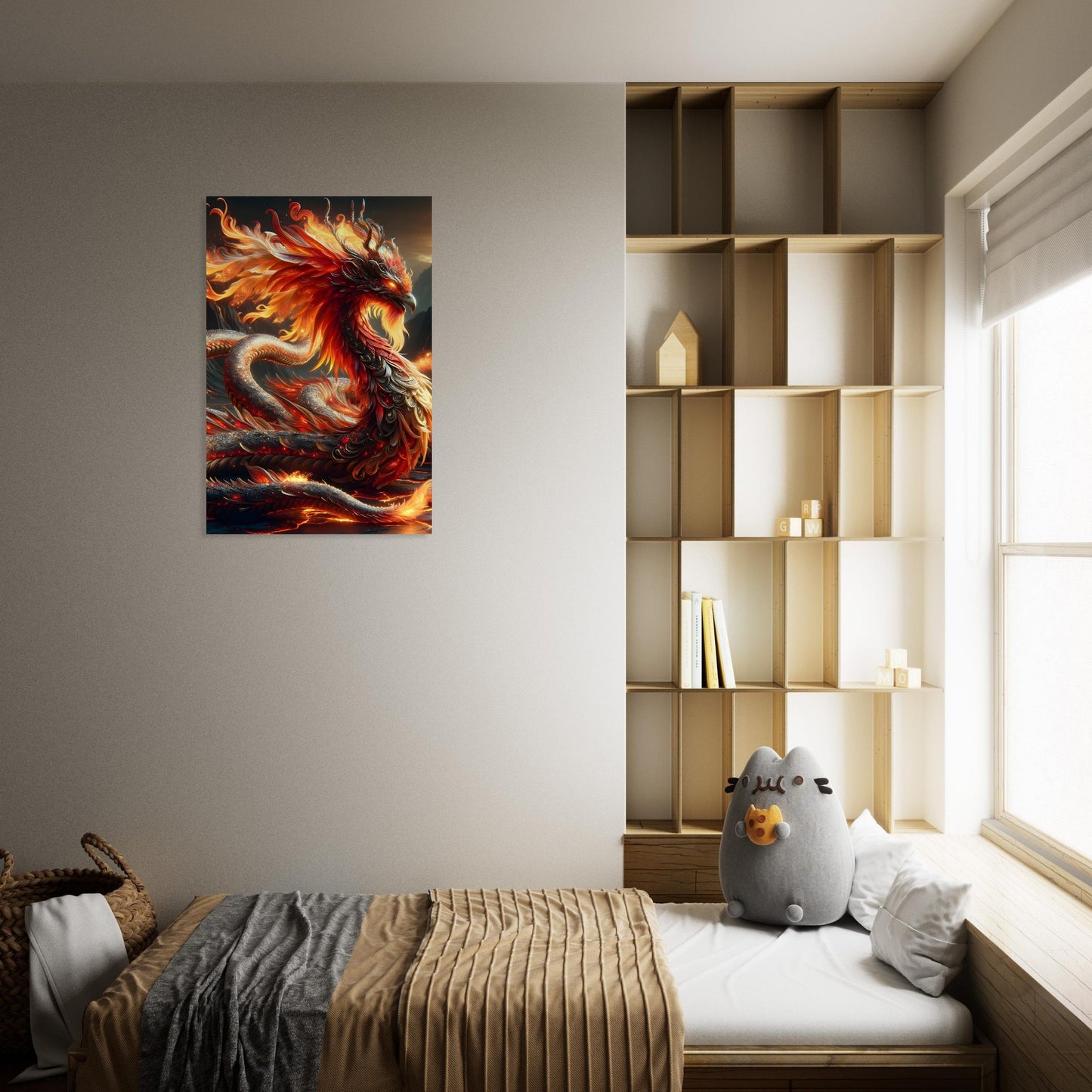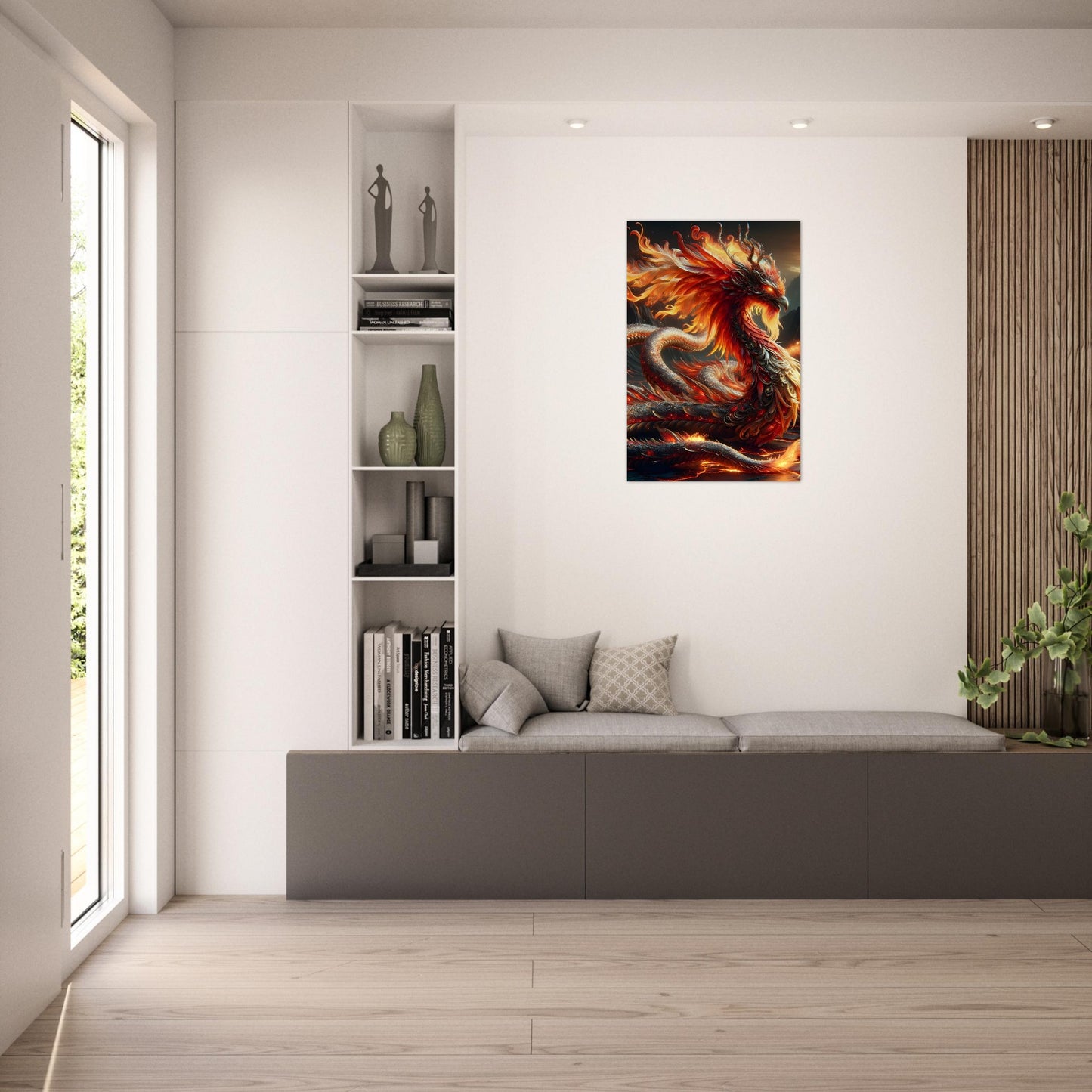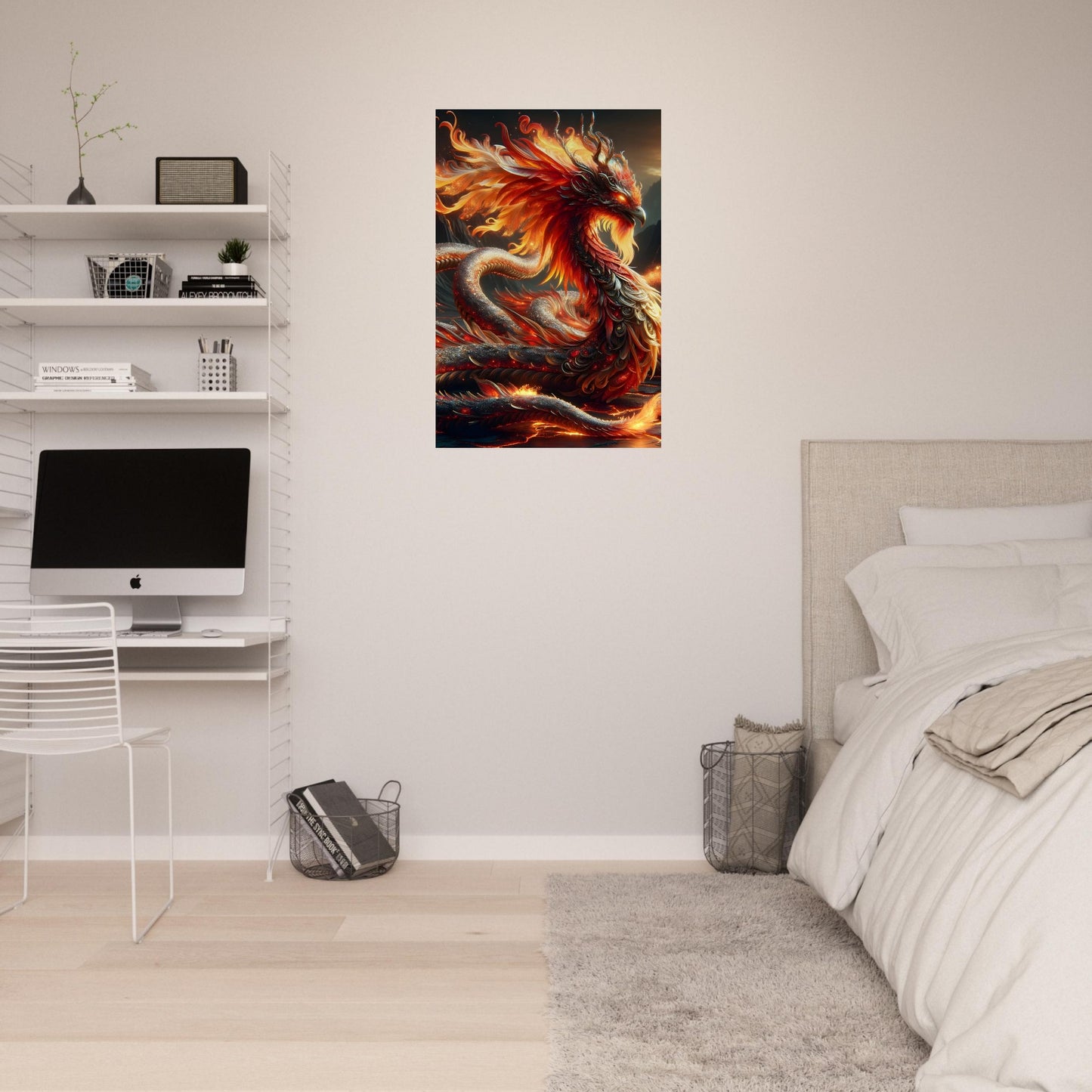 Blazing with elegance and intensity, Flare Seraphine ignites your space with the raw beauty of fire and myth—expertly rendered on a sleek, ultra-HD metal poster. This radiant creature fuses the serpentine grace of a dragon with the divine power of a phoenix, its sinuous form cloaked in molten scales that shimmer in hues of crimson, gold, and fiery orange. A crown of blazing feathers surrounds its regal head, while ember-like eyes glow with ancient, untamed wisdom.