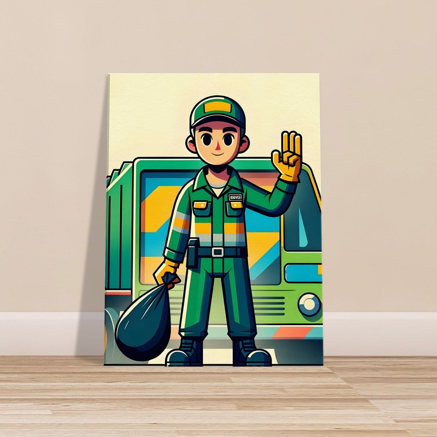 Celebrate responsibility and environmental care with Garbage Guy Gary: The Environmental Hero, a minimalist wall art piece that shines a light on the vital role of sanitation workers. Dressed in vibrant green and yellow workwear, Gary stands proudly beside his colorful garbage truck, holding a bag ready for proper disposal. His cheerful and hardworking expression embodies dedication and pride, inspiring young viewers to appreciate the importance of keeping our world clean. Set against a clean, solid background, this animated cartoon illustration makes environmental stewardship accessible and engaging, perfect for nurseries, playrooms, or classrooms fostering early awareness and respect.