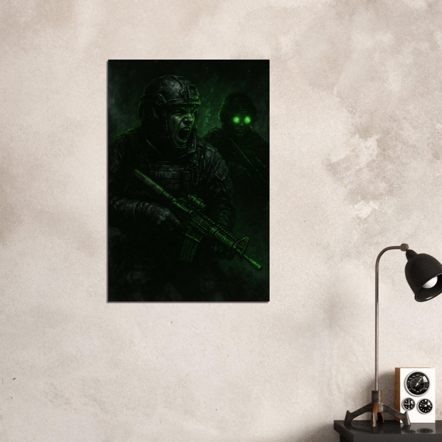 Drenched in electric green and shadow-black, Ghostline Reaper captures the explosive intensity of a night mission turned kinetic. One soldier—screaming, primal, alive—bursts through the darkness, while his partner remains a spectral silhouette, weapon raised, NVGs glowing like twin beacons of war.