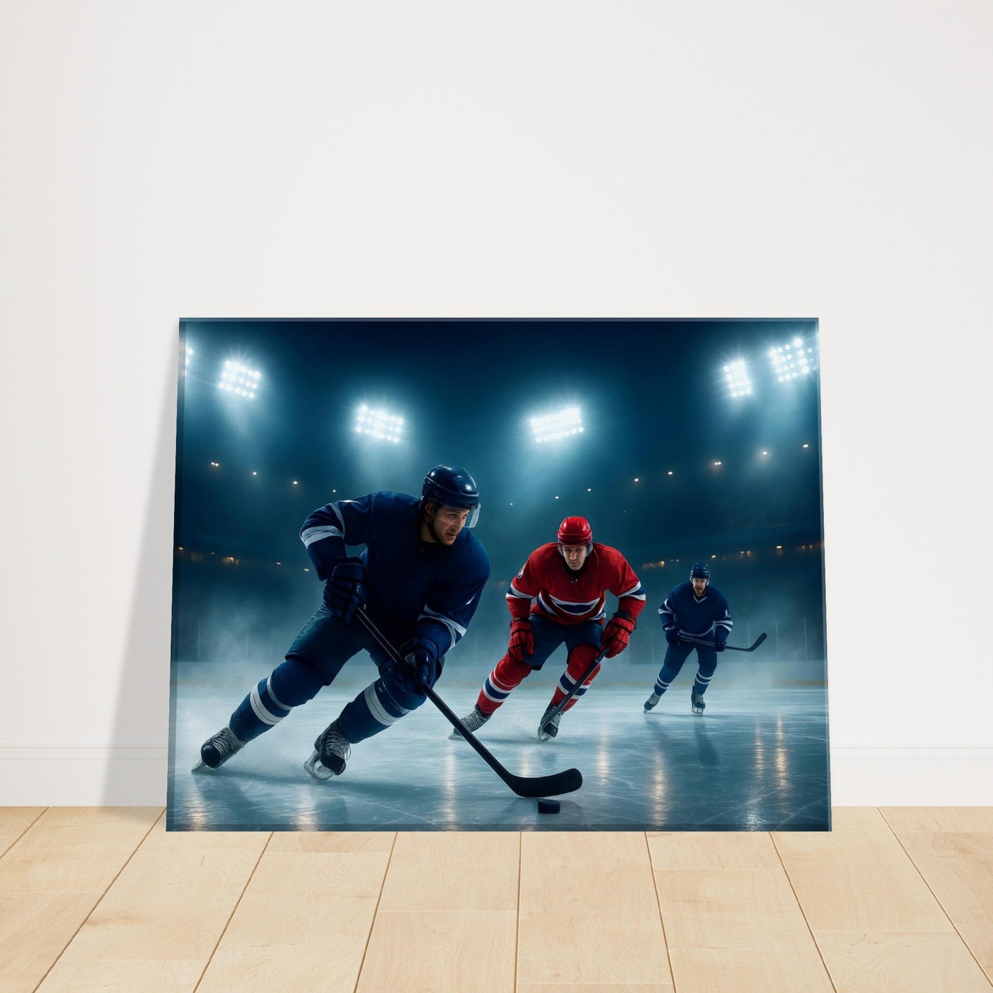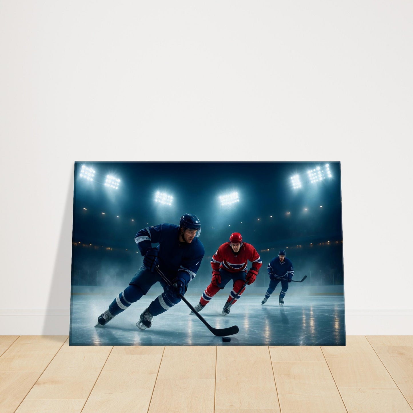 Glacial Legends brings the power and intensity of ice hockey to life. This breathtaking canvas features three players in full motion, racing down the rink under the electric glow of the arena lights. The icy surface reflects their swift movement, while the atmospheric lighting creates a dynamic contrast of cool blues and fiery reds. The sheer speed and determination of the athletes are captured with vivid detail, bringing the viewer into the heart of the game.