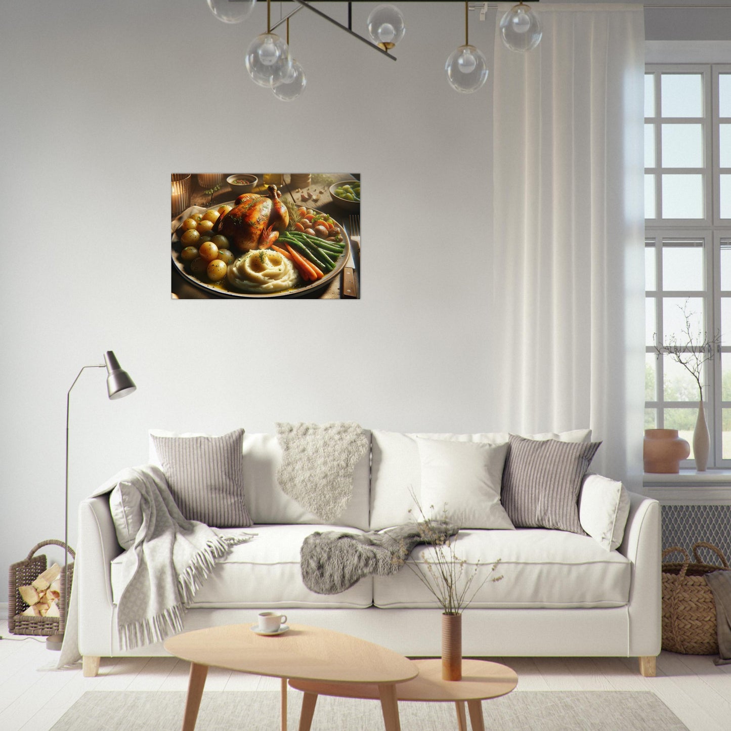 Homely Feast captures the comforting spirit of a family meal with a golden-brown roasted chicken glazed in herbs as the centerpiece. Surrounded by creamy mashed potatoes, tender green beans, glazed carrots, and petite boiled potatoes, this canvas print evokes the harmony of a well-balanced, home-cooked dinner. The rustic wooden table, vintage utensils, and soft lighting create a cozy, inviting atmosphere that celebrates tradition and togetherness.