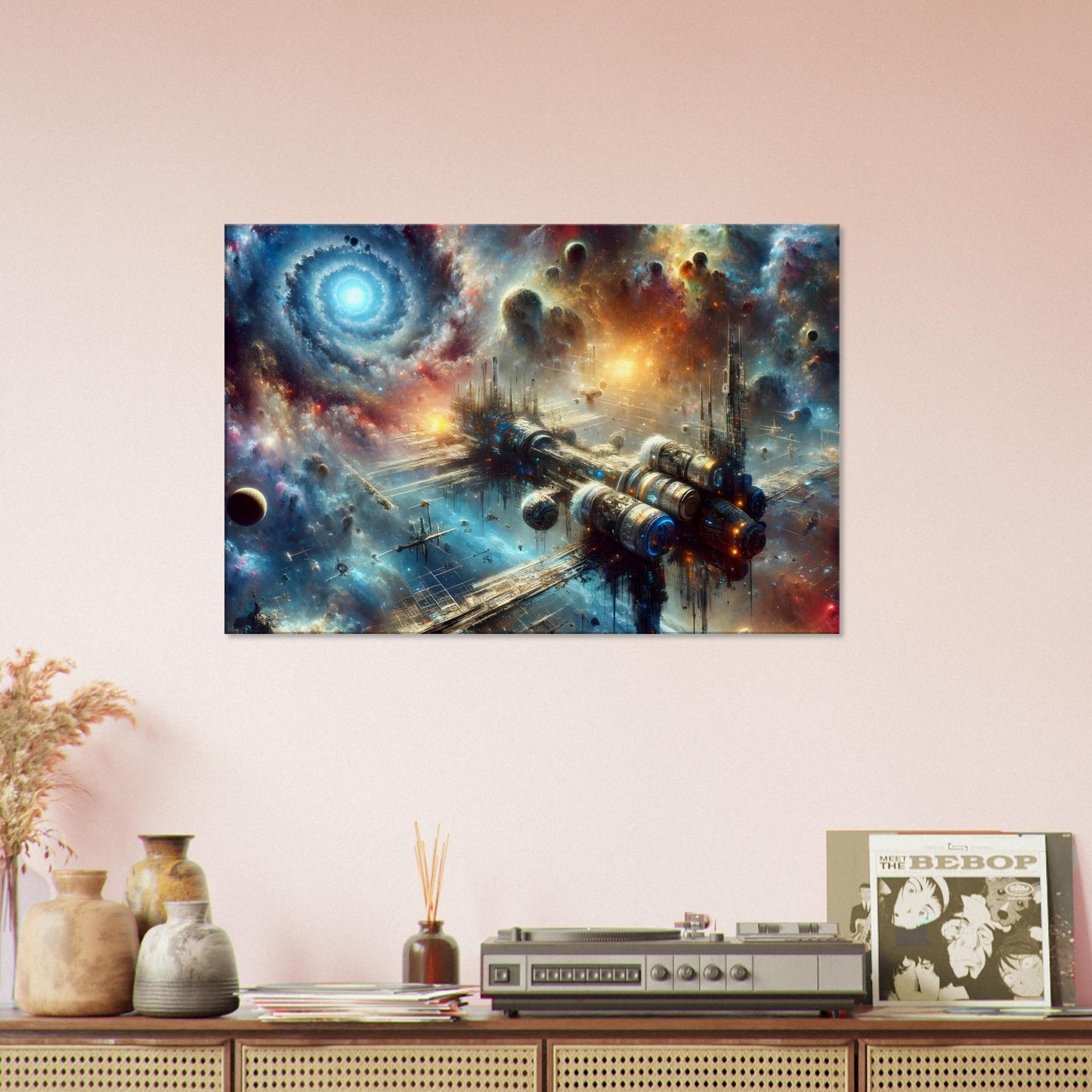Interstellar Odyssey is an awe-inspiring canvas print that captures the grandeur and complexity of deep space travel. At the heart of the composition is a futuristic spaceship, expertly designed with sleek, imaginative features that embody advanced interstellar technology. The vessel is portrayed engaging with the cosmos—perhaps weaving through an asteroid field, investigating a glowing anomaly, or stationed near a distant celestial outpost.