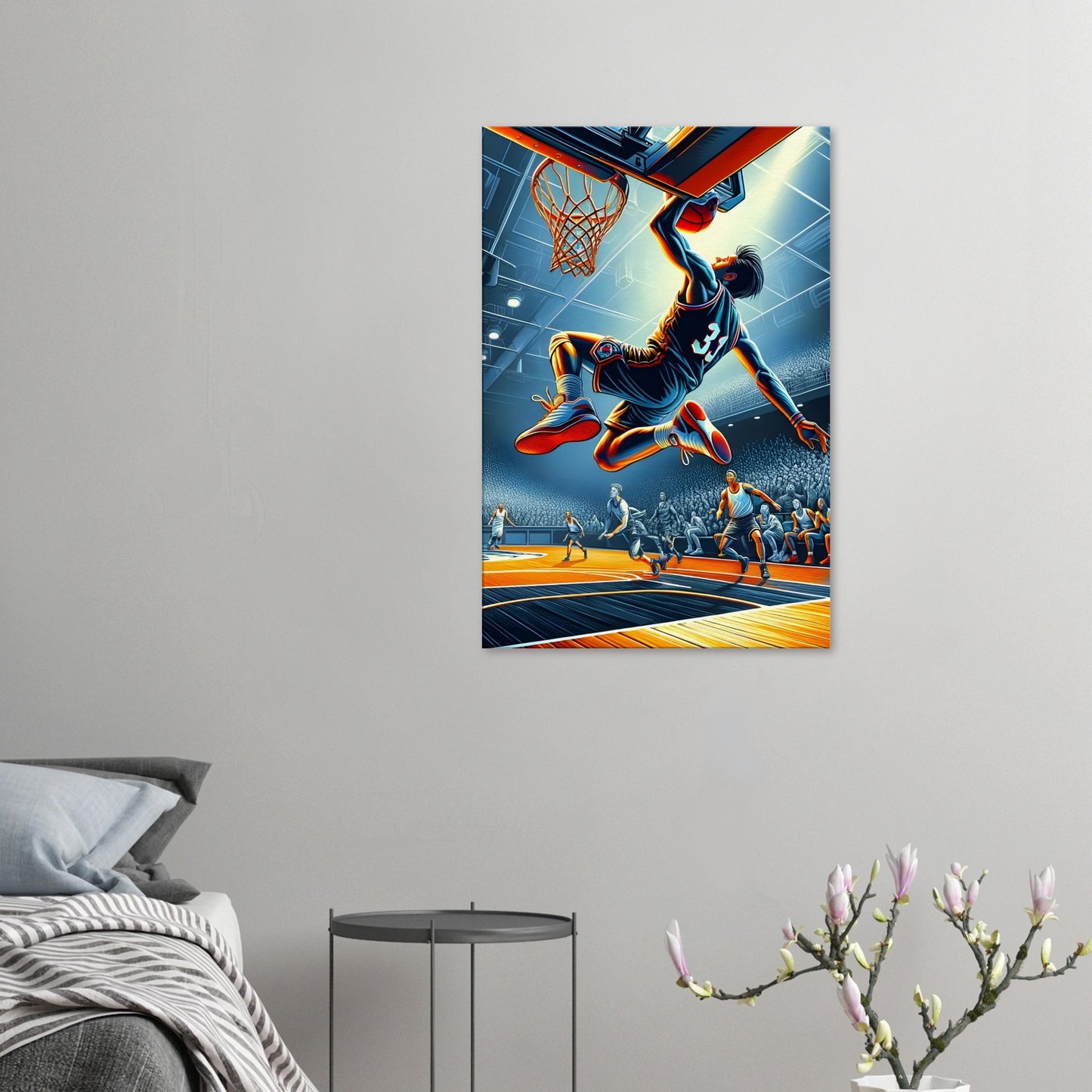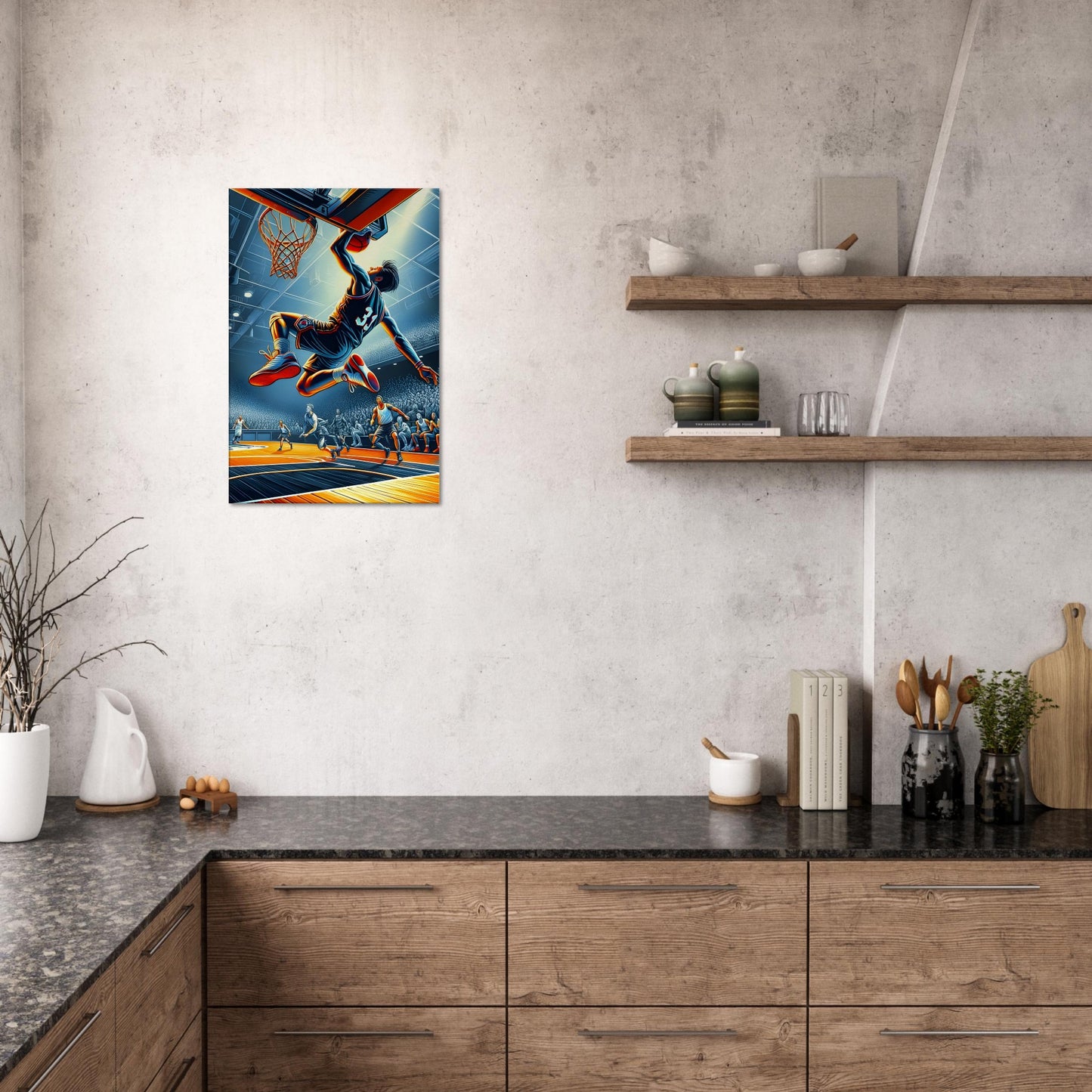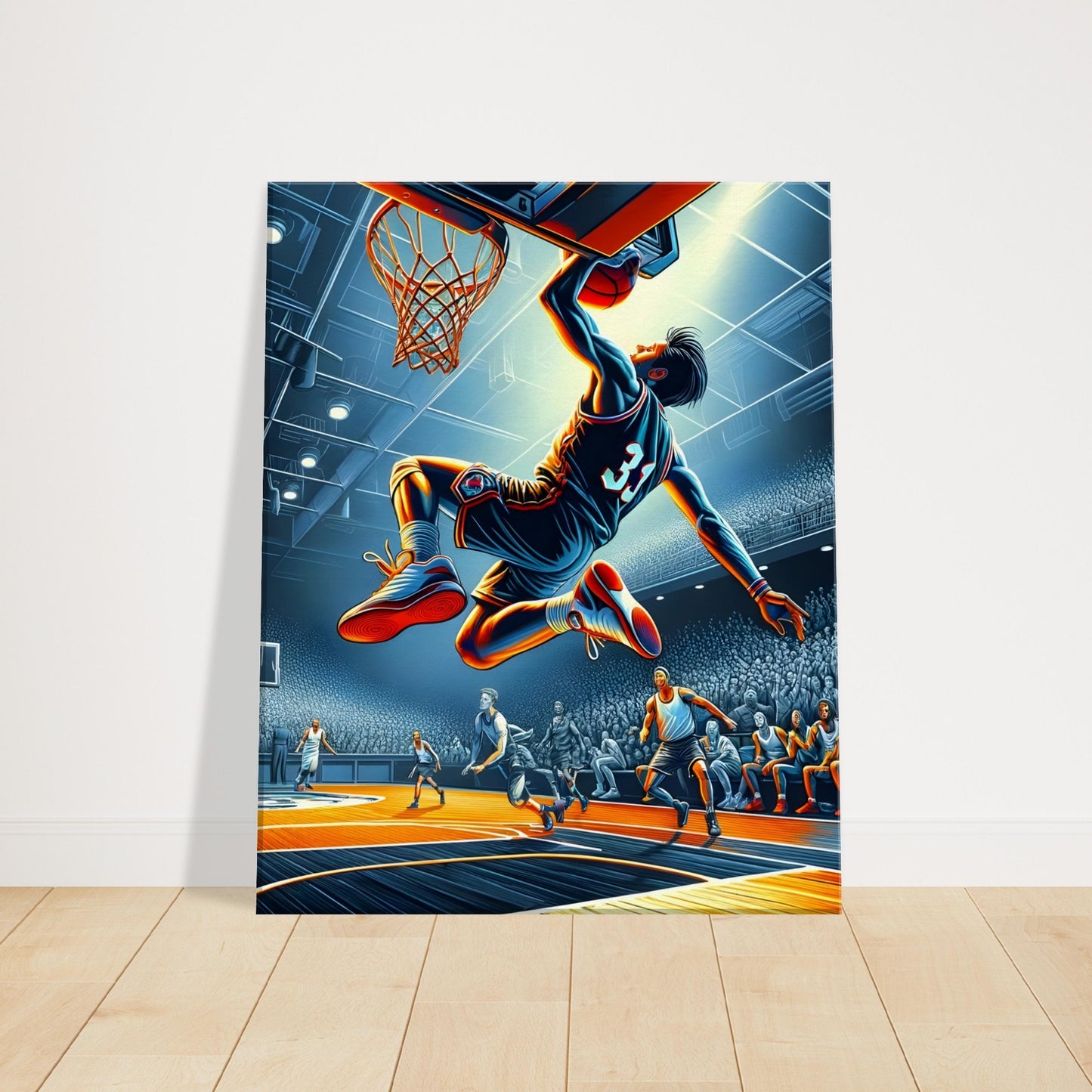 Jump Shot captures the precision, grace, and intensity of basketball at its most poised moment, the instant a player hangs in the air, fully committed to a flawless release. Illuminated by cool, focused lighting that sharpens every contour of the athlete’s form, the artwork draws the eye to the unwavering concentration etched across their face. Beneath, the warm tones of the court add depth and kinetic tension, as the world holds its breath in anticipation. Surrounding players and spectators are rendered with remarkable clarity, amplifying the drama of the scene. Jump Shot is both a tribute to technical mastery and a dynamic visual experience, a striking addition to any space celebrating sport, motion, and the pursuit of excellence.
