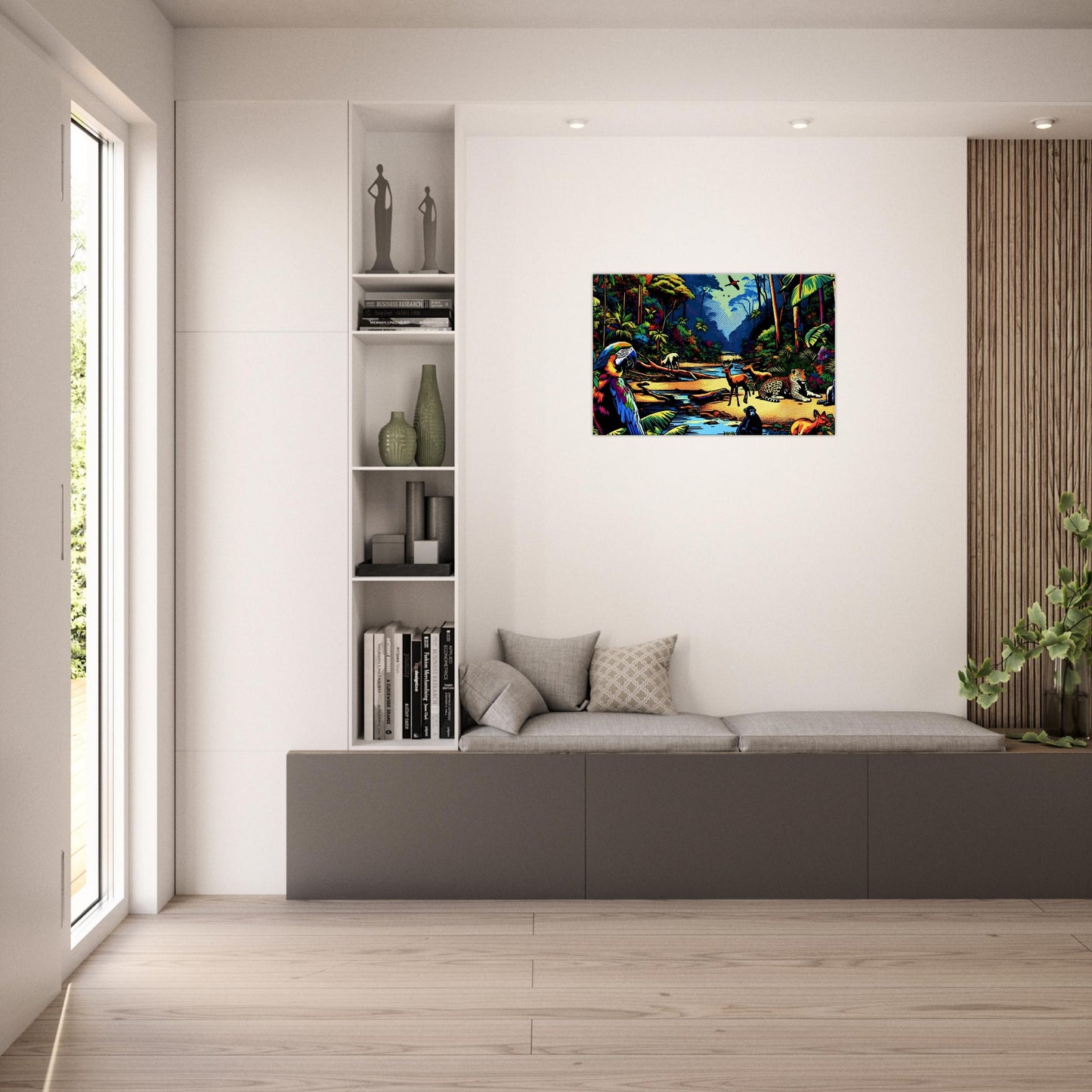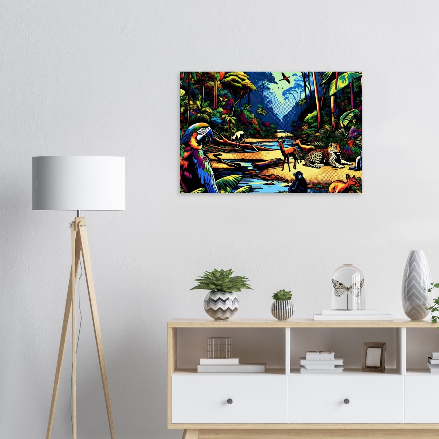 Bring the wild to your walls with Jungle Wildlife – Pop Art, a vibrant and energetic celebration of the rainforest’s untamed spirit. This captivating artwork showcases a brilliantly colored parrot as the focal point, surrounded by a dynamic cast of jungle animals, including a stealthy leopard, a curious primate, and a graceful deer. The dense tropical foliage and soaring trees create a lively setting, while vivid birds in flight add movement and depth. Rendered in bold lines and saturated pop art hues, this piece captures the rhythm and richness of jungle life. Perfect for animal lovers and bold interior spaces, it offers a modern take on wildlife art that commands attention.