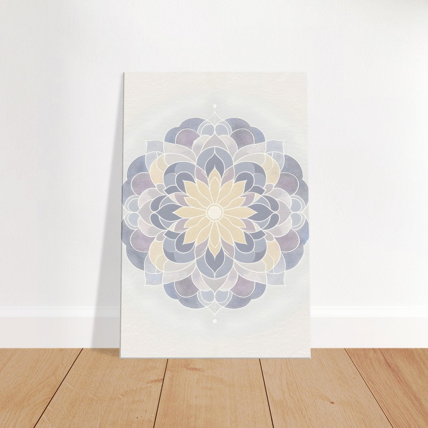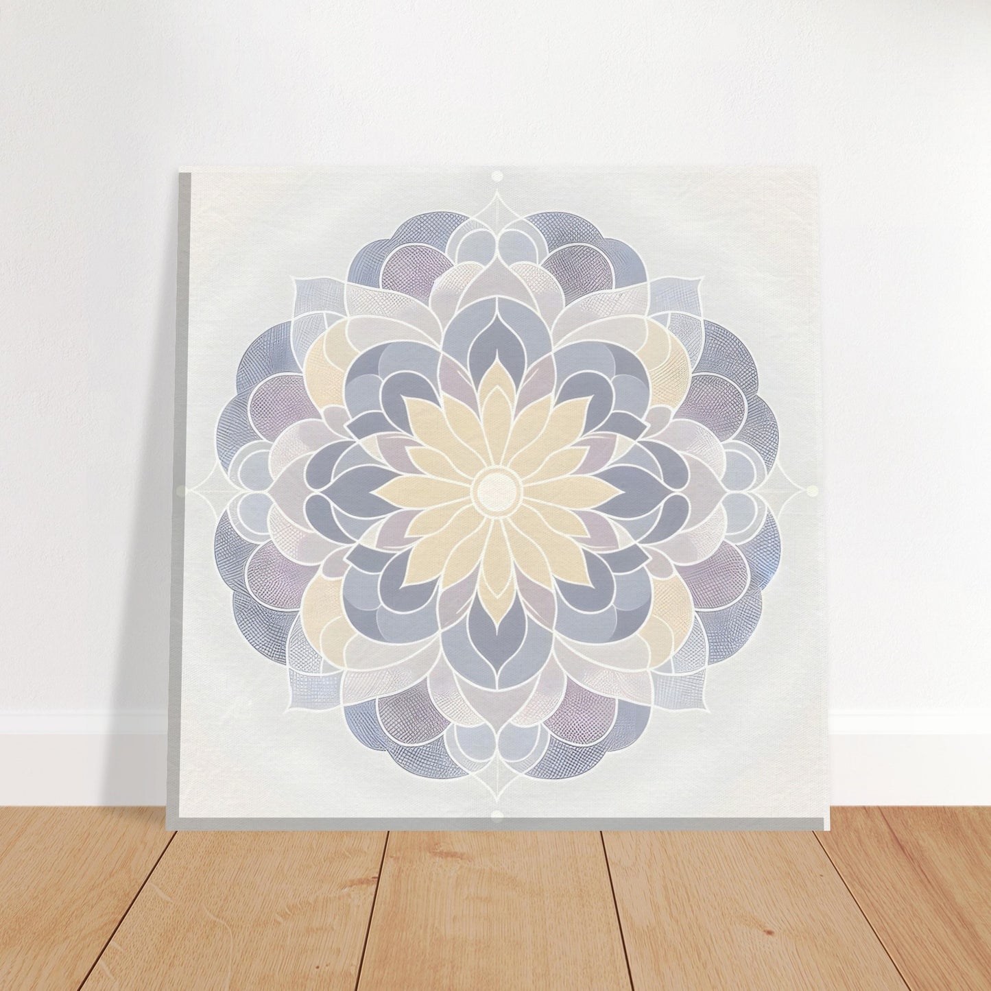 Lavender Grace Mandala is a serene embodiment of minimalist elegance, rendered in a soft, graceful palette of pale lavender, light grey, and a whisper of soft yellow. This tranquil composition invites calm through its gentle balance of form and hue, with each color thoughtfully selected to enhance the mandala’s delicate symmetry. The result is a visual experience that is both soothing and refined, perfect for interiors that embrace subtle sophistication.