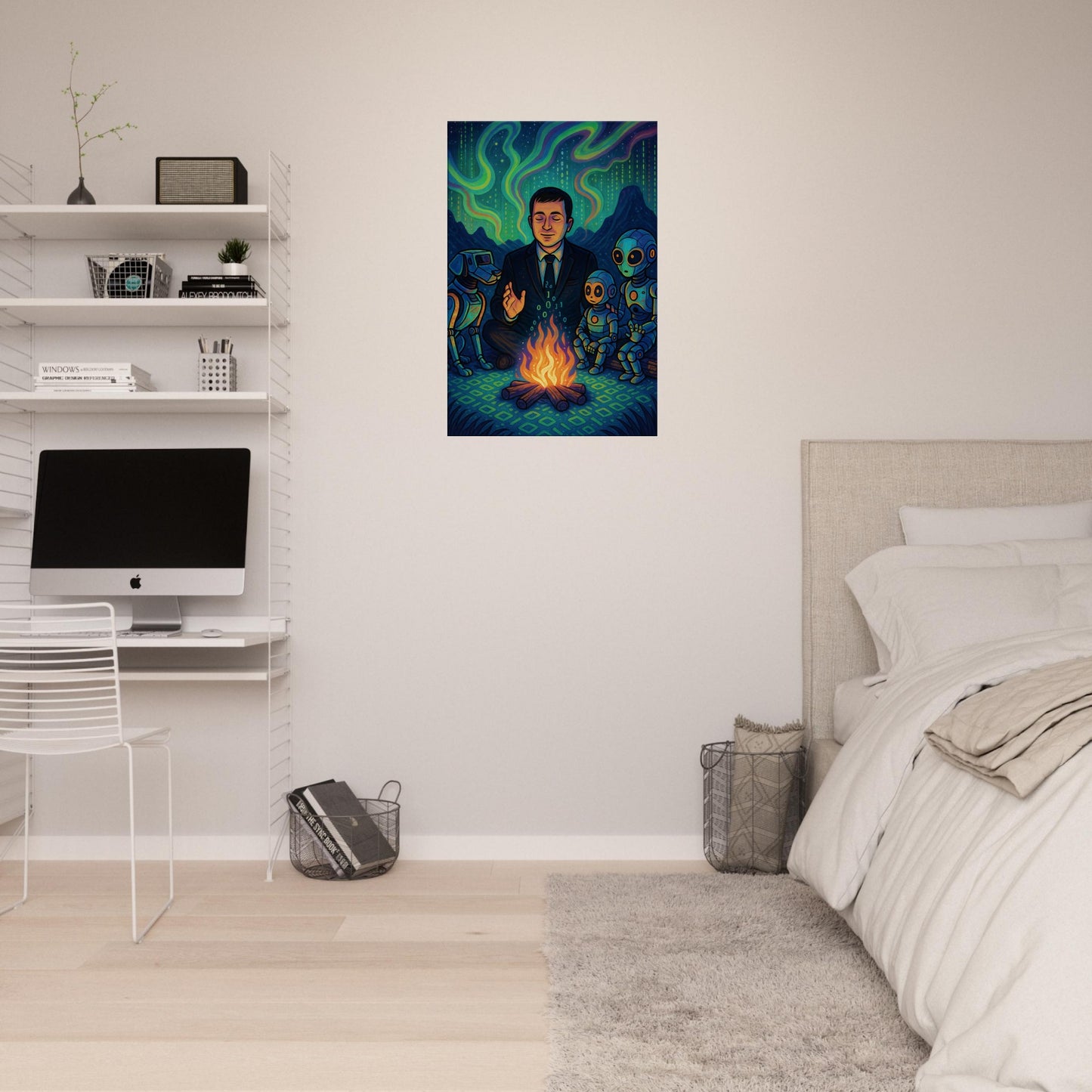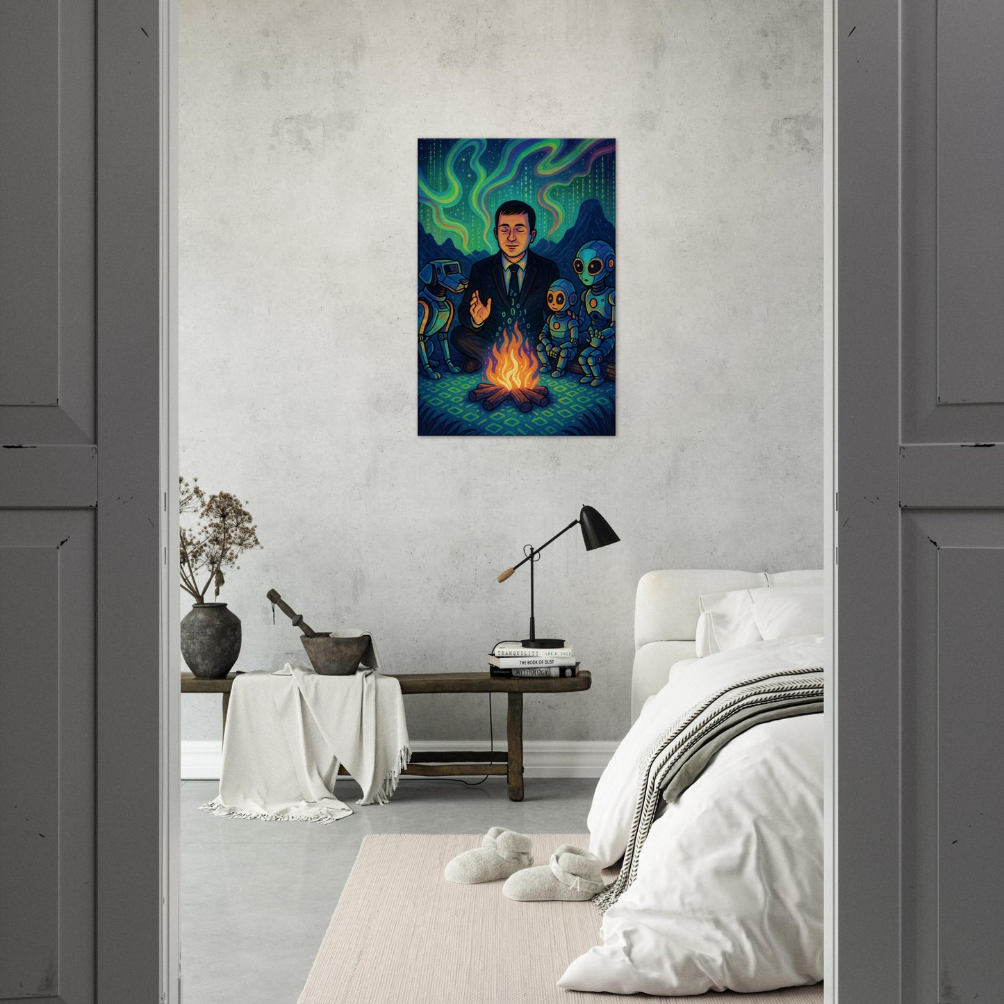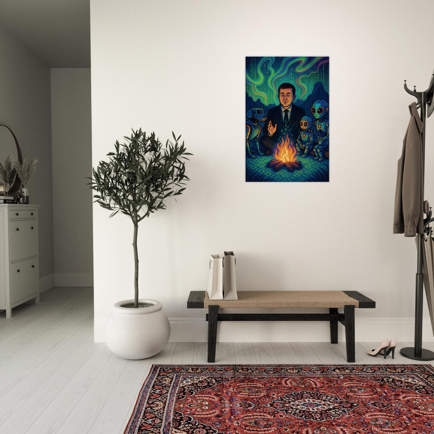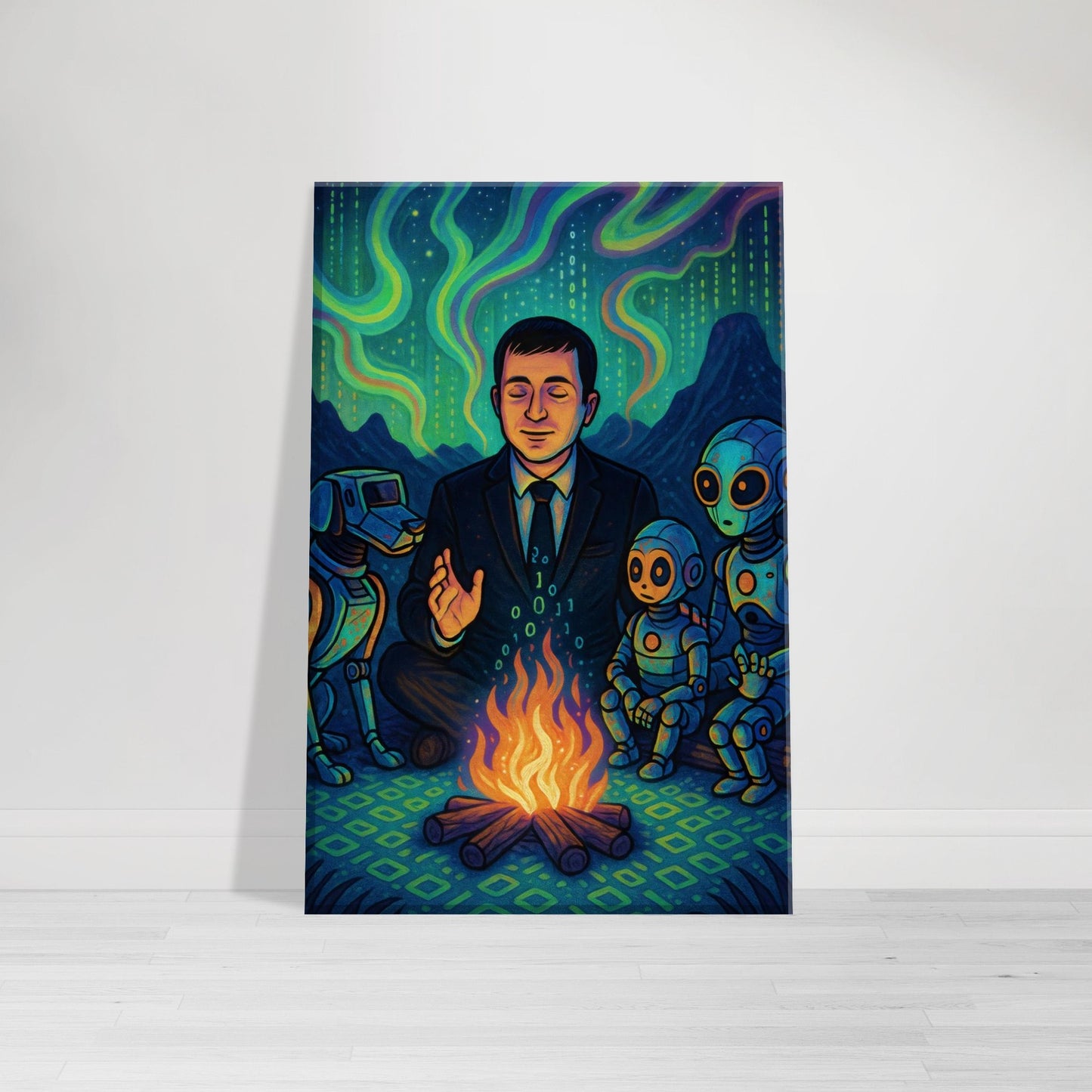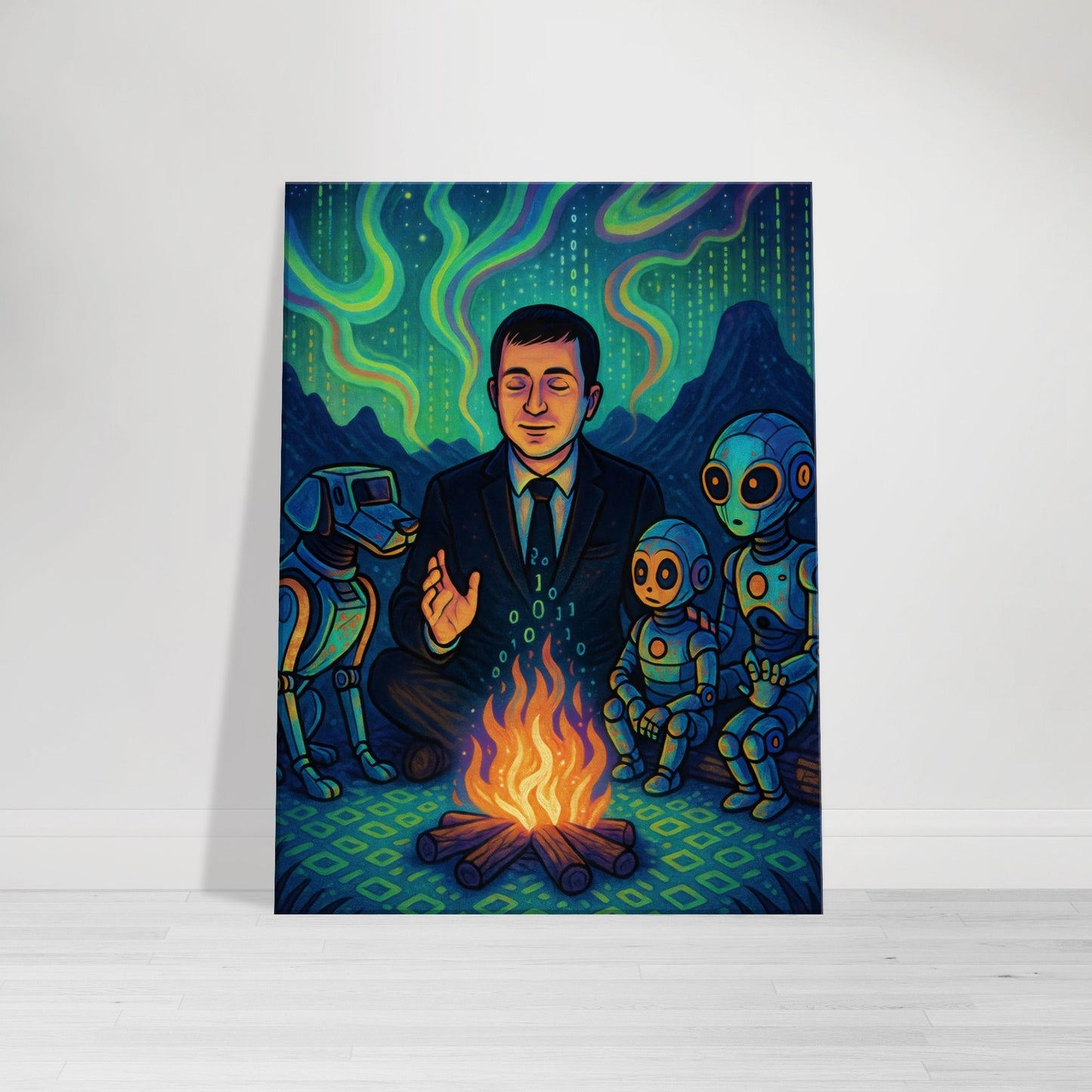 A black suit, a silent stare, and a campfire made of binary code — “Lex Fridman’s Robotic Campfire Stories” is pure cold-brewed philosophy. Lex sits under neon auroras, telling bedtime tales to robot dogs and AI toddlers, like it’s the most normal thing in the world.