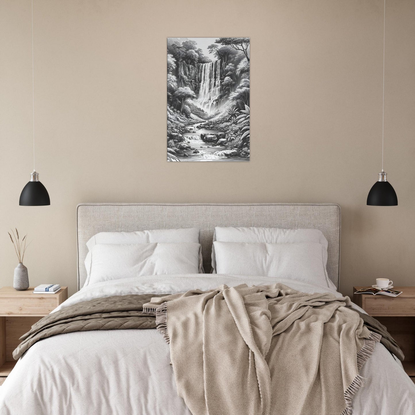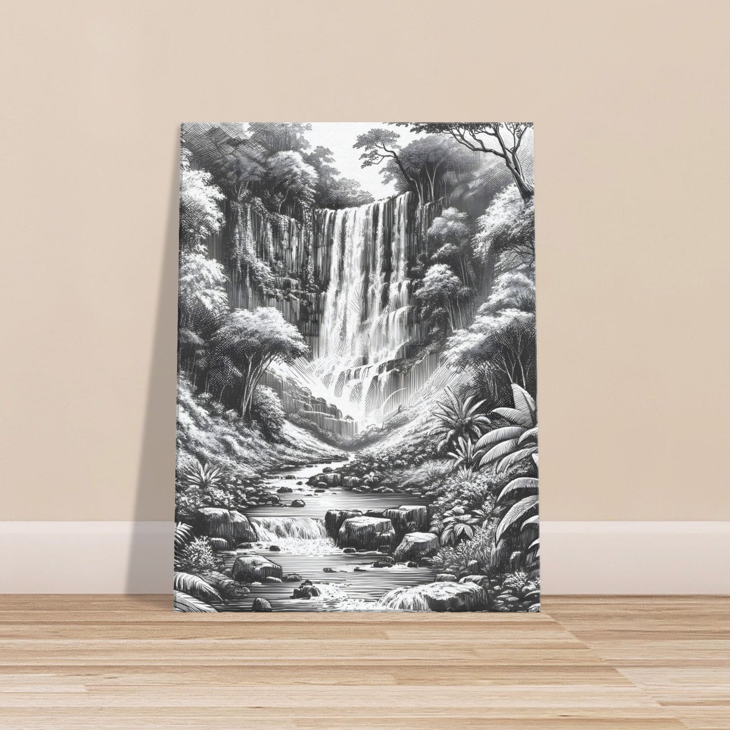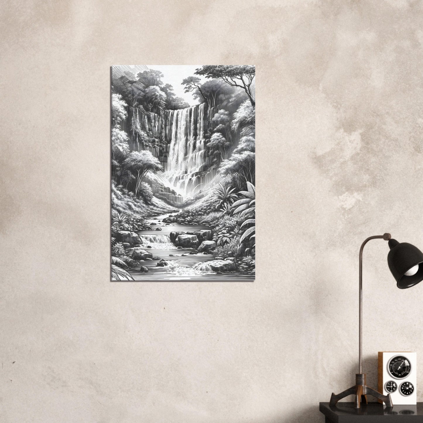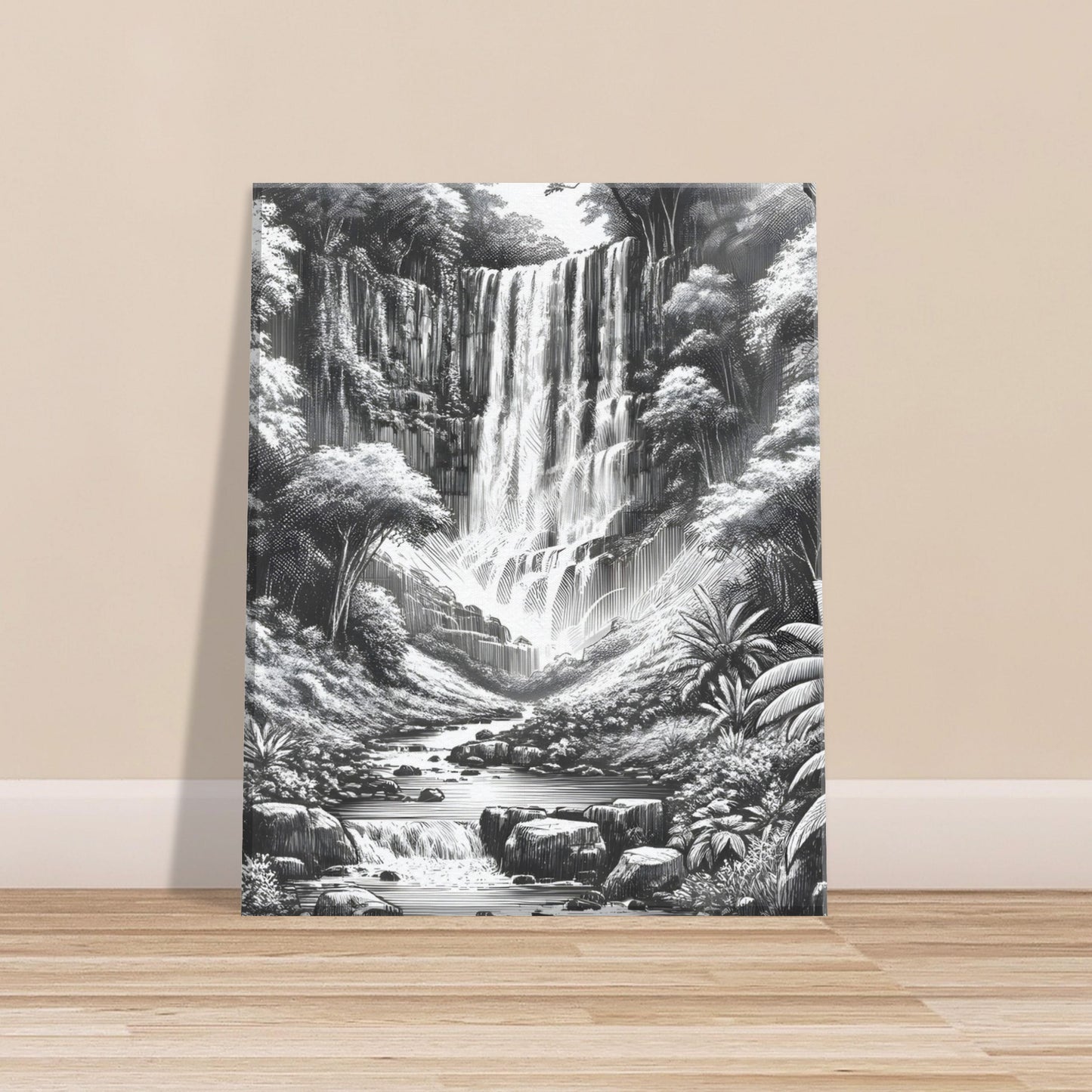 Bring the power and serenity of nature into your space with Majestic Waterfall Sketch, a finely detailed black-and-white artwork that captures the grandeur of a jungle waterfall. Towering cascades plunge into a tranquil pool below, framed by intricately sketched tropical foliage and rocky terrain. The flowing lines and contrast-rich shading evoke a sense of movement and depth, offering a peaceful yet powerful visual experience. Ideal for nature lovers, this piece adds a touch of wild elegance to any room.