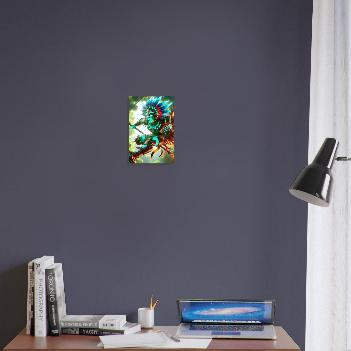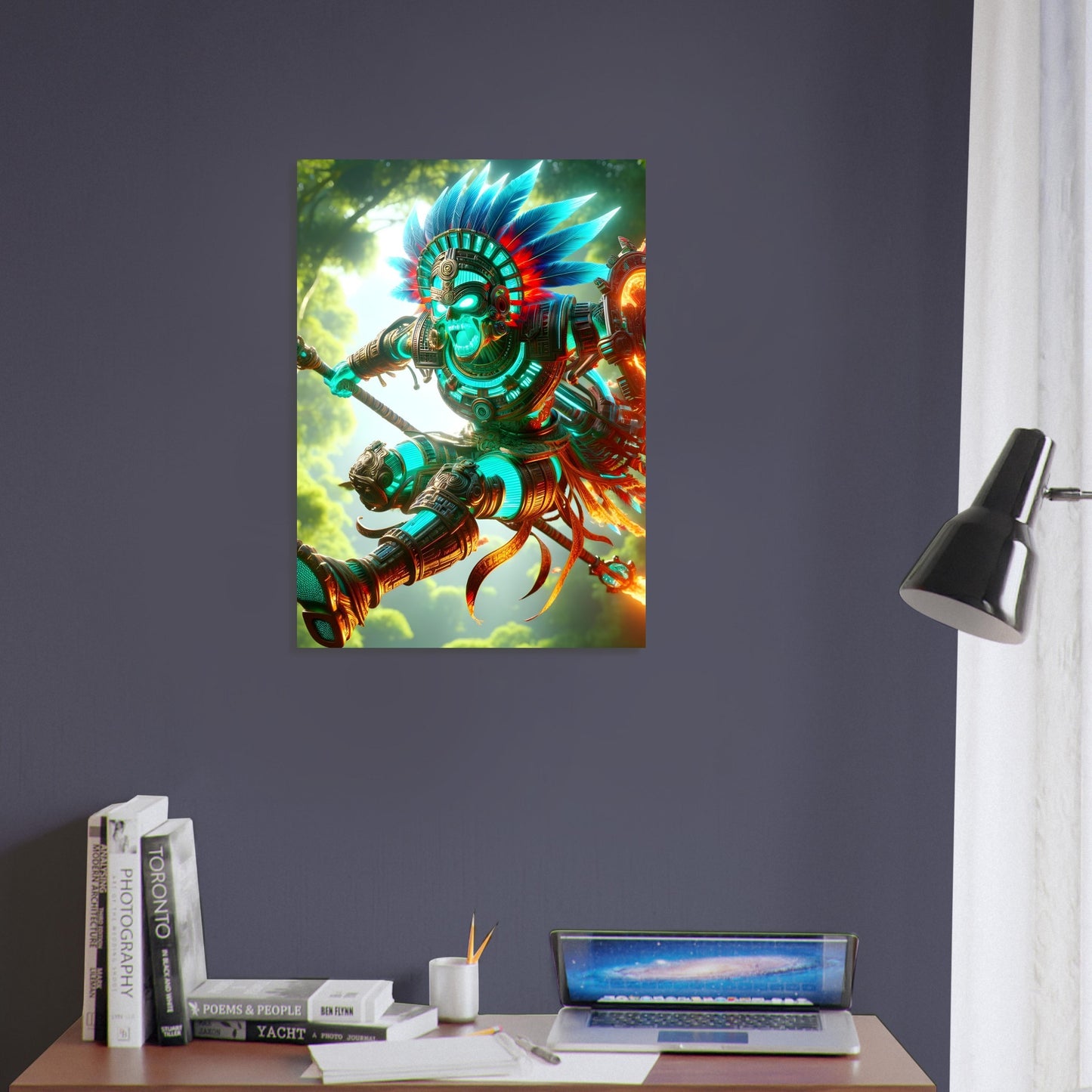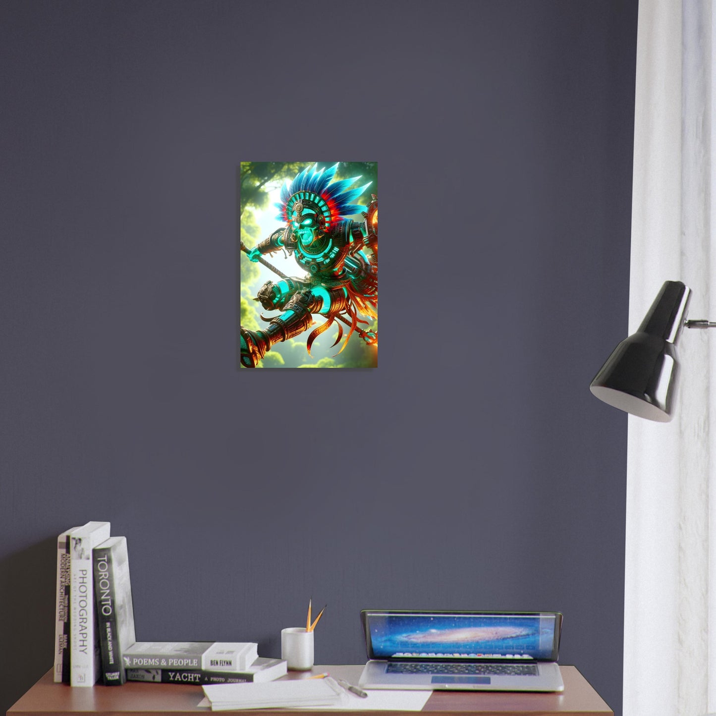 Unleashing the primal spirit of a lost empire, Mayan Jungle Fury immortalizes a warrior of the ancient world in a moment of explosive power. Leaping through the thick, verdant canopy with spear poised and shield drawn, the Mayan warrior burns with purpose—his armor ablaze in brilliant turquoise and searing red. The surrounding jungle teems with energy, every leaf and shadow alive with tension as nature bears witness to the fury of battle. Vines curl, mist swirls, and sunlight filters through the dense foliage, illuminating the figure like a god of war descended from legend. His eyes lock forward, focused and unyielding—a symbol of fierce protection and ancestral strength. Printed on premium magnetic metal, Mayan Jungle Fury brings ancient valor and raw elemental force into stunning, modern form.