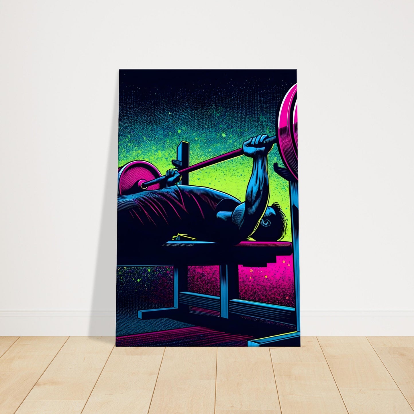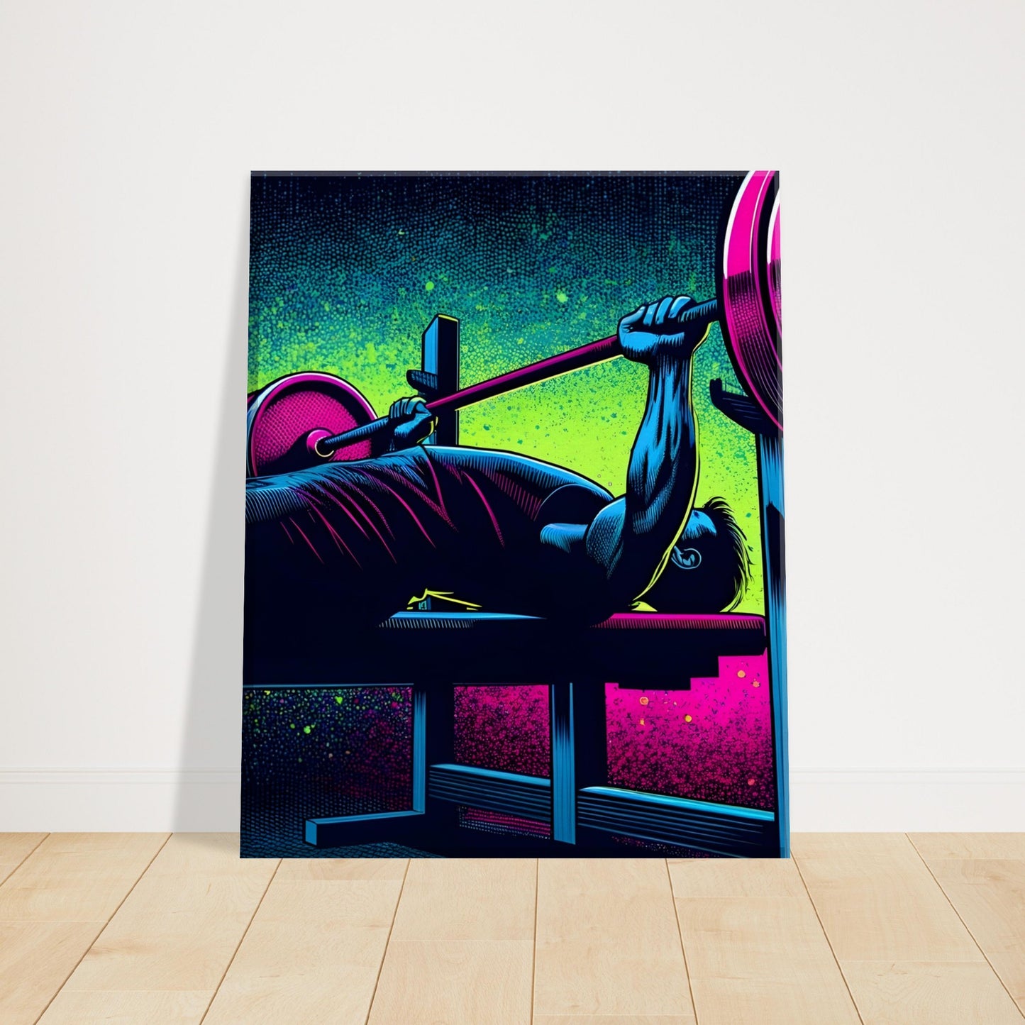 Unleash the raw power of the bench press with “Midnight Bench,” a bold pop art canvas that captures the intensity of this foundational lift. Set in a shadowy gym scene, the lifter is depicted mid-press, driving a heavily loaded barbell upward. Neon pink and electric green highlights cut through the darkness, accentuating muscle definition and the dramatic energy of the movement.