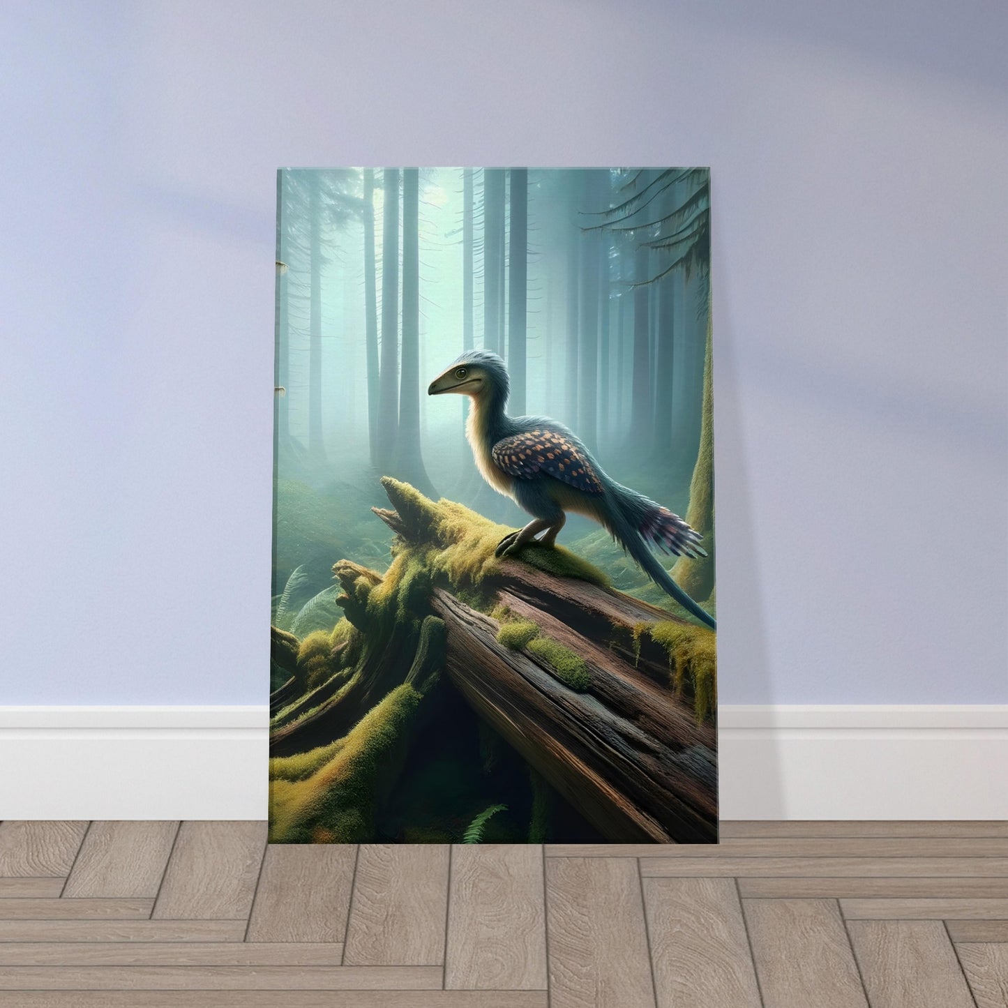 Mystic Forest Whisperer captures a rare, contemplative moment in prehistory—a small, bird-like dinosaur poised in stillness amid the ethereal mist of an ancient forest. Adorned in vibrant plumage and depicted with exquisite detail, the creature stands alert and curious, its presence harmonizing with the rich tapestry of ferns, moss, and towering trees. Soft light filters through the haze, creating a dreamlike atmosphere that invites quiet reflection on the fragile beauty and interconnectedness of prehistoric life. This piece blends scientific inspiration with artistic serenity, making it ideal for natural history lovers, thoughtful collectors, or any space that values storytelling through subtlety and grace. Printed on premium-quality canvas and ready to hang, Mystic Forest Whisperer brings a sense of wonder and timeless elegance to your decor.