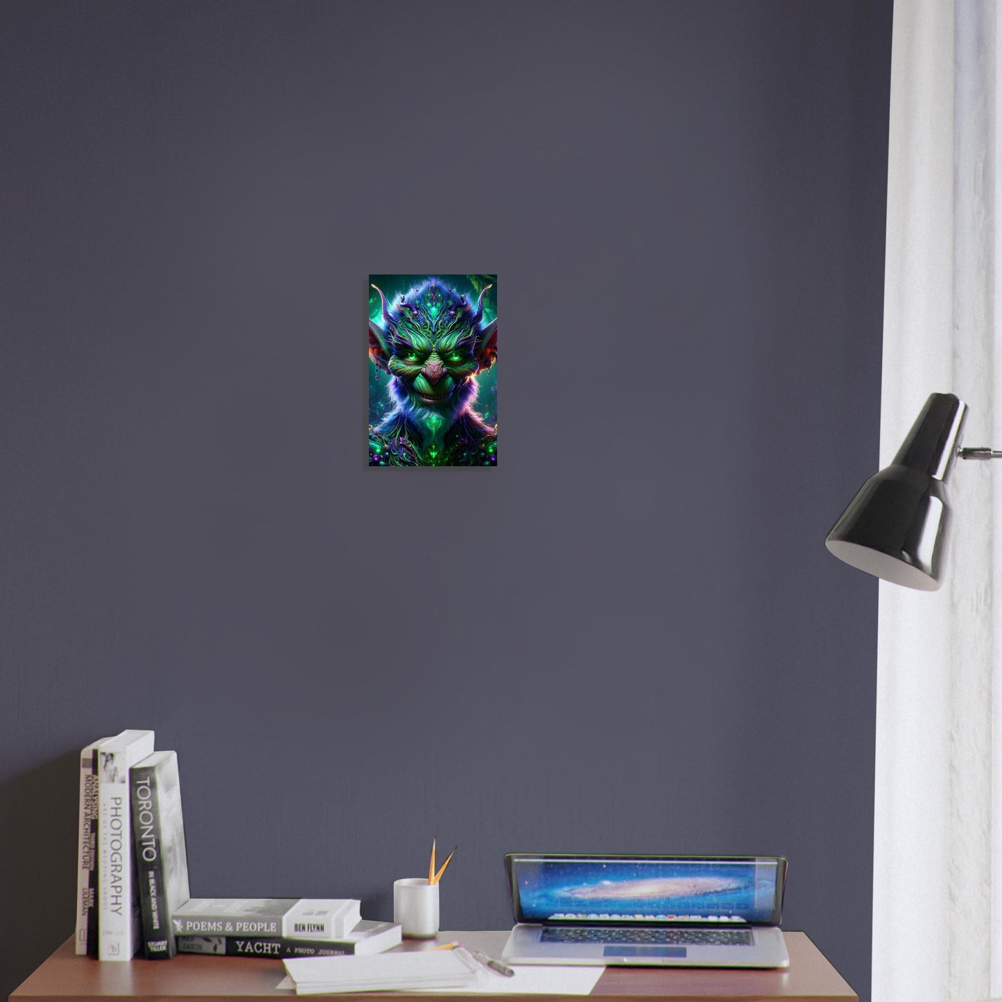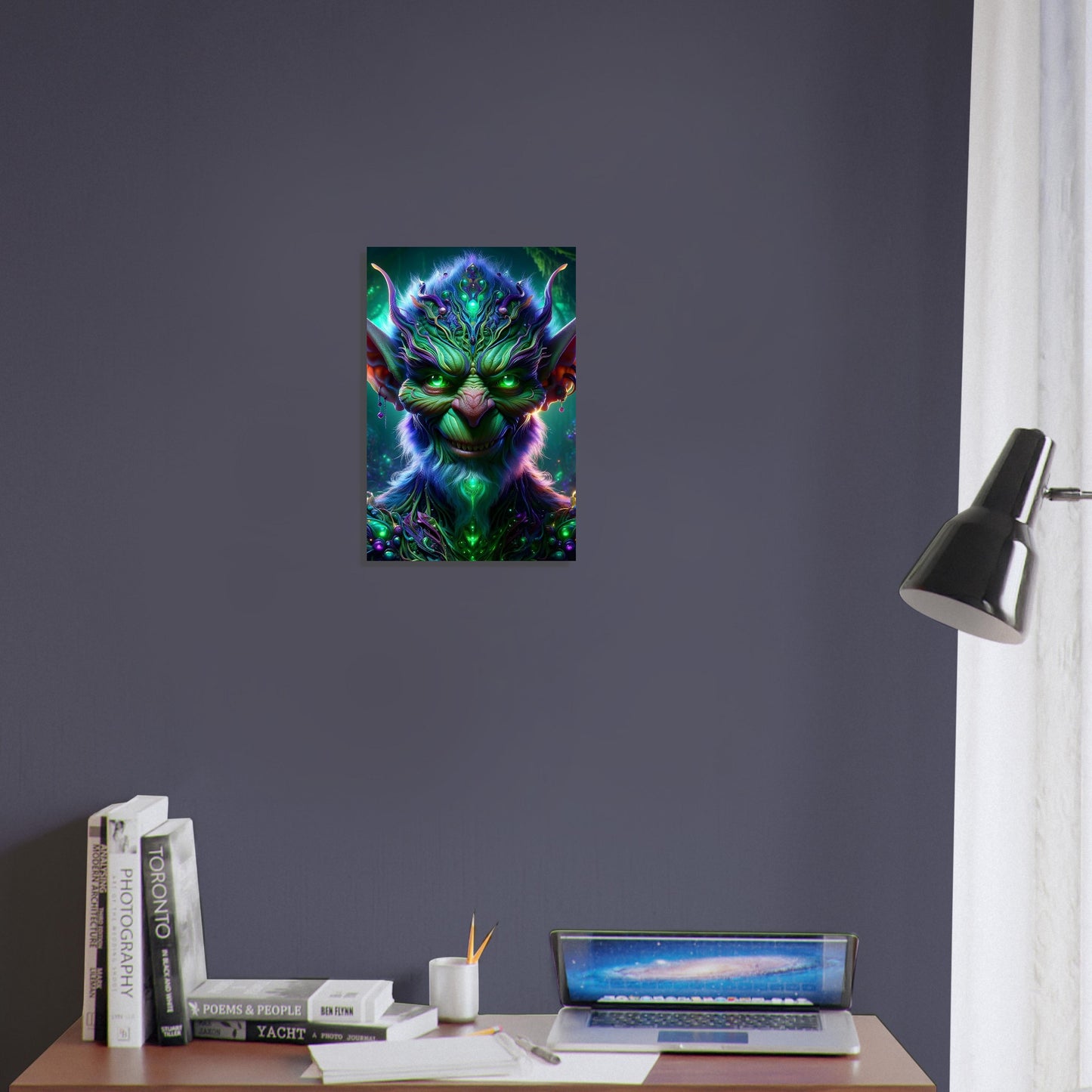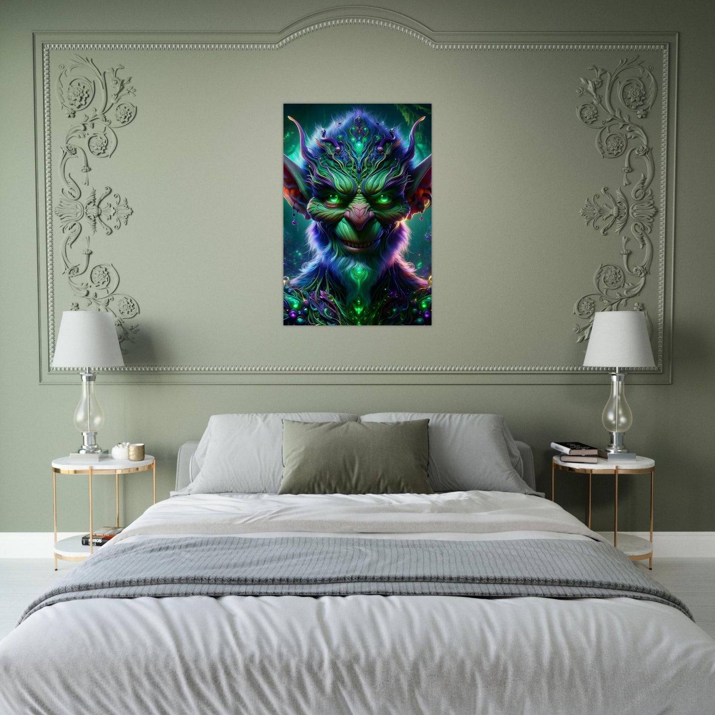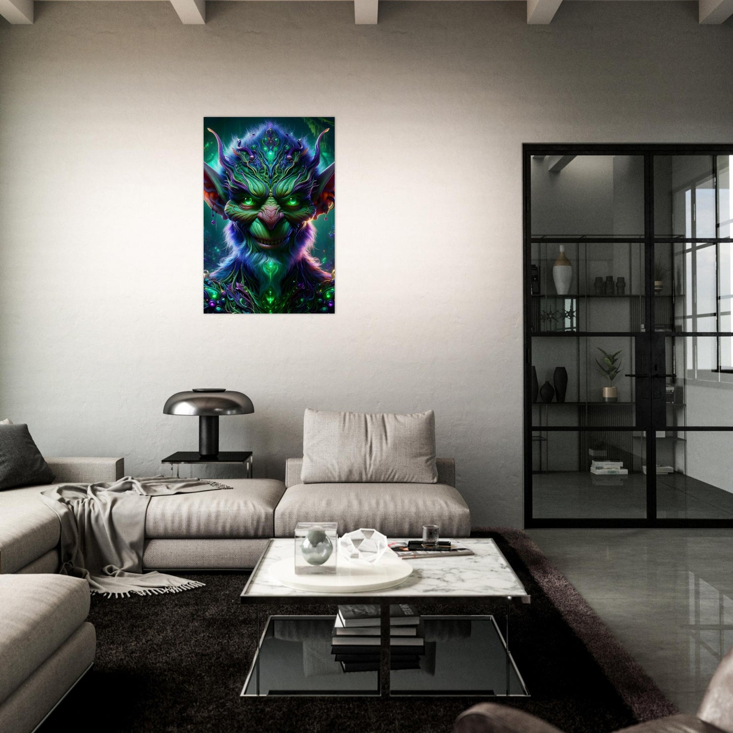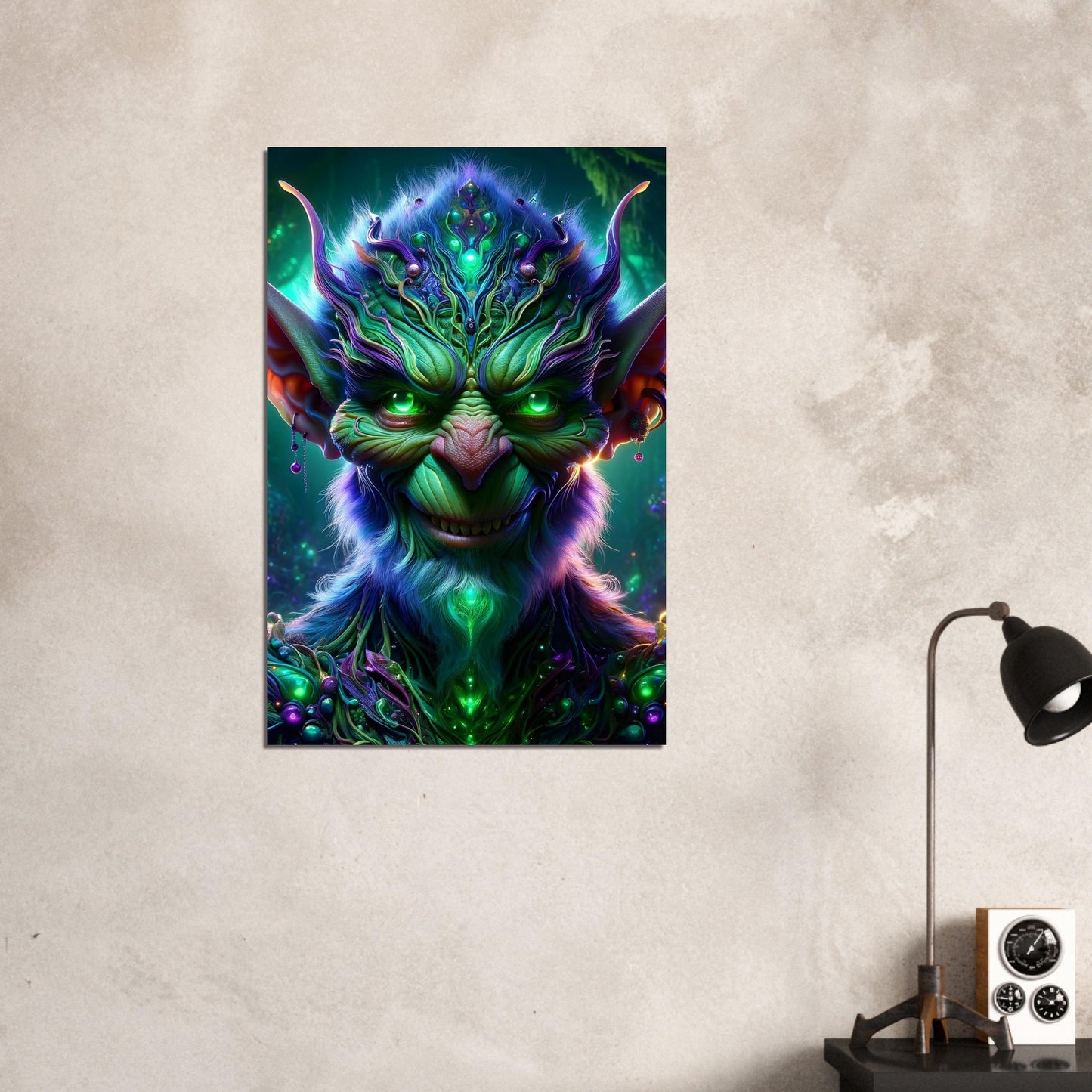 Cunning and cloaked in enchantment, Mystic Shadow unveils the elusive Goblin in a glow-infused vision of mischief, magic, and mystery—now rendered in vivid detail on a sleek, ultra-HD metal poster. With sharp, angular features curved into a sly grin and glowing green eyes that gleam with untold secrets, this mystical creature comes to life beneath the shadows of an enchanted forest. Its deep emerald skin is laced with accents of violet and midnight blue, as if woven from the very magic of the woodland itself.