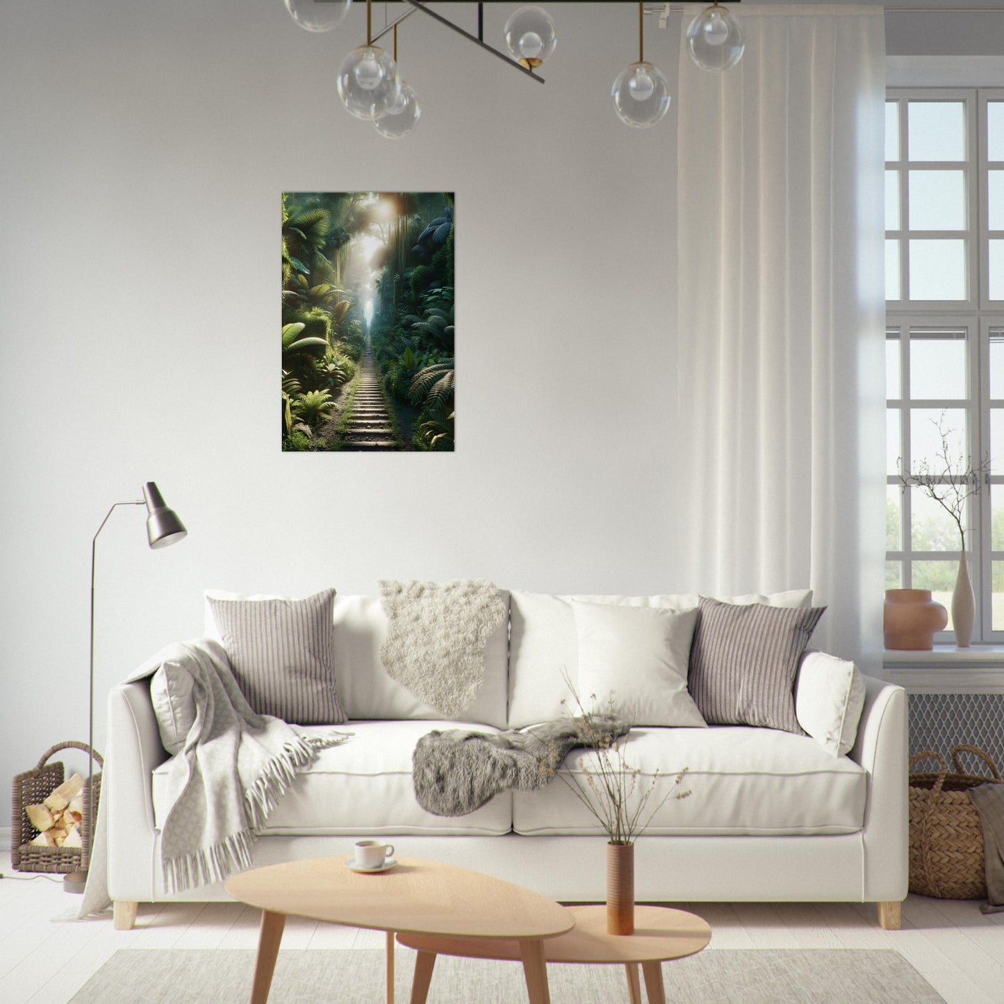 Step into the heart of the tropics with Narrow Jungle Walkway, a mesmerizing artwork that captures the intimate beauty of a lush rainforest path. Surrounded by dense foliage, vibrant ferns, and towering trees, the walkway is softly illuminated by sunlight filtering through the canopy above. This piece evokes a sense of peaceful exploration and wonder, making it a perfect addition to any space seeking a connection to nature's untamed charm. Ideal for creating a tranquil atmosphere in your home or office.