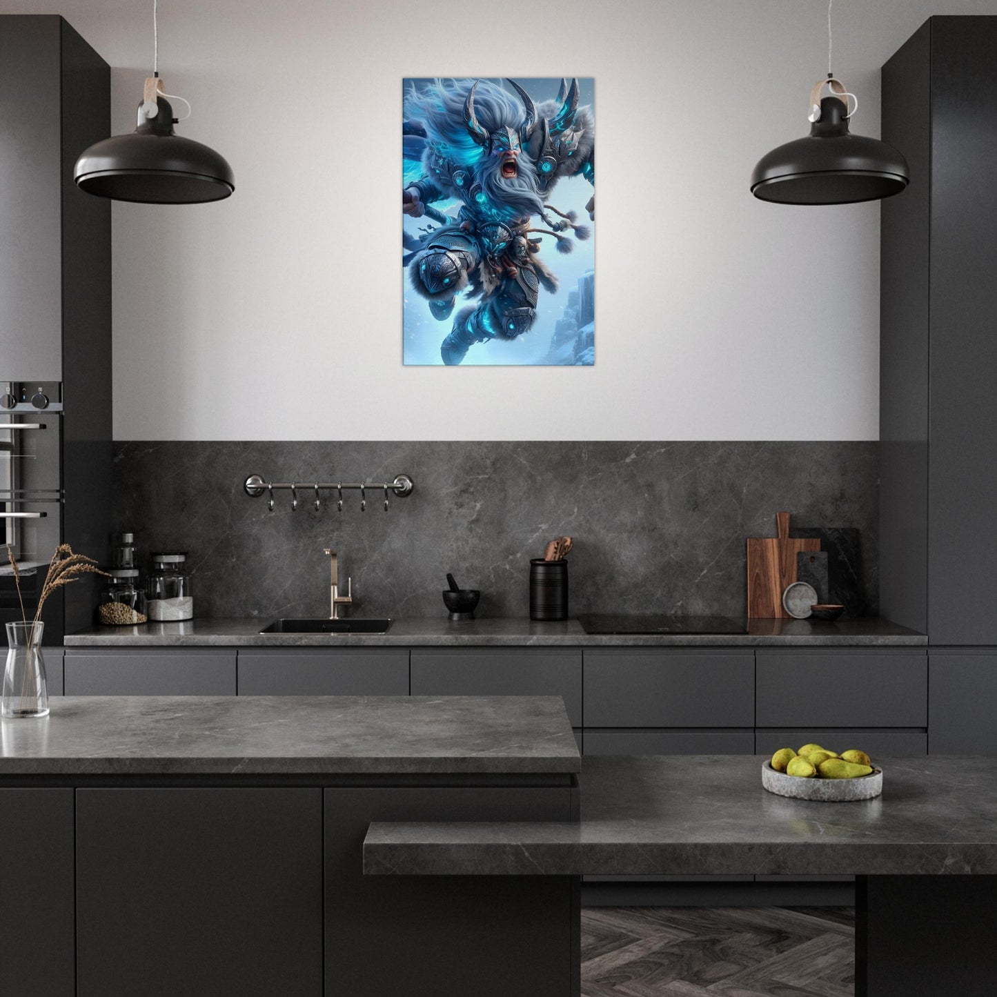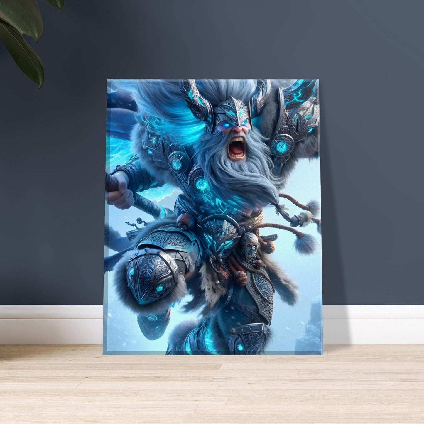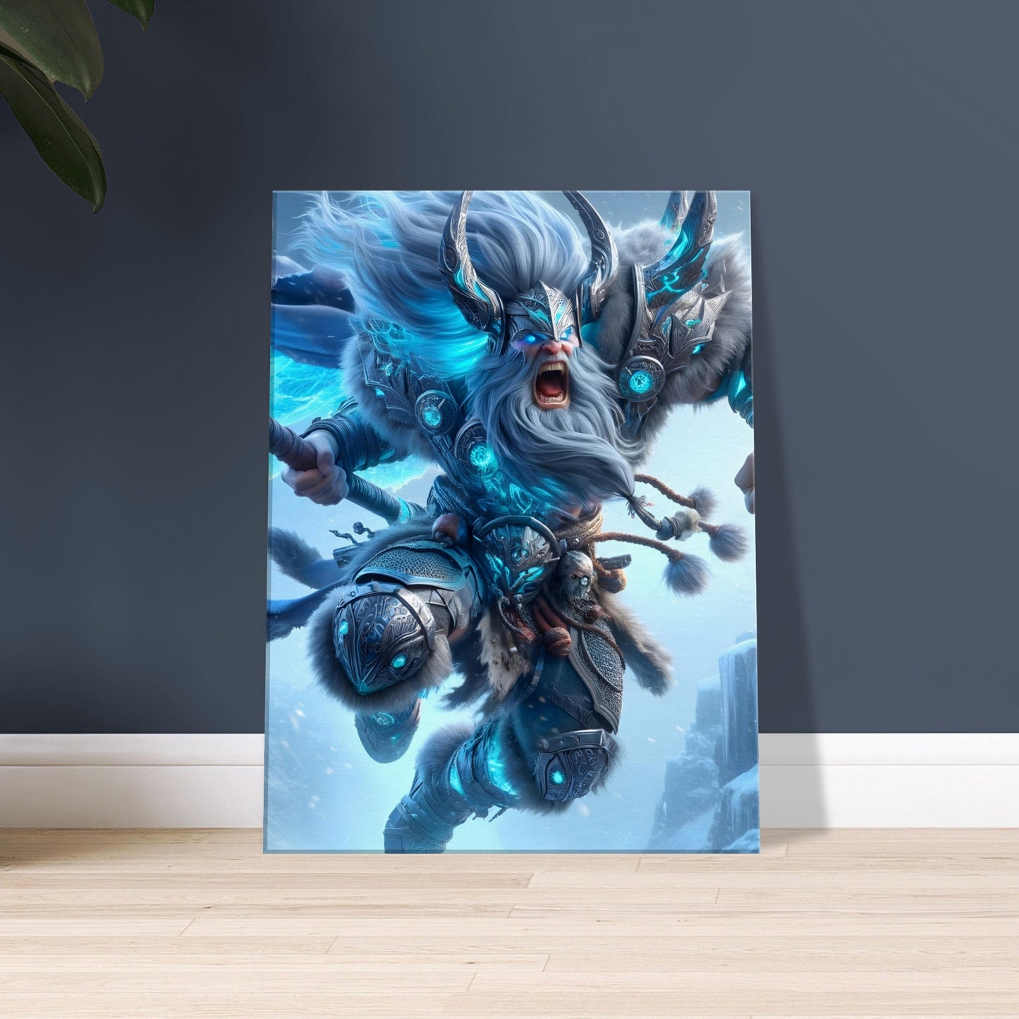 Untamed and thunderous, Norse Berserker’s Winter Wrath captures the primal fury of a Viking warrior in mid-air, locked in a savage battle cry as he descends with axe raised. His fur-lined armor shimmers with icy blue and metallic grey, reflecting the frigid rage of the storm-swept Nordic wilderness behind him. Snow swirls in chaos as his fierce presence dominates the canvas—raw, fearless, and unstoppable. Every detail, from the frozen breath on his lips to the wild fire in his eyes, speaks of a warrior forged in ice, war, and legend. Printed on premium canvas, Winter Wrath is more than a battle scene—it’s a portrait of unleashed power and mythic intensity.