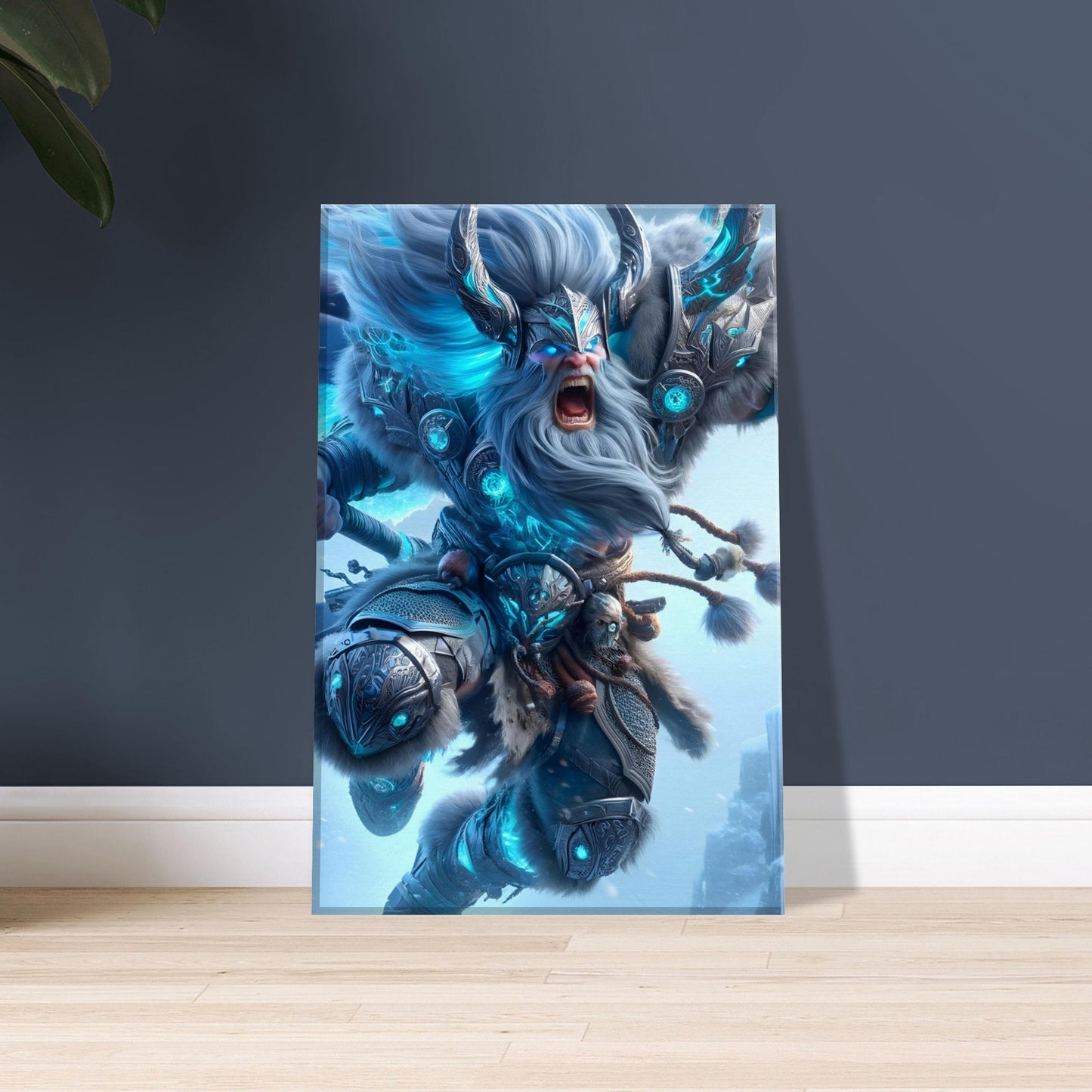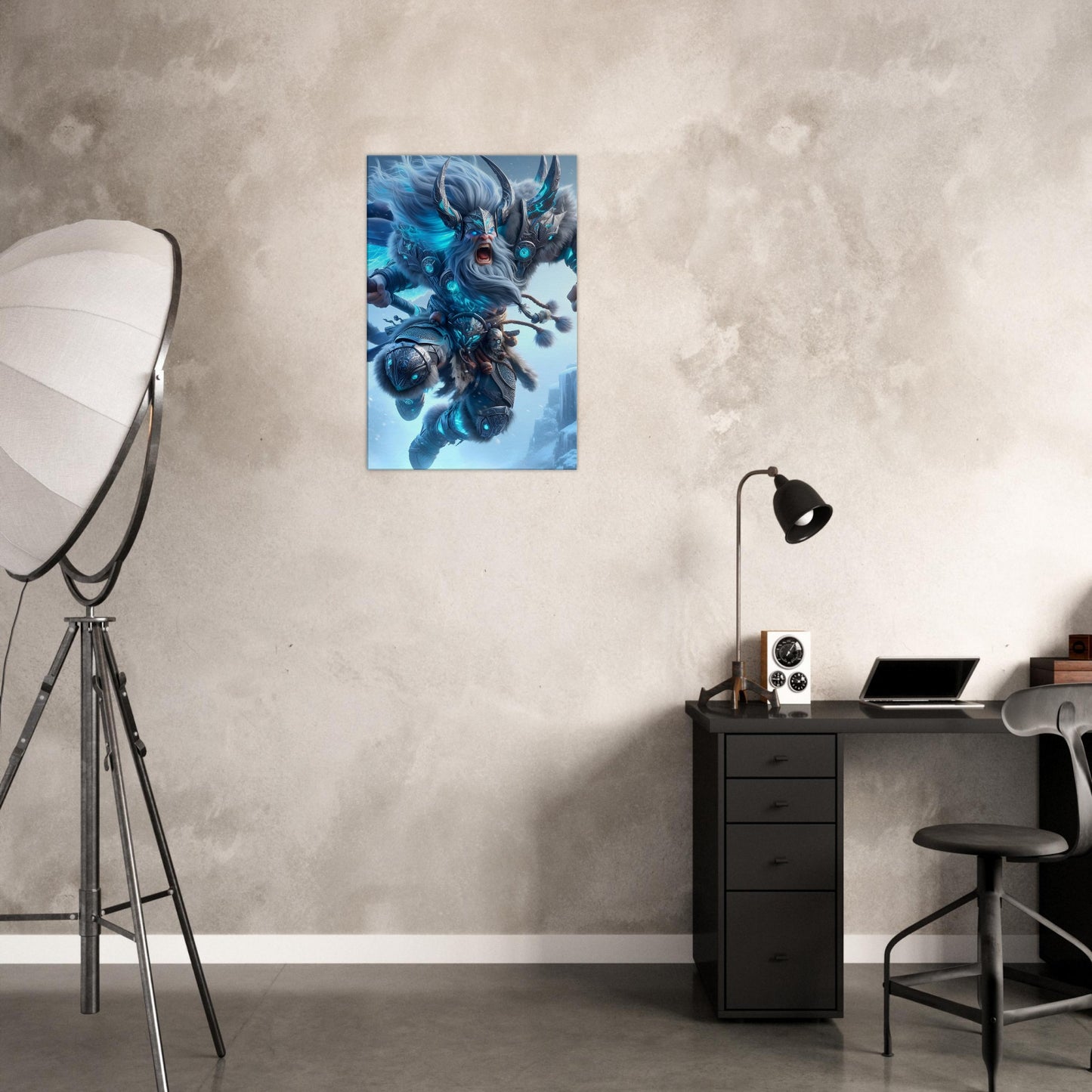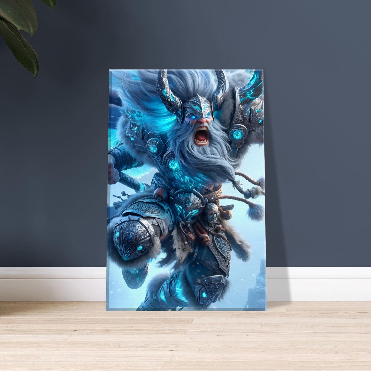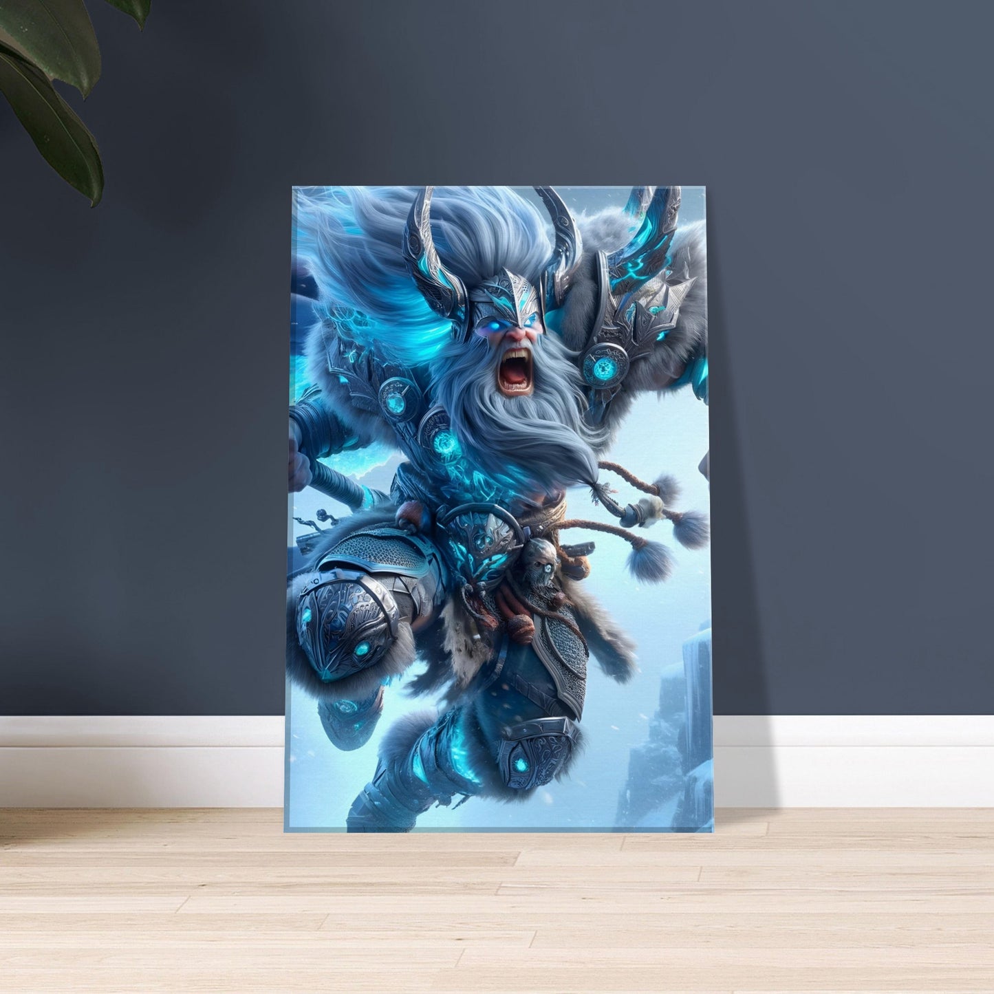 Untamed and thunderous, Norse Berserker’s Winter Wrath captures the primal fury of a Viking warrior in mid-air, locked in a savage battle cry as he descends with axe raised. His fur-lined armor shimmers with icy blue and metallic grey, reflecting the frigid rage of the storm-swept Nordic wilderness behind him. Snow swirls in chaos as his fierce presence dominates the canvas—raw, fearless, and unstoppable. Every detail, from the frozen breath on his lips to the wild fire in his eyes, speaks of a warrior forged in ice, war, and legend. Printed on premium canvas, Winter Wrath is more than a battle scene—it’s a portrait of unleashed power and mythic intensity.