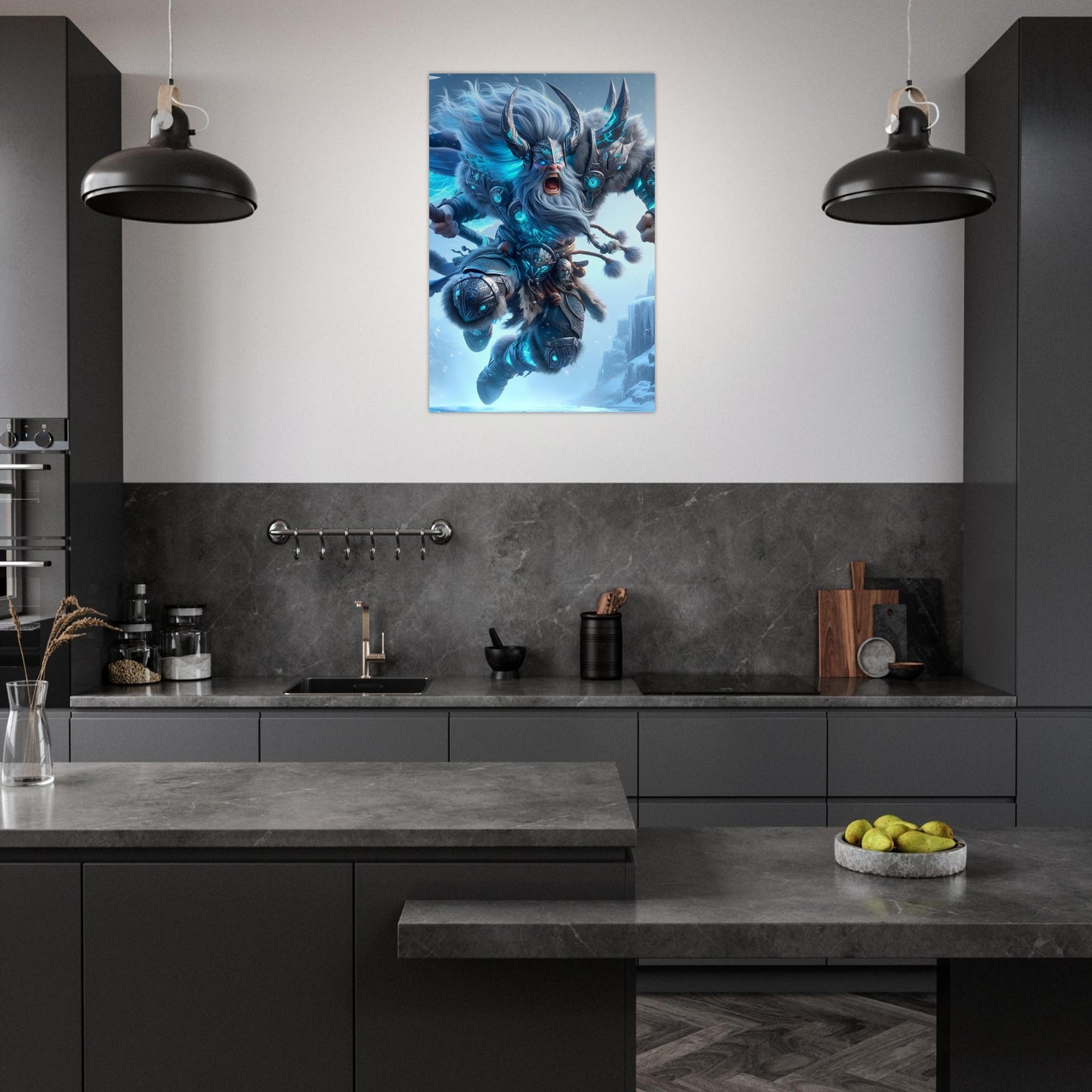 Unleashed from the depths of Nordic legend, Norse Berserker's Winter Wrath captures a moment of primal fury suspended in the frozen breath of battle. The warrior—a fearsome Berserker—erupts through the snow-laden sky in a savage airborne assault, battle axe raised, eyes ablaze with unrelenting rage. His armor gleams in glacial blue and storm-worn metallic grey, mirroring the icy landscape beneath him, where wind and war howl as one. Snow whips around his form, caught in the momentum of his leap, as if the very storm answers his call. Every detail, from the tension in his muscles to the snarl of his cry, pulses with the spirit of the old gods. Printed on sleek magnetic metal, this piece is a tribute to chaos, strength, and the raw force of winter-born valor.