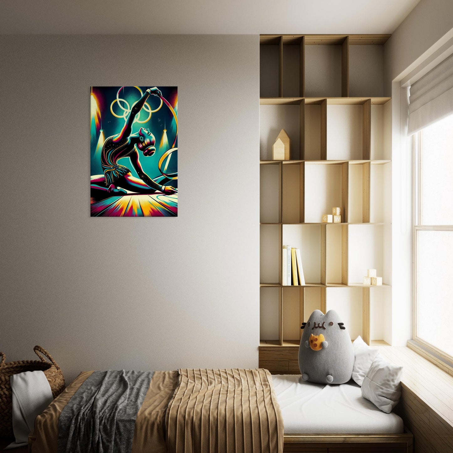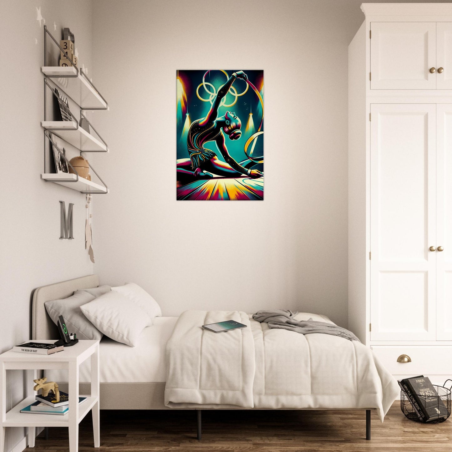 Rhythmic Gymnastics is a radiant celebration of movement as art, capturing the spellbinding elegance of a gymnast suspended in perfect harmony. With fluid lines and luminous swirls of color, the canvas evokes a sense of lyrical motion, where athletic precision meets balletic grace. The athlete flows effortlessly with her apparatus, each curve and arc a testament to control, rhythm, and artistic expression. Vivid hues and soft light trails accentuate the delicacy of the performance, turning this piece into visual poetry. A homage to a discipline that blends choreography with competition, Rhythmic Gymnastics enchants any space with its aura of refinement and creativity. Ideal for dancers, dreamers, or anyone who finds beauty in form and finesse.