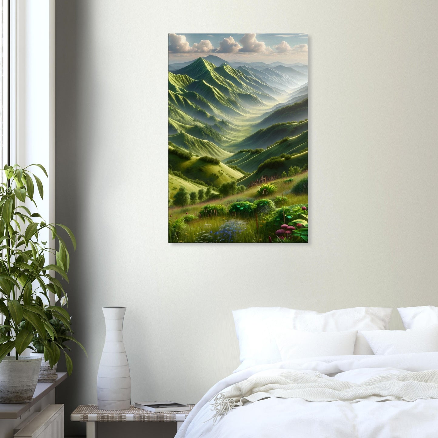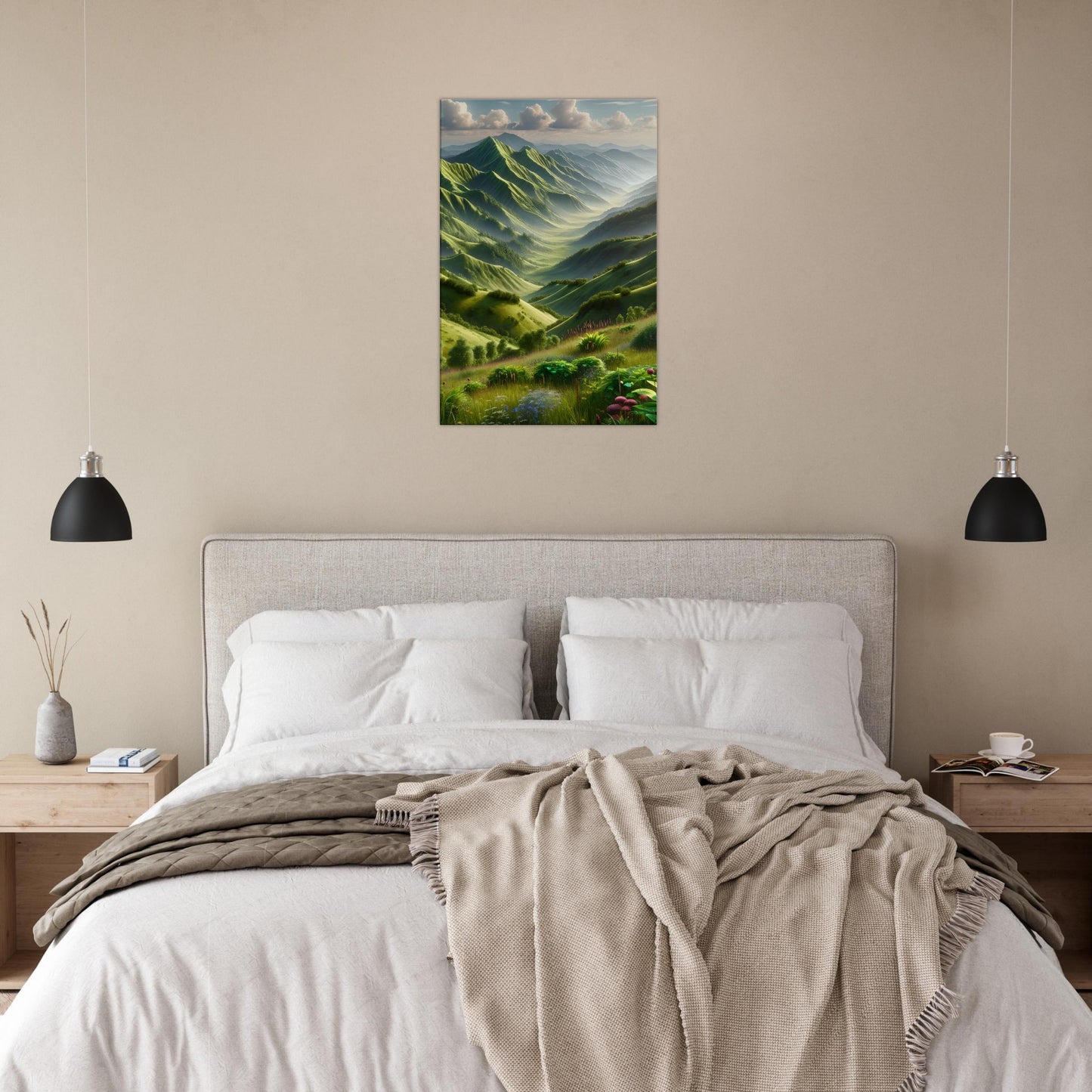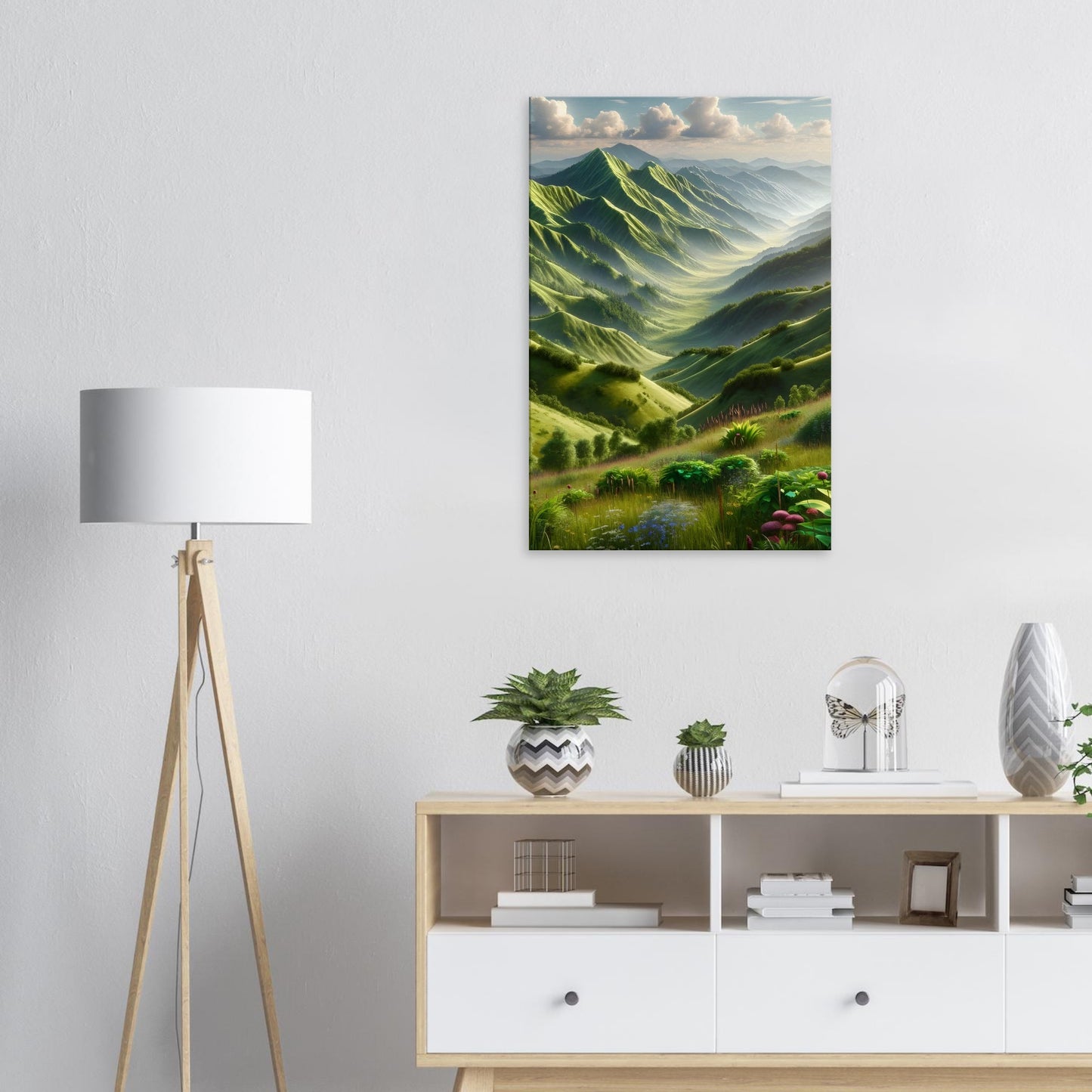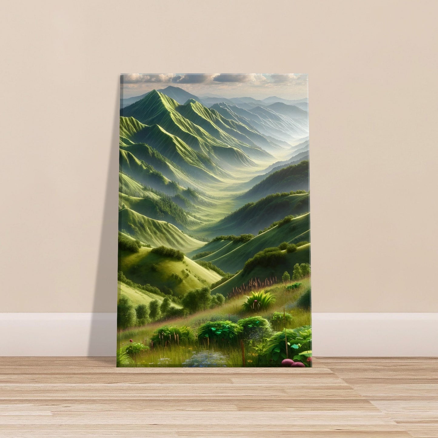 Embrace the gentle elegance of nature with Rolling Hill Mountains, an original canvas that captures the soft rhythm of sunlit hills and lush green valleys. Bathed in golden light, the rolling terrain flows with life, from the rich vegetation to the bursts of colourful wildflowers in the foreground. A soft morning mist lingers in the distance, adding depth and serenity to the scene.