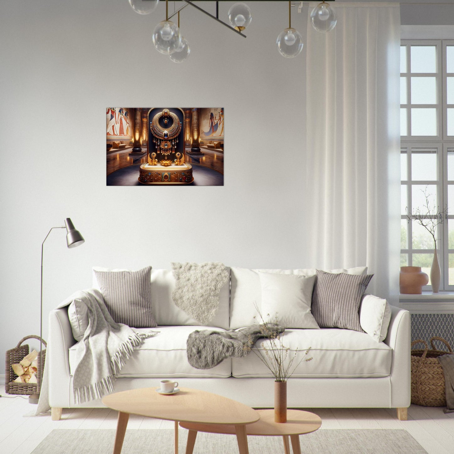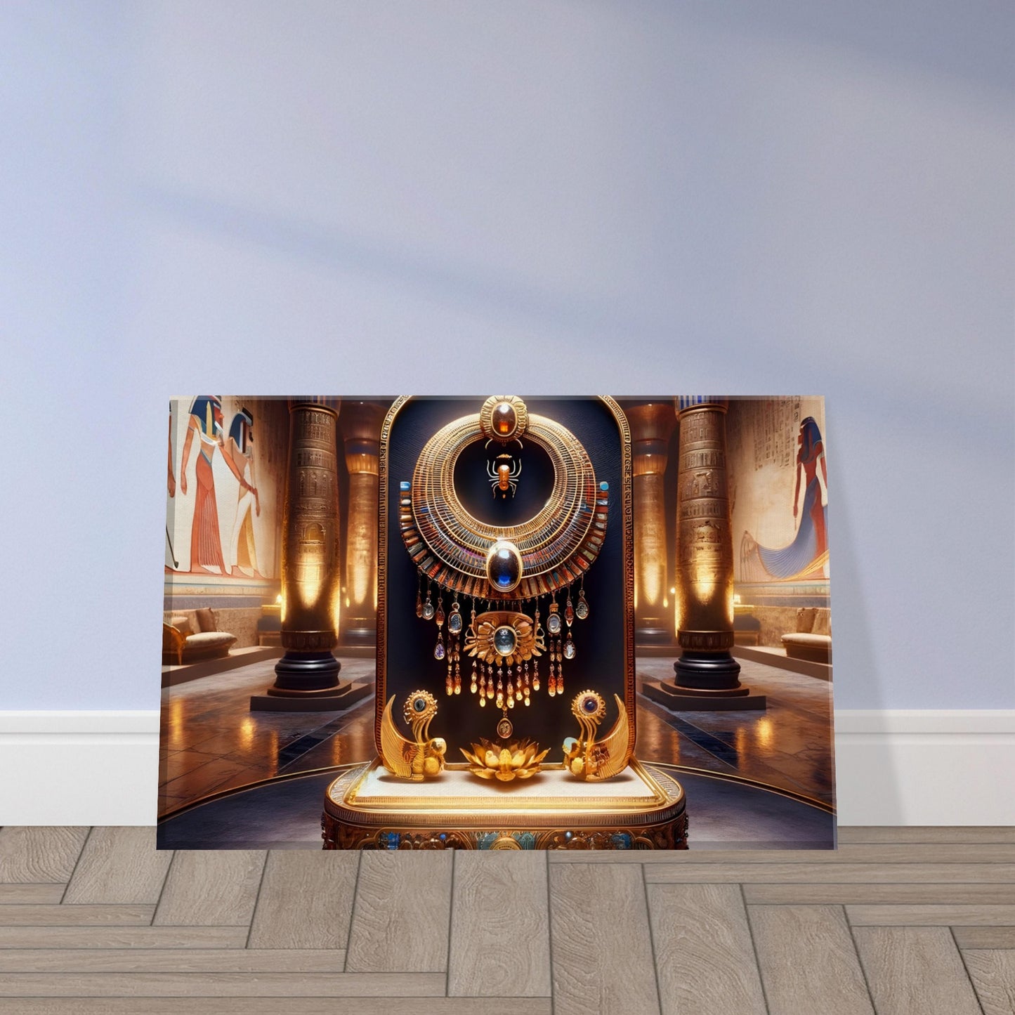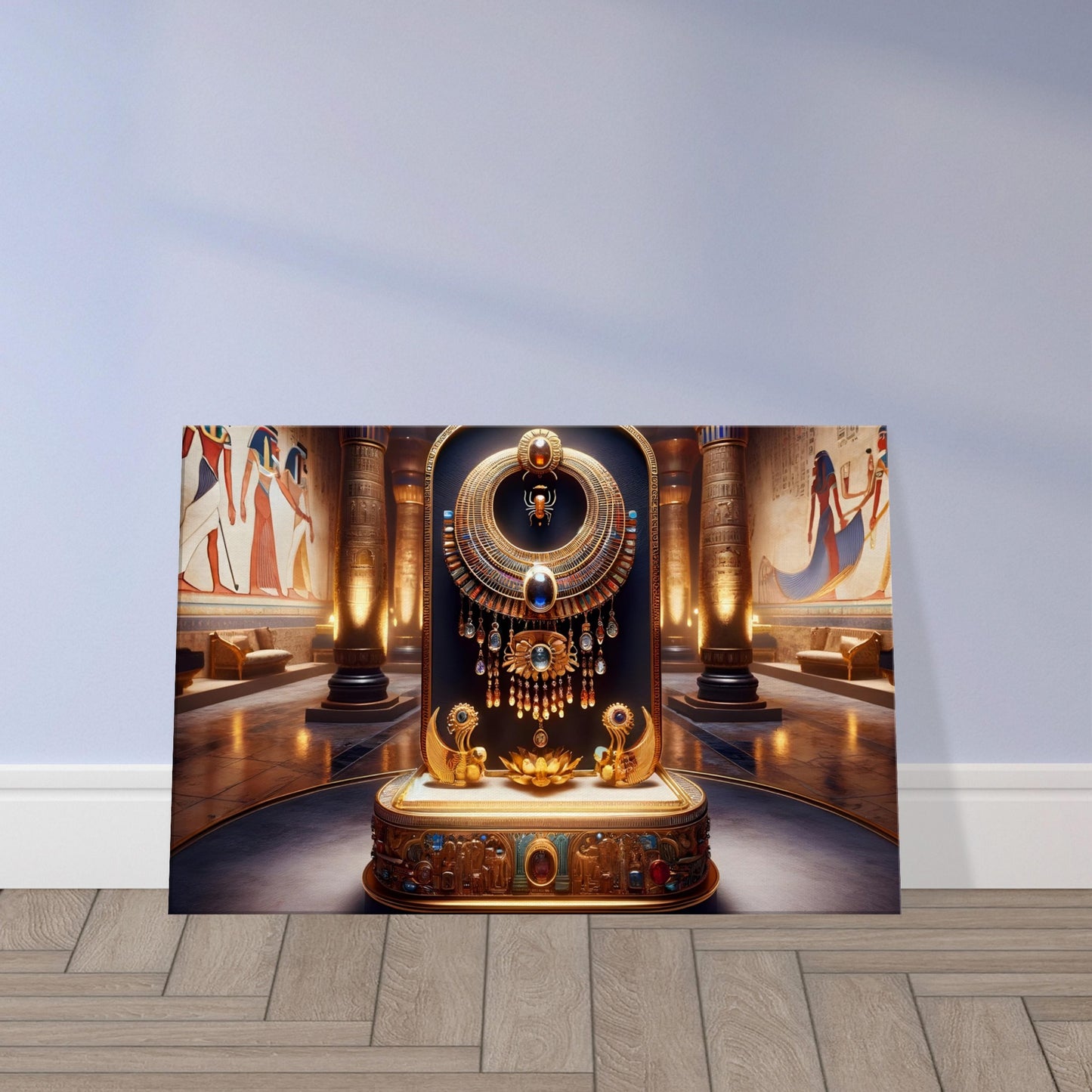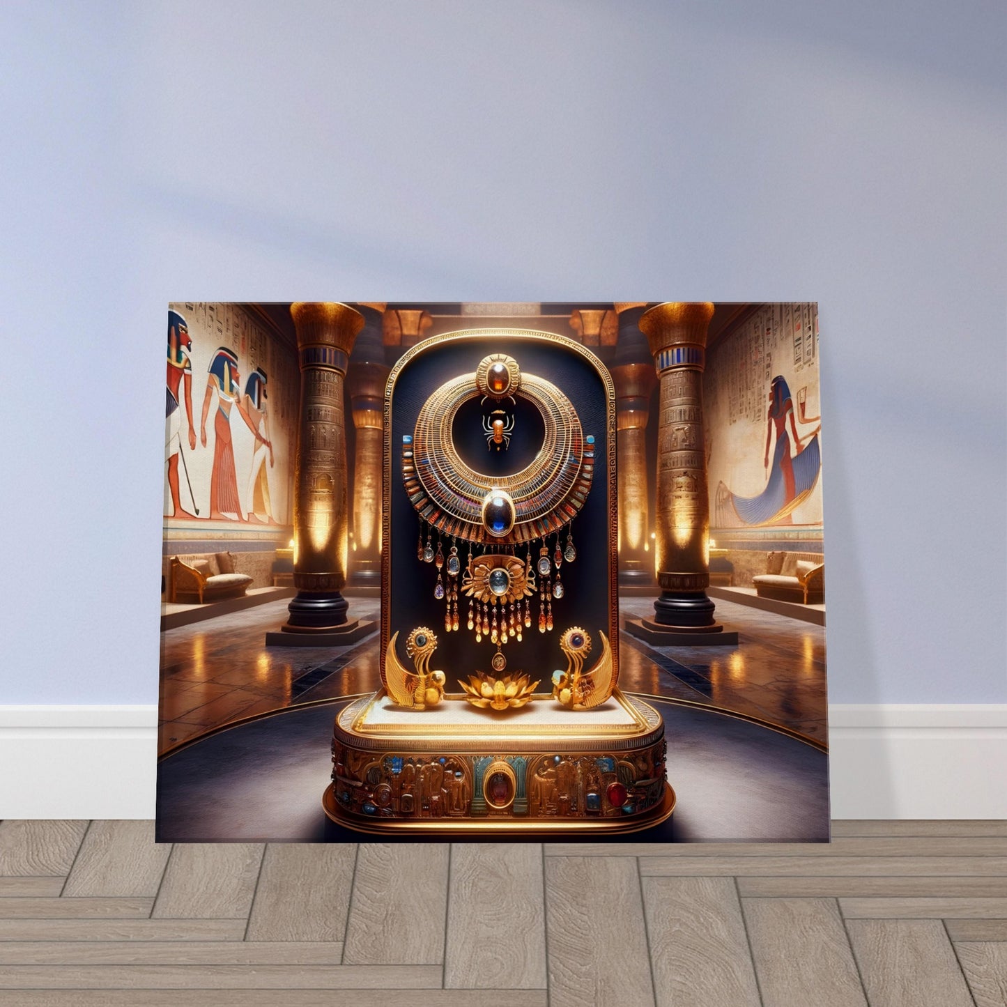 Scarab's Embrace in the Tomb unveils a sacred symbol of rebirth, divinity, and eternal protection at the heart of ancient Egyptian cosmology. At its center, a radiant scarab beetle cradles a sun orb, an homage to Khepri, the divine force who rolls the sun across the heavens. Its majestic wings, formed as a regal necklace, extend in a graceful arc, lavishly adorned with gold, lapis lazuli, and vibrant gemstones. Set within a grand tomb chamber, flanked by hieroglyph-covered columns and painted guardian deities, the scene is bathed in a soft, reverent glow. Each detail, from the sacred inscriptions to the jeweled craftsmanship, whispers of the Egyptian devotion to the afterlife and the mystical forces of renewal. This artwork is both a visual jewel and a spiritual relic, perfect for those who seek meaning through myth, legacy, and eternal beauty.