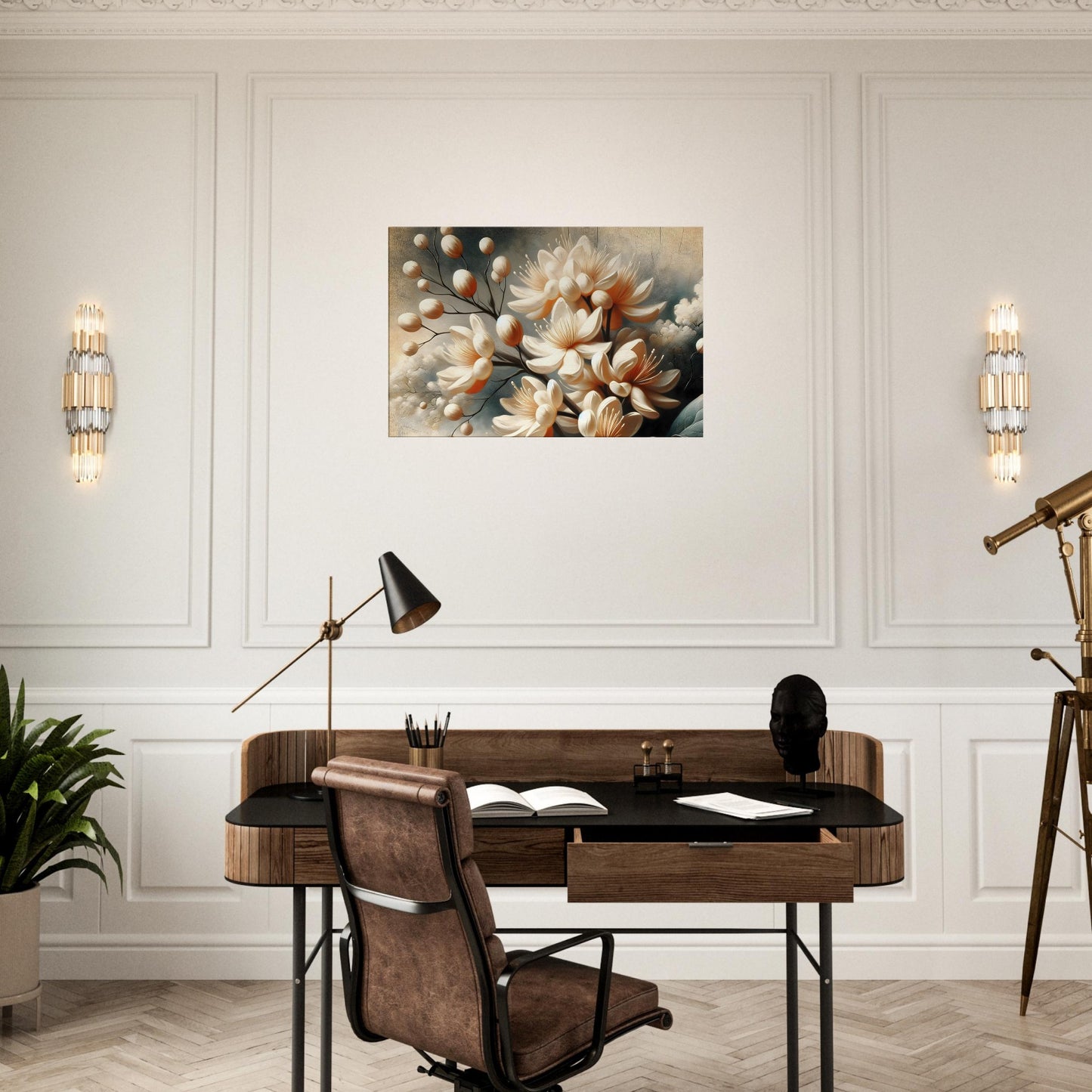 “Sea Poison Tree” is a luminous tribute to one of the ocean’s most enchanting floral treasures. Known for its fragrant, delicate white blossoms, this artwork captures the flower’s airy elegance with breathtaking finesse. Each slender petal radiates from the center in a graceful burst, touched by a gentle glow that enhances its ethereal presence. The softly rendered background adds a dreamlike quality, allowing the bloom’s natural beauty to shine in quiet, contemplative splendor.