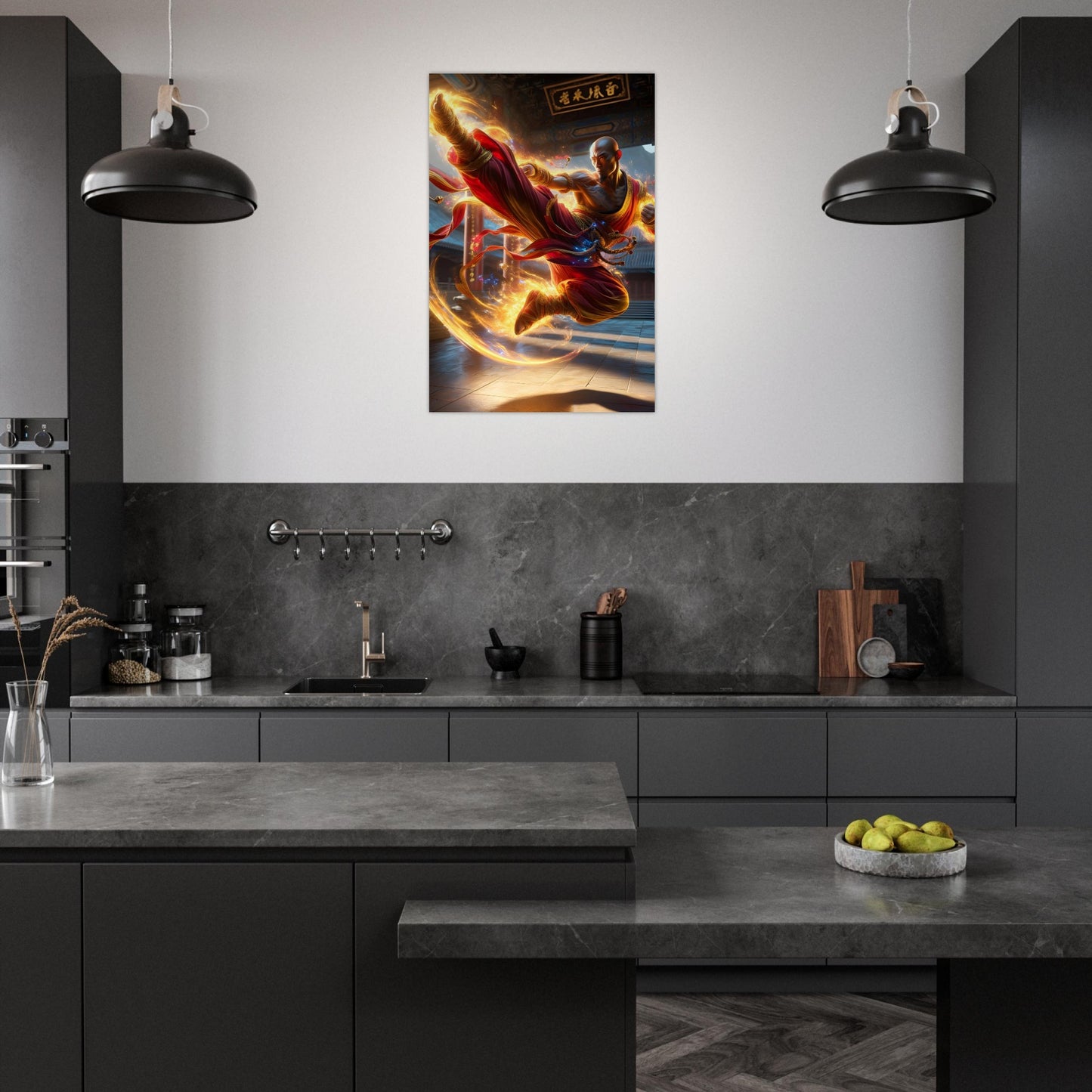 An explosion of motion, discipline, and raw elegance, Shaolin's Aerial Mastery captures a warrior monk at the zenith of his power—suspended mid-air in a flawless flying kick. His traditional robes unfurl like flames, catching light in luminous shades of crimson and gold, embodying both grace and fury. Every line of his form, from the clenched fists to the focused eyes, radiates the timeless intensity of Shaolin discipline. Set within the hallowed walls of an ancient temple courtyard, the scene contrasts serenity with kinetic brilliance—the stillness of tradition meeting the dynamic energy of combat. The glowing contours of the warrior's figure illuminate the historic backdrop, amplifying his spirit and technique. Printed on sleek magnetic metal, this piece transforms any wall into a shrine of movement, mastery, and martial legacy.