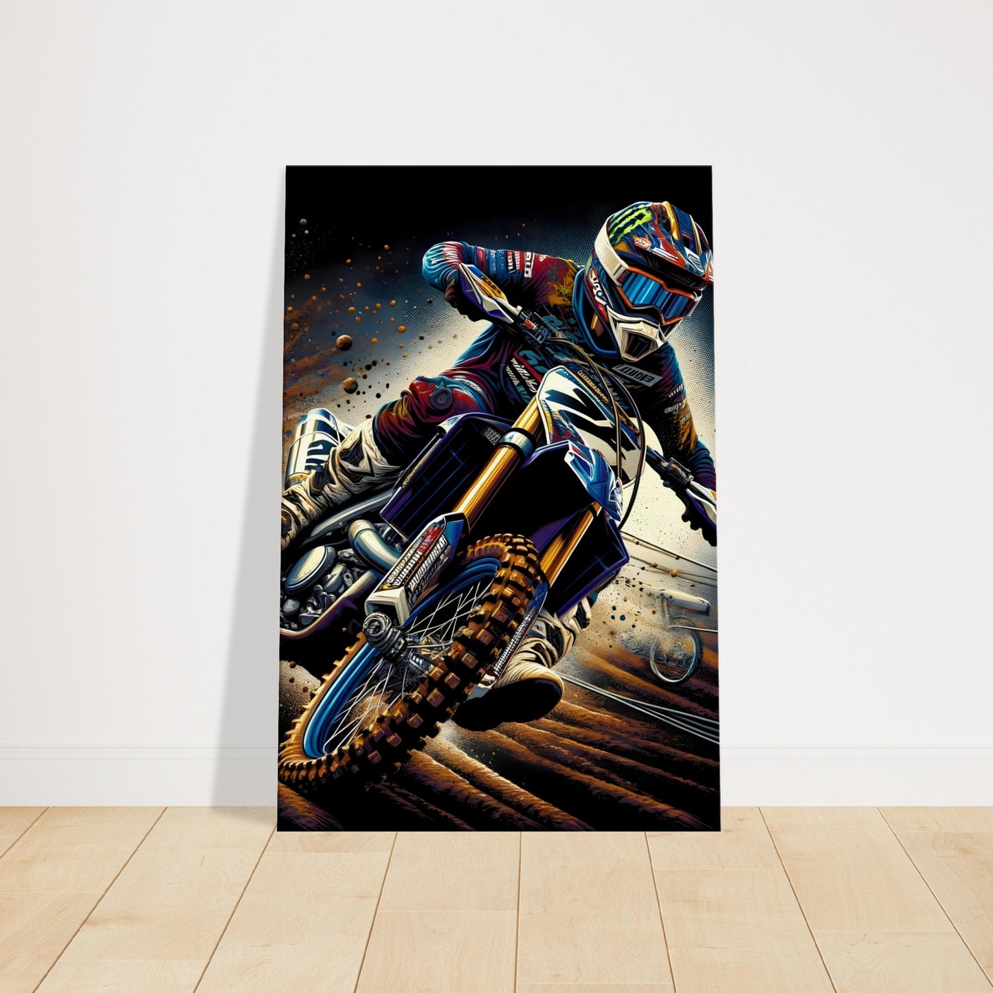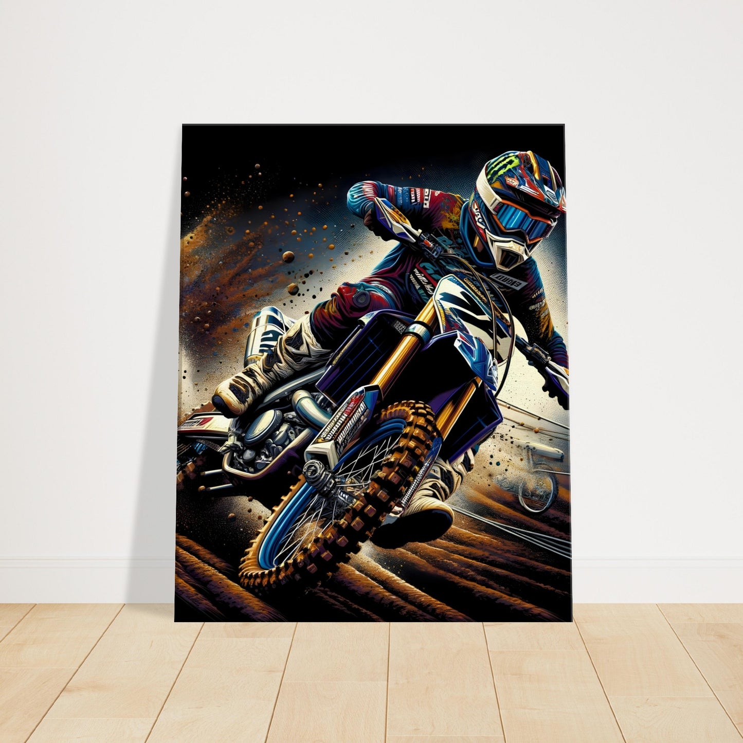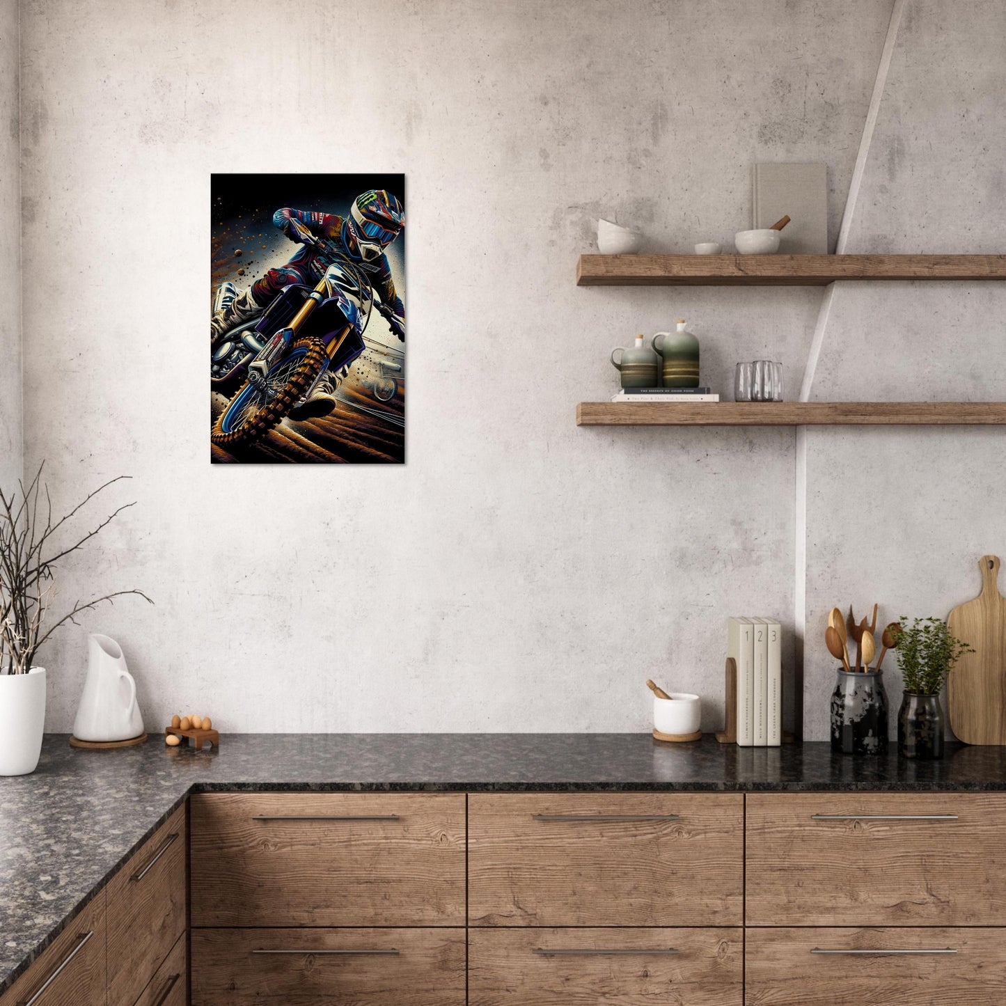 Skilled Maneuver captures the split-second mastery of motocross at its most thrilling, where control meets chaos in a high-speed wheelie. The rider surges forward with explosive power, front tire suspended mid-air, perfectly balanced between force and finesse. Vivid streaks of color emphasize velocity, while bold contrasts bring every detail into sharp focus, from the churn of the rear tire to the determined grip of the rider. This canvas radiates motion and adrenaline, making it a bold tribute to precision riding and fearless performance. Perfect for motorsport lovers, Skilled Maneuver injects high-octane energy into any space.
