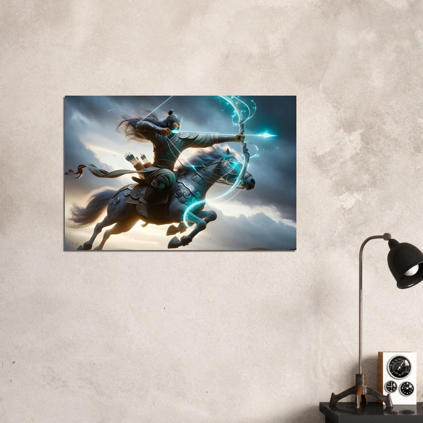A moment of breathtaking precision and warrior grace, Skybound Mongolian Archer captures the fierce spirit of the steppe in full flight. Suspended mid-leap, the ancient archer soars from his galloping steed, bow drawn taut with luminous turquoise and silver light. His expression is razor-sharp—focused, furious, and utterly unshakable—as storm clouds churn over the wild Mongolian plains behind him. Wind tears through his flowing garb, and the air crackles with the raw tension of the shot about to be loosed. The elemental drama of the storm-swept steppe meets the poise of a master marksman, creating a composition rich in motion, intensity, and ancestral pride. Printed on premium magnetic metal, Skybound Mongolian Archer is a fierce tribute to nomadic power, timeless skill, and the untamed soul of the warrior.