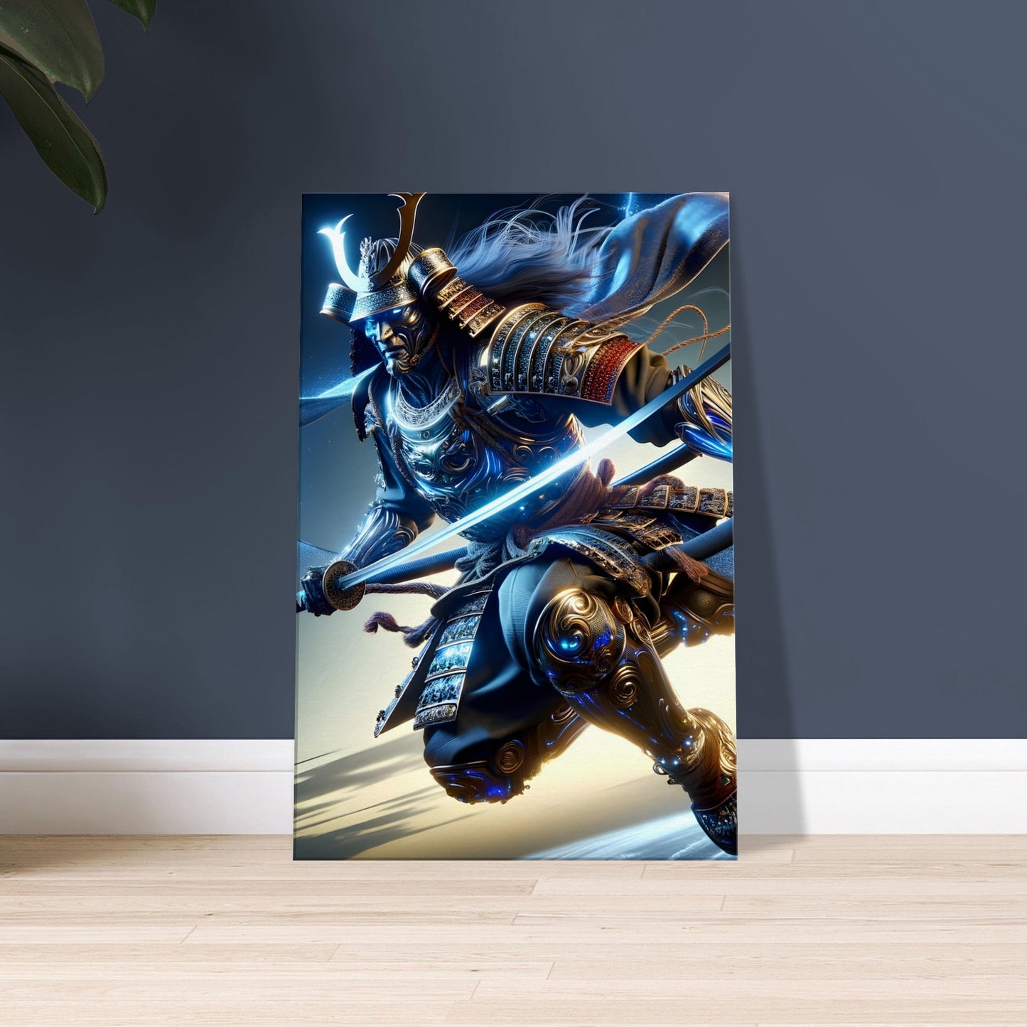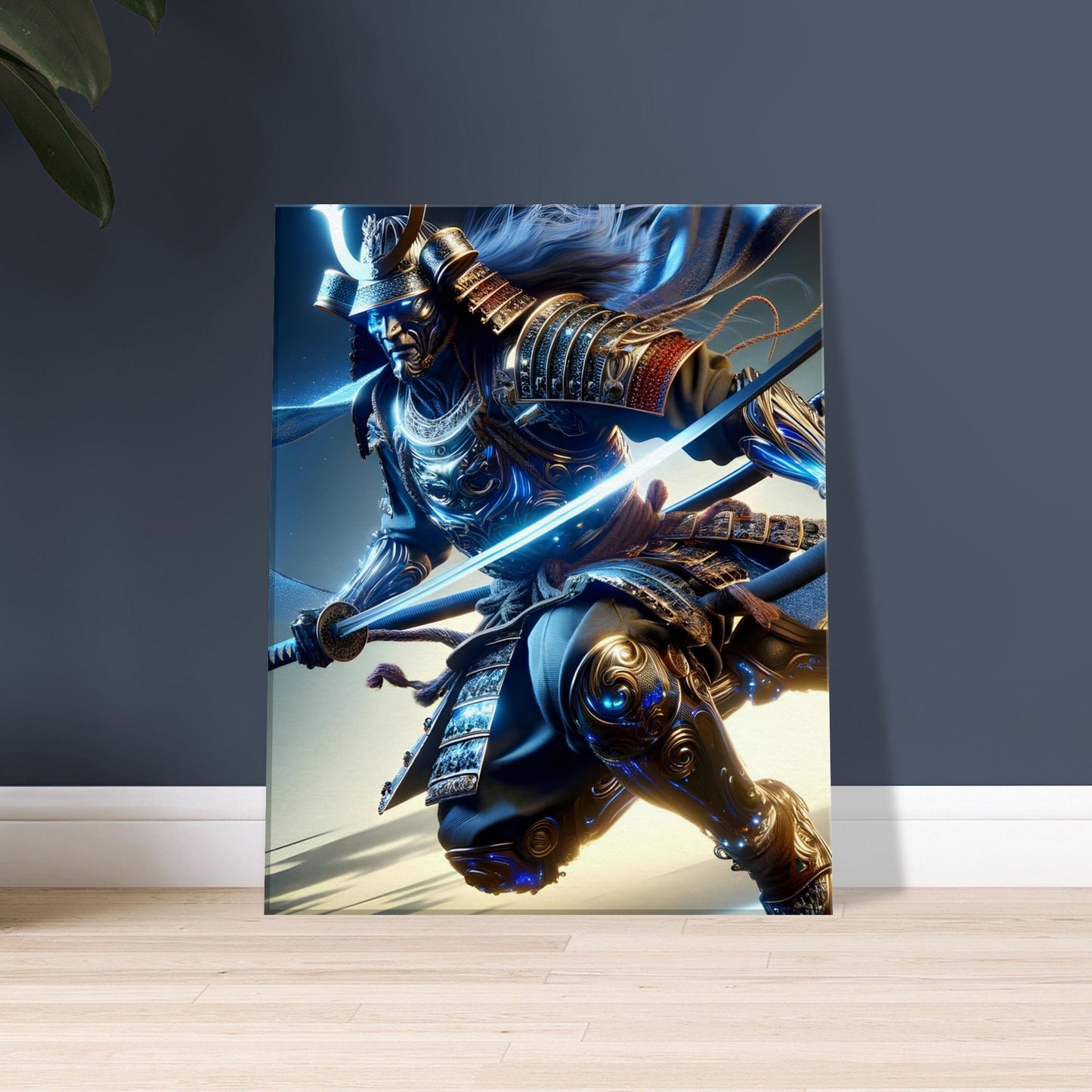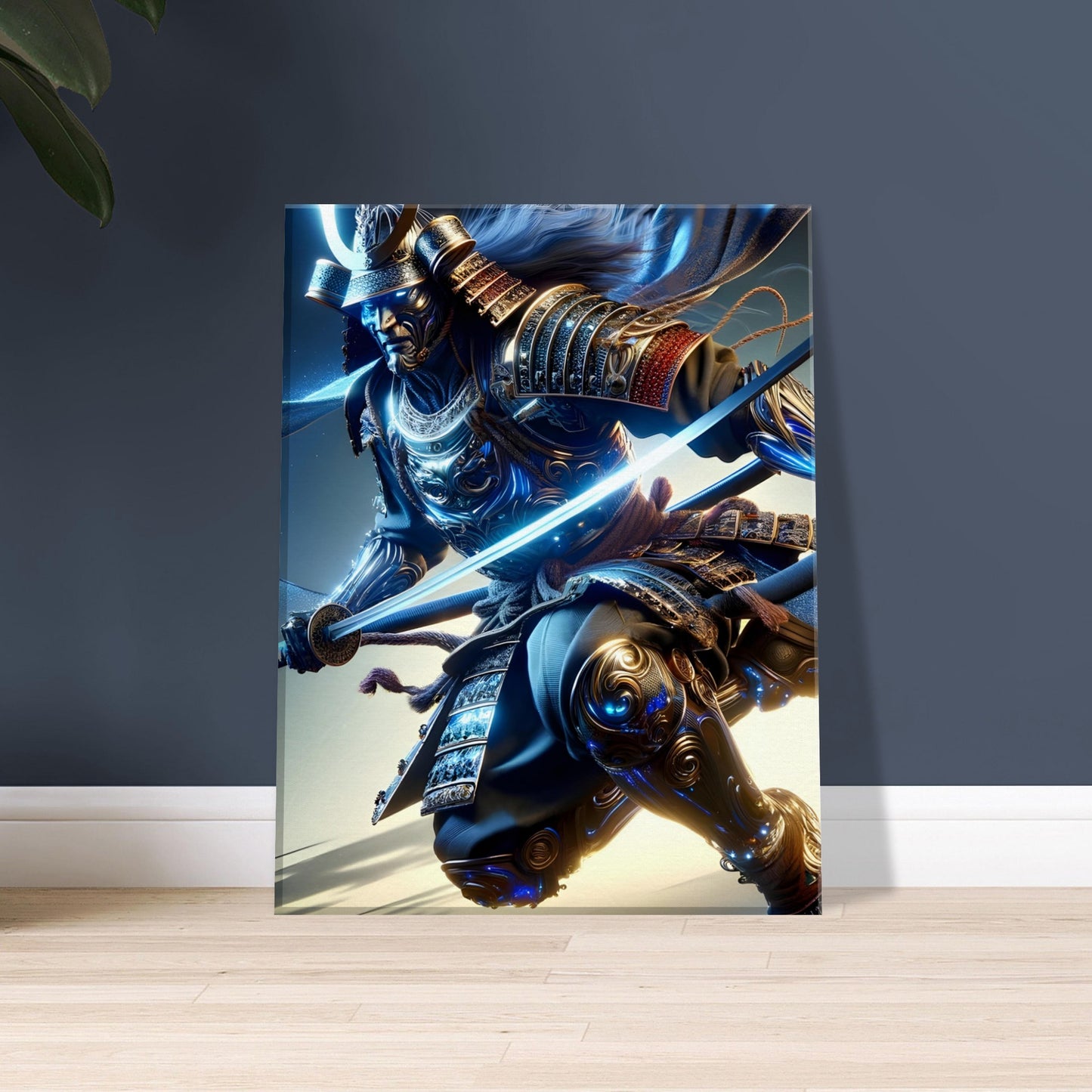 Frozen mid-leap beneath a storm-charged sky, Skybound Samurai captures a moment of perfect precision and unstoppable force. The warrior ascends through the night, katana drawn in a deadly arc, his armor glowing with electric blue and metallic silver—colors that flash like lightning across the darkness. His expression is fierce, eyes locked on his target, a fusion of discipline and intensity honed through centuries of warrior tradition. The dramatic sky behind him swirls with cosmic energy, casting an ethereal light on the scene and heightening the sense of motion and mastery. Printed on premium canvas, Skybound Samurai is a bold tribute to honor, elegance, and the airborne power of a strike born in silence and unleashed with force.