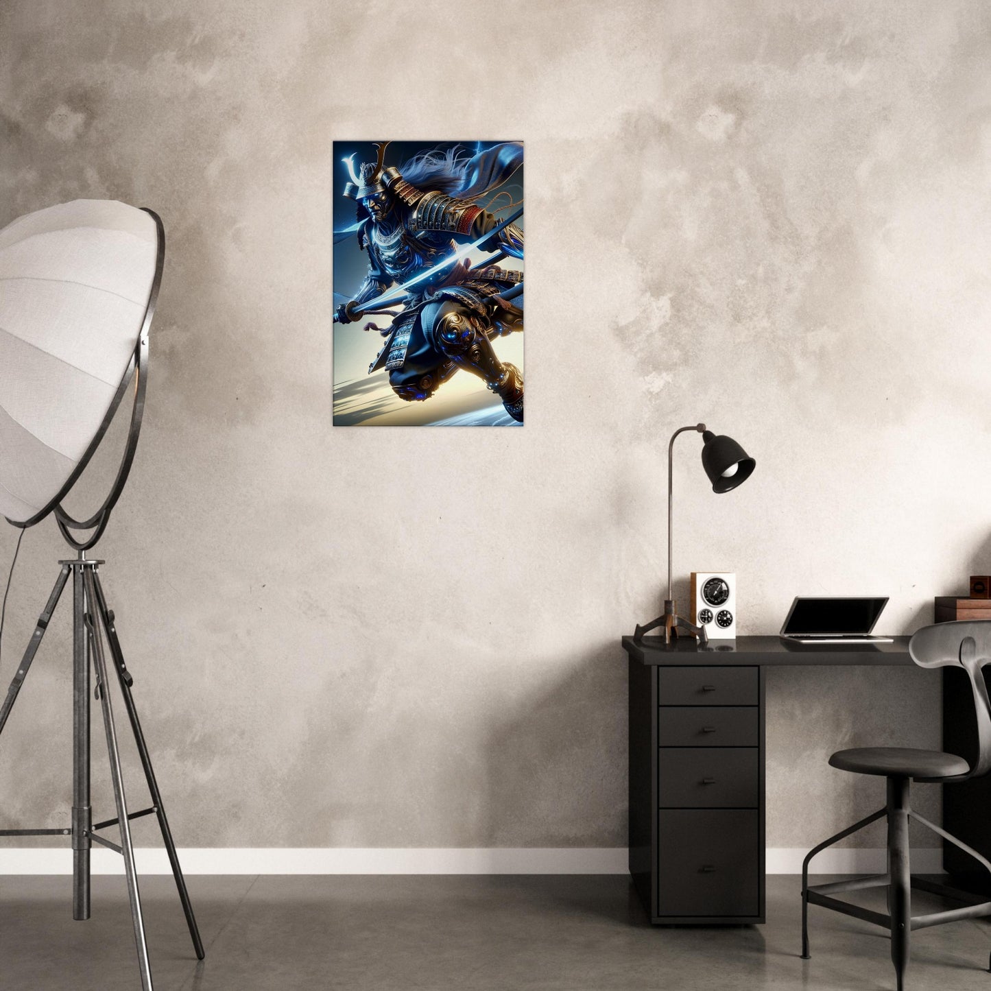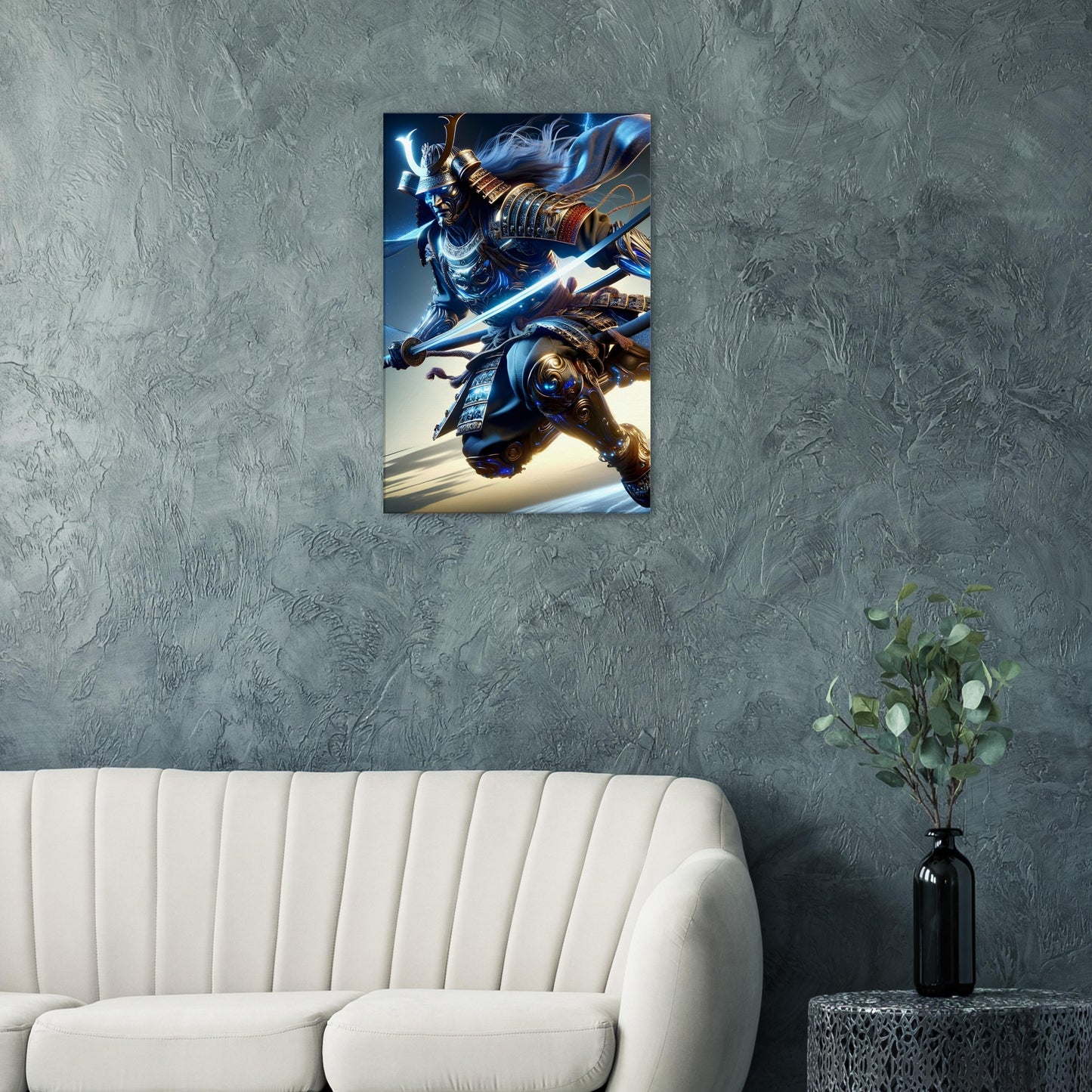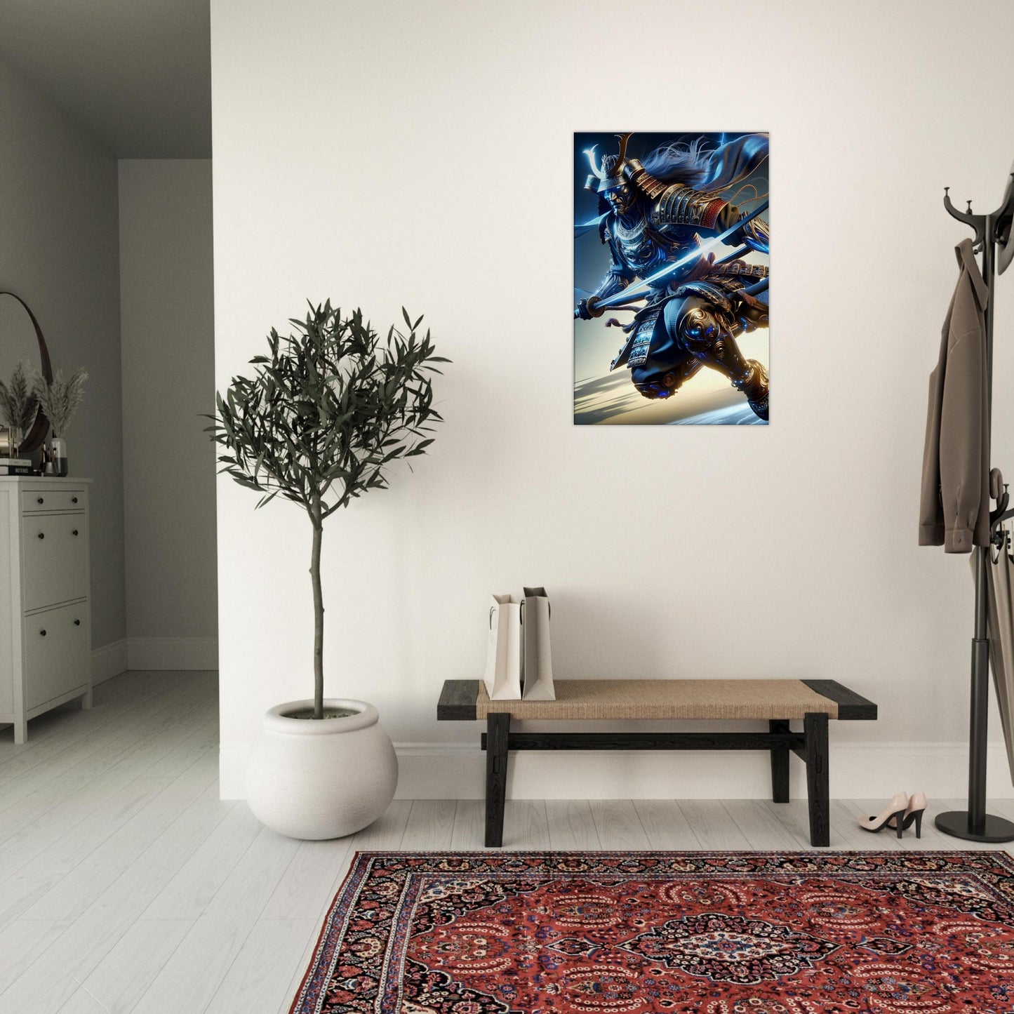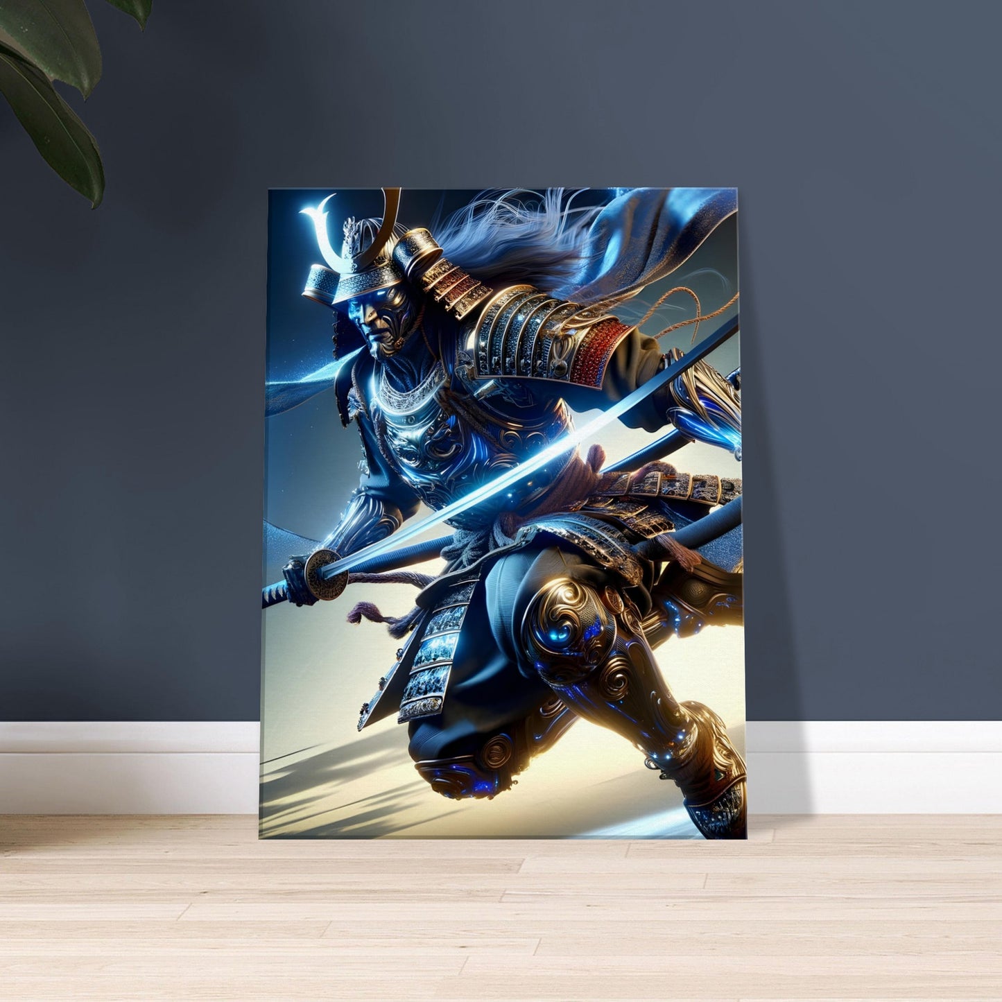 Frozen mid-leap beneath a storm-charged sky, Skybound Samurai captures a moment of perfect precision and unstoppable force. The warrior ascends through the night, katana drawn in a deadly arc, his armor glowing with electric blue and metallic silver—colors that flash like lightning across the darkness. His expression is fierce, eyes locked on his target, a fusion of discipline and intensity honed through centuries of warrior tradition. The dramatic sky behind him swirls with cosmic energy, casting an ethereal light on the scene and heightening the sense of motion and mastery. Printed on premium canvas, Skybound Samurai is a bold tribute to honor, elegance, and the airborne power of a strike born in silence and unleashed with force.