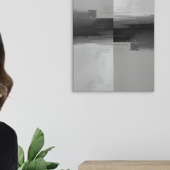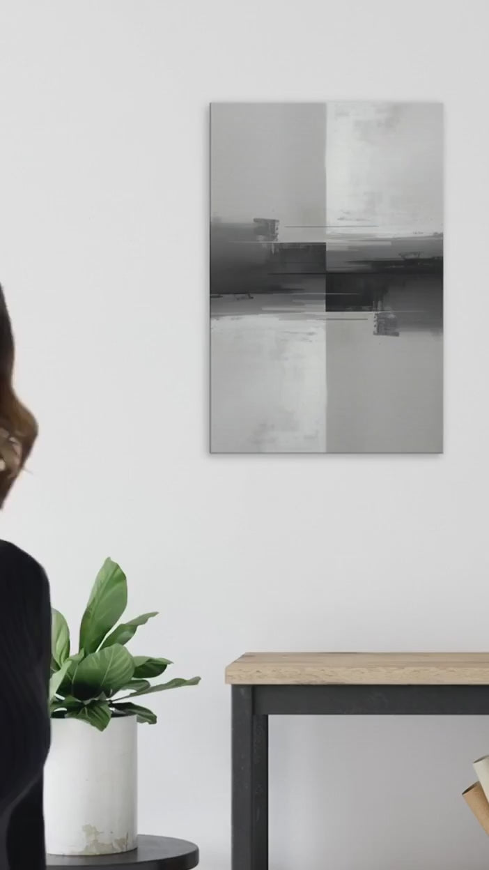 “Smeared Steel” channels vertical abstract layers in steel, slate, and muted white, inspired by modern urban architecture. Portrait orientation emphasizes upward movement and structural flow, creating a striking focal point for hallways, offices, or bedrooms. Minimalist composition blends geometric forms with smooth gradient transitions, delivering sleek, contemporary sophistication.