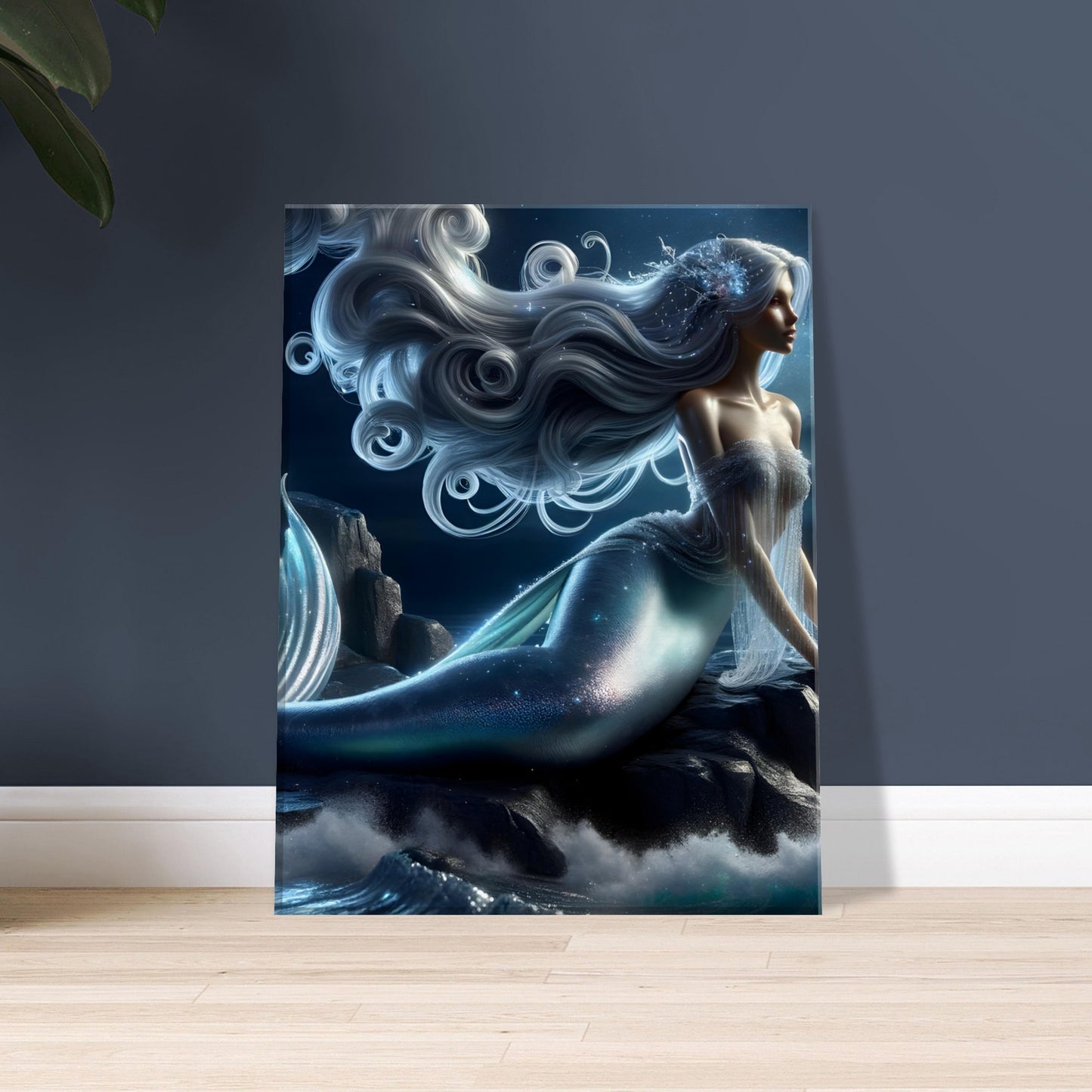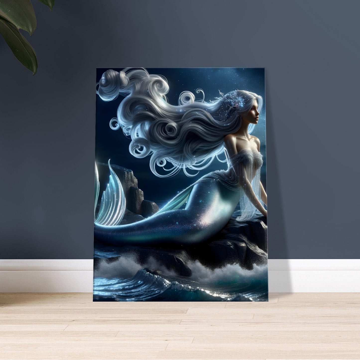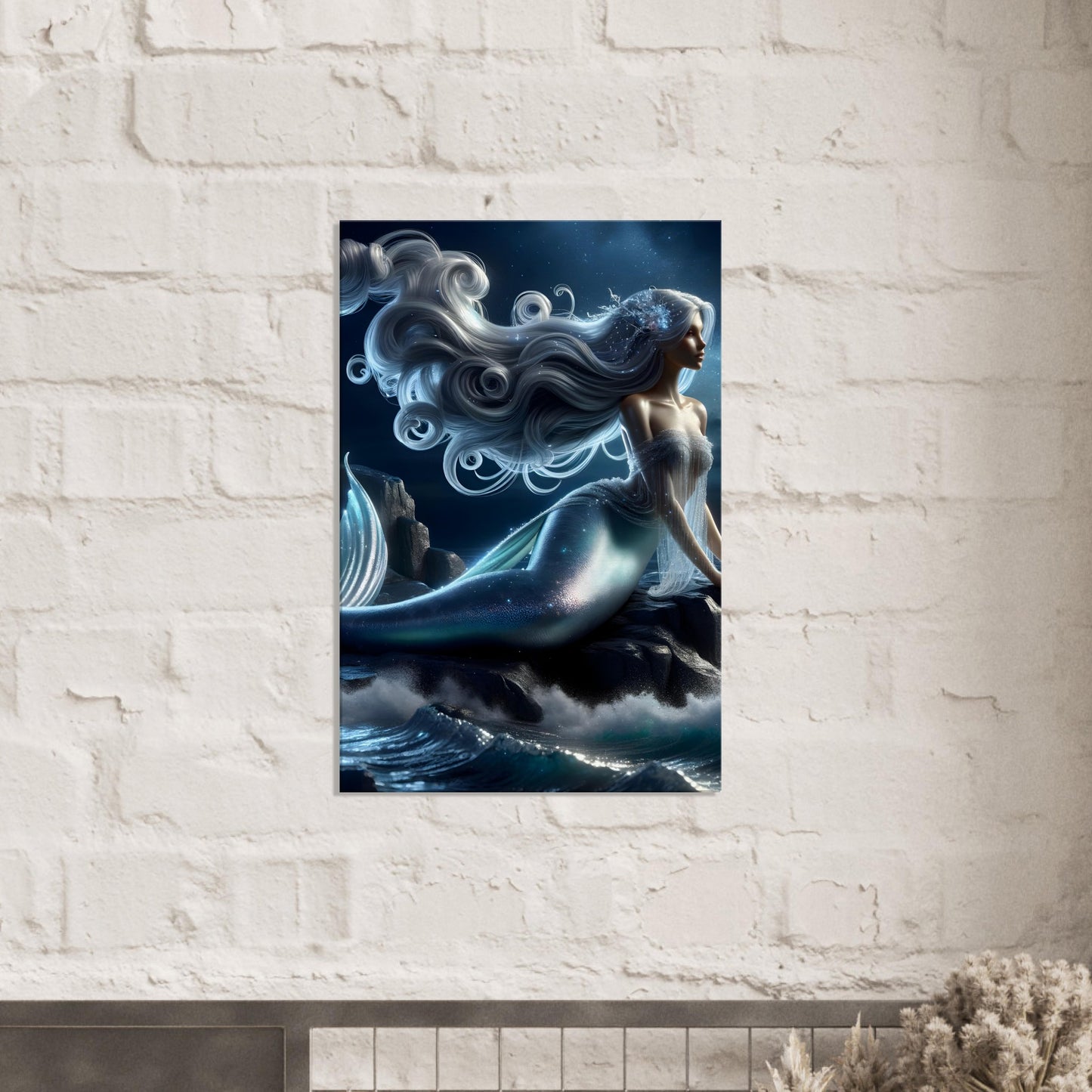 Haunting and heavenly, Starlit Melody captures the mesmerizing presence of a Siren—myth’s most enchanting muse—bathed in starlight and silence. Perched gracefully upon a rocky outcrop, her pearlescent skin shimmers with otherworldly softness, echoing the moonlight that dances across the waves below. Her long, flowing hair, a cascade of deep blue and luminous silver, moves like silk in the ocean breeze, framing a face of serene beauty and eternal mystery. Beneath the star-filled sky, she gazes into the night with a quiet intensity, her stillness suggesting a song too beautiful—and too dangerous—to hear. Starlit Melody is a tribute to the elegance of myth and the power of allure, ideal for collectors who seek grace, emotion, and fantasy set adrift beneath the stars.