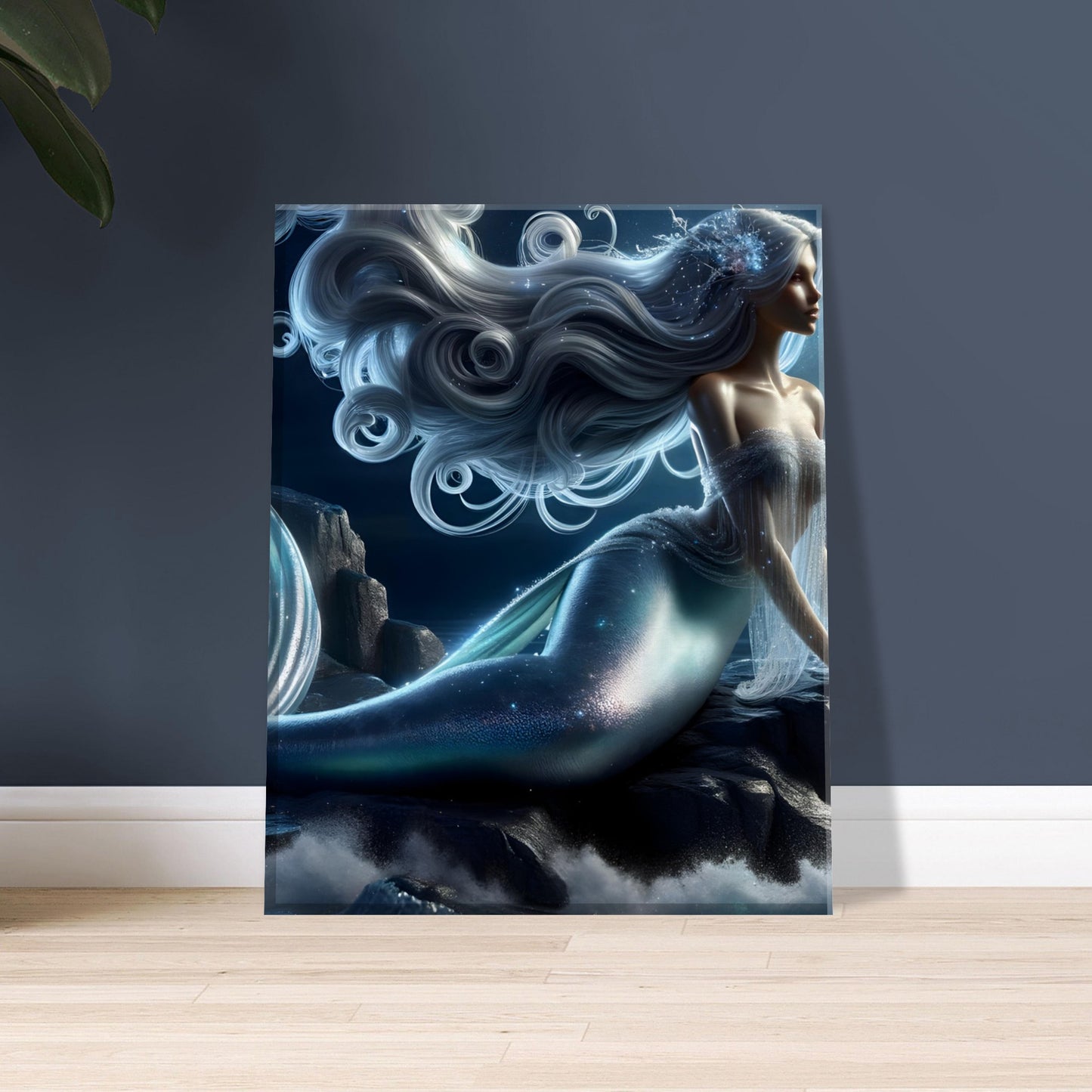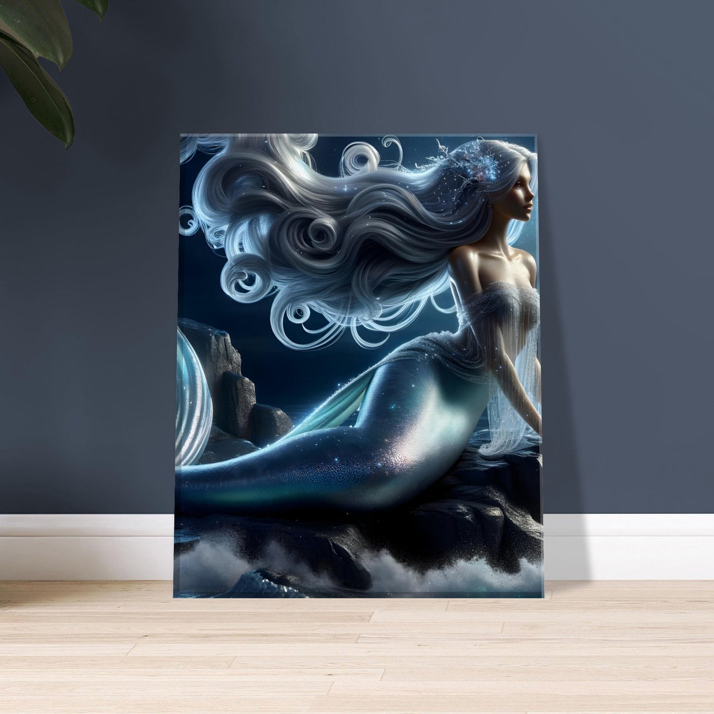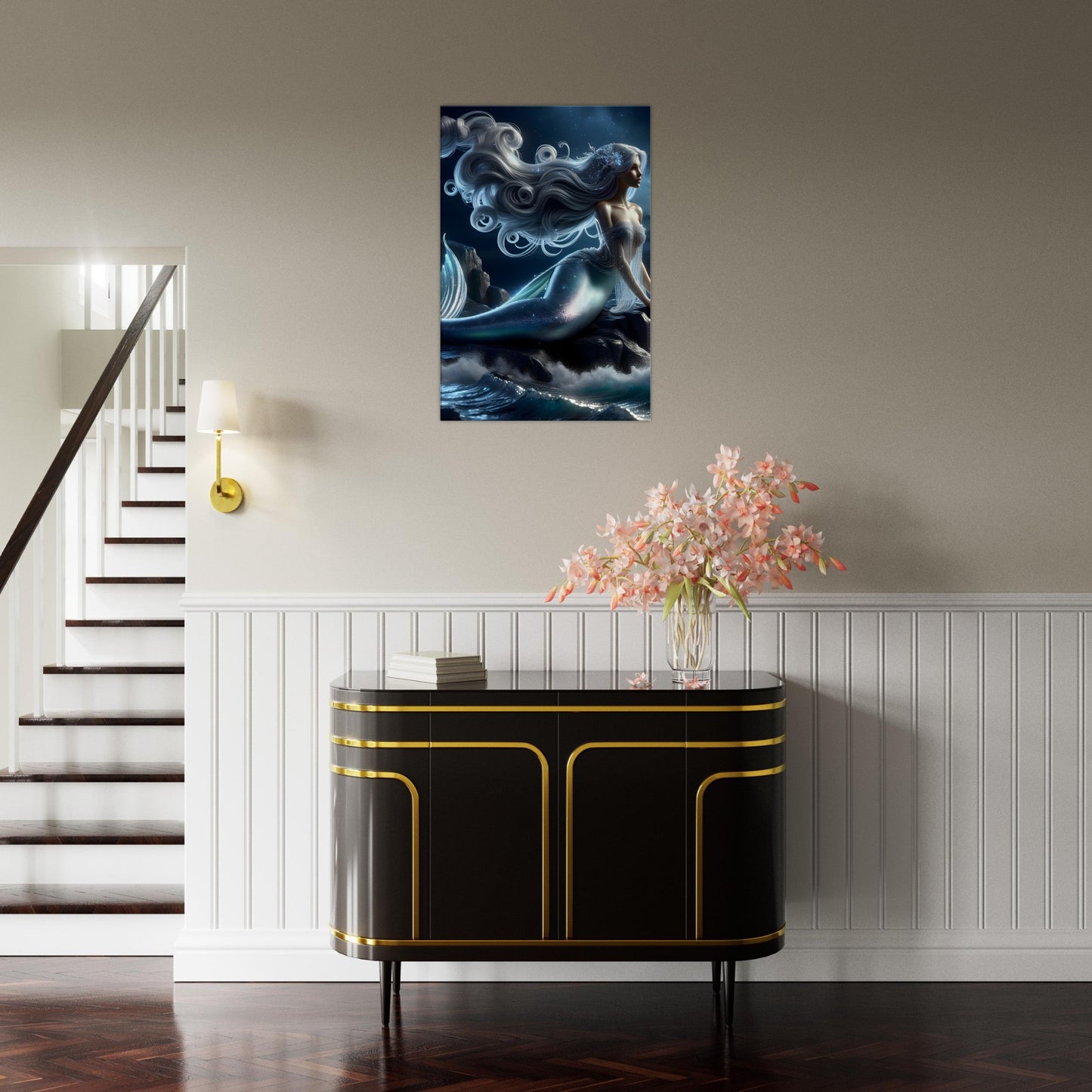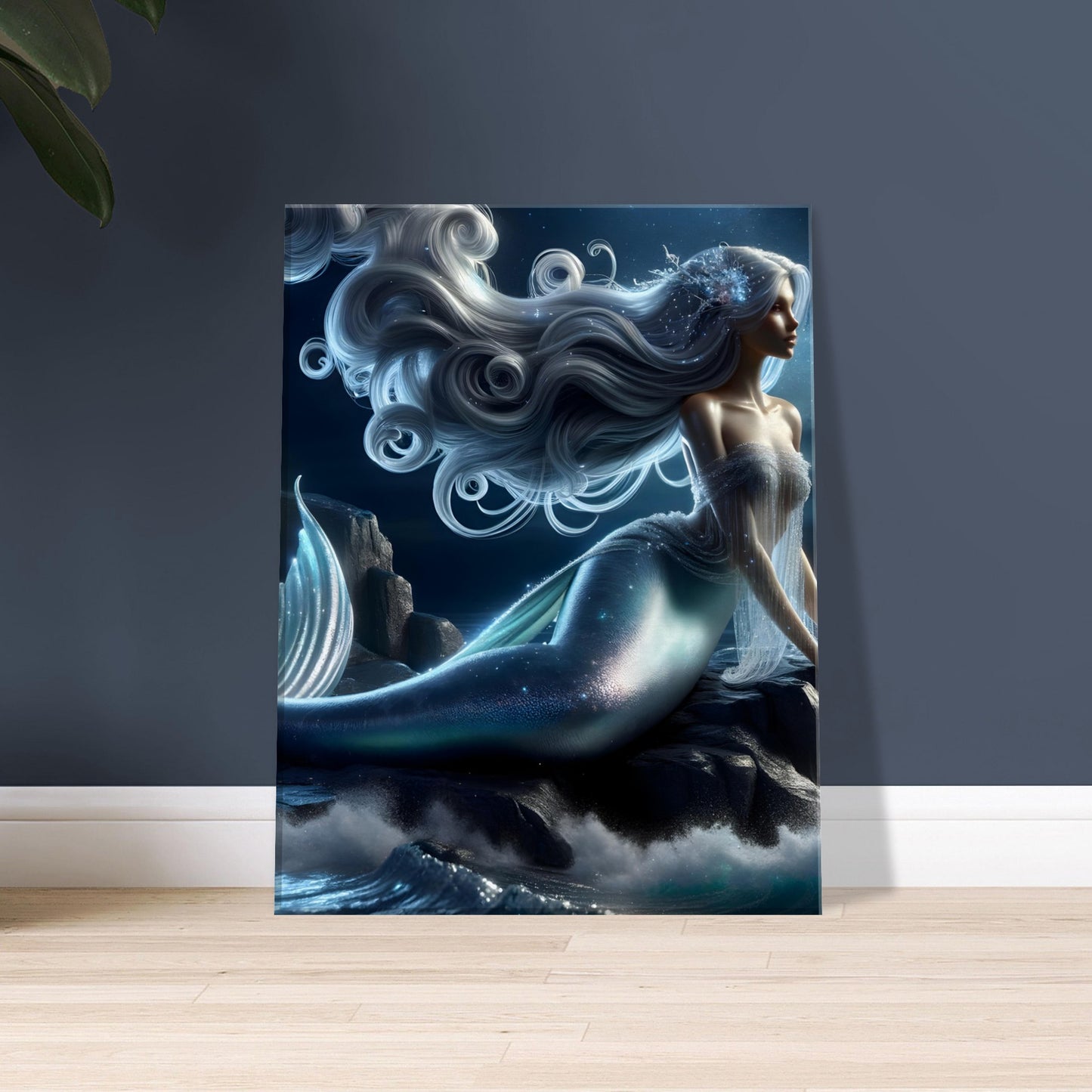Haunting and heavenly, Starlit Melody captures the mesmerizing presence of a Siren—myth’s most enchanting muse—bathed in starlight and silence. Perched gracefully upon a rocky outcrop, her pearlescent skin shimmers with otherworldly softness, echoing the moonlight that dances across the waves below. Her long, flowing hair, a cascade of deep blue and luminous silver, moves like silk in the ocean breeze, framing a face of serene beauty and eternal mystery. Beneath the star-filled sky, she gazes into the night with a quiet intensity, her stillness suggesting a song too beautiful—and too dangerous—to hear. Starlit Melody is a tribute to the elegance of myth and the power of allure, ideal for collectors who seek grace, emotion, and fantasy set adrift beneath the stars.