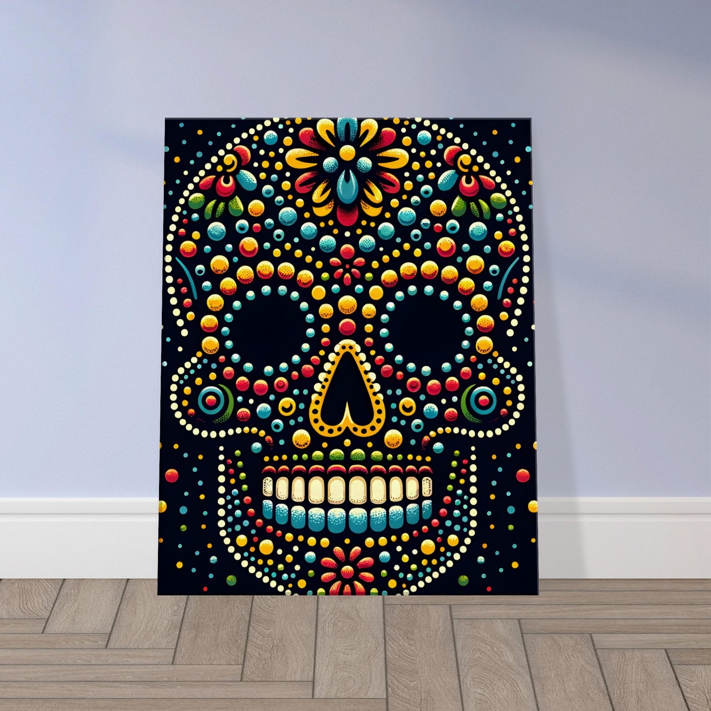 Traditional Mexican Skull is a timeless tribute to the vibrant spirit of Mexican folk art. Set against a dark, moody background, the skull is adorned with intricate outlines of colorful dots and symbolic detailing, capturing the joyful energy of Día de los Muertos. Each element is thoughtfully placed, evoking the handcrafted beauty of traditional celebrations, from floral patterns to radiant accents that bring the composition to life. This artwork honors the heritage and artistry of Mexico’s cultural legacy, creating a lively and festive atmosphere steeped in meaning. A standout piece for any space that values authenticity, tradition, and bold visual storytelling.