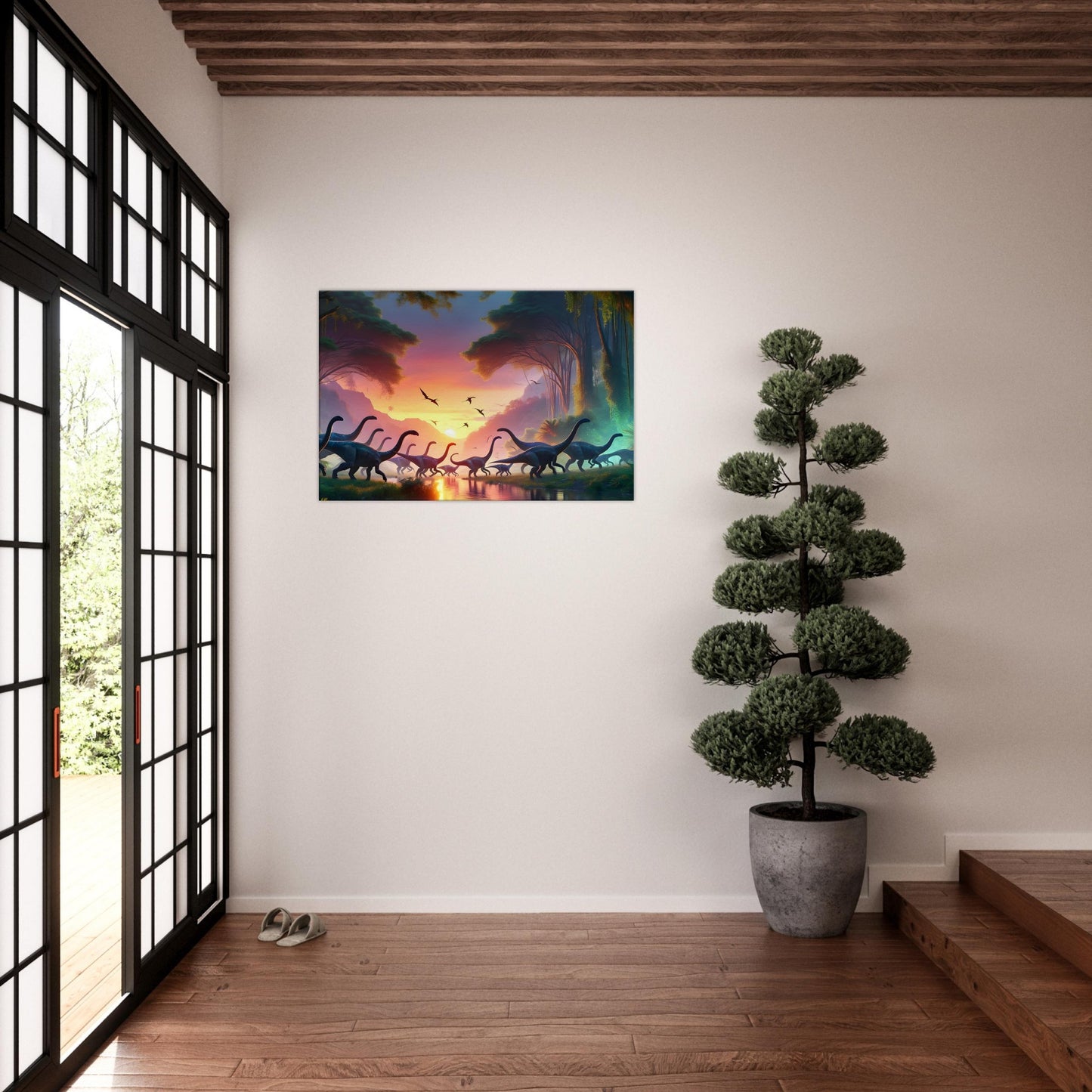 Twilight by the River transports viewers to a moment of prehistoric calm, where a herd of Parasaurolophus gracefully moves through a lush riverside at the close of day. Their distinctive crests form elegant silhouettes against a vivid twilight sky, mirrored in the still waters below. Soft hues of purple, amber, and deep green illuminate the foliage, creating a dreamlike atmosphere that captures both the social harmony and gentle strength of these herbivorous dinosaurs. This piece invites contemplation of a quieter world—untouched by time—where ancient creatures thrived in peaceful coexistence with their environment. Ideal for lovers of natural history, serene landscapes, and atmospheric art, Twilight by the River is printed on premium canvas and ready to hang, bringing timeless beauty and gentle grandeur to any space.