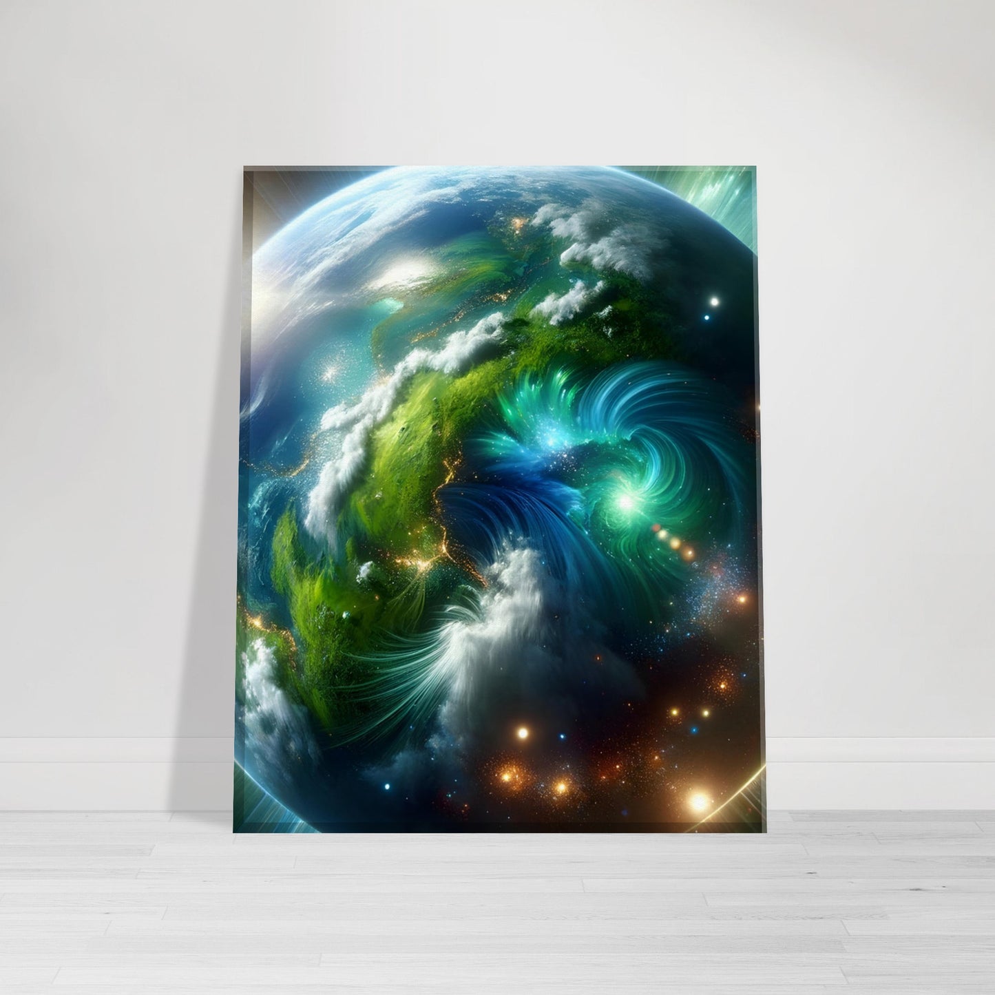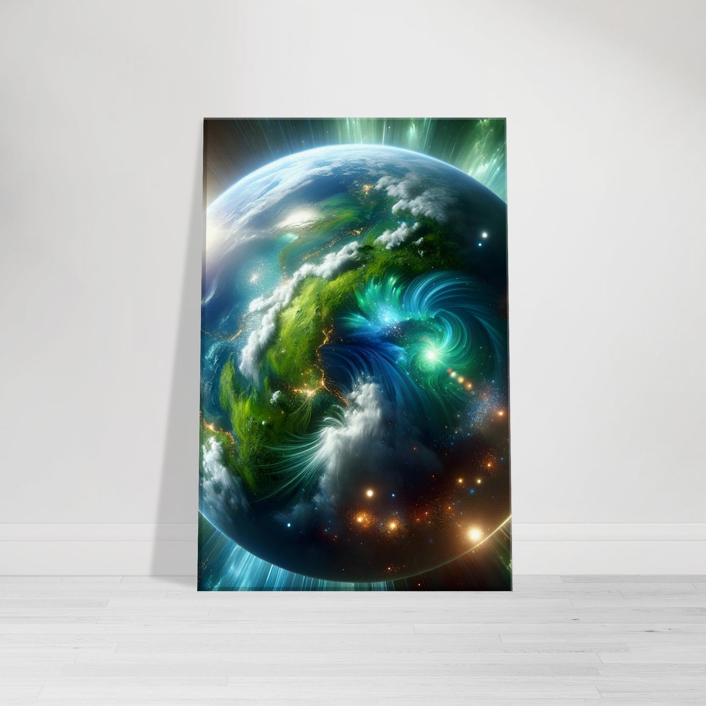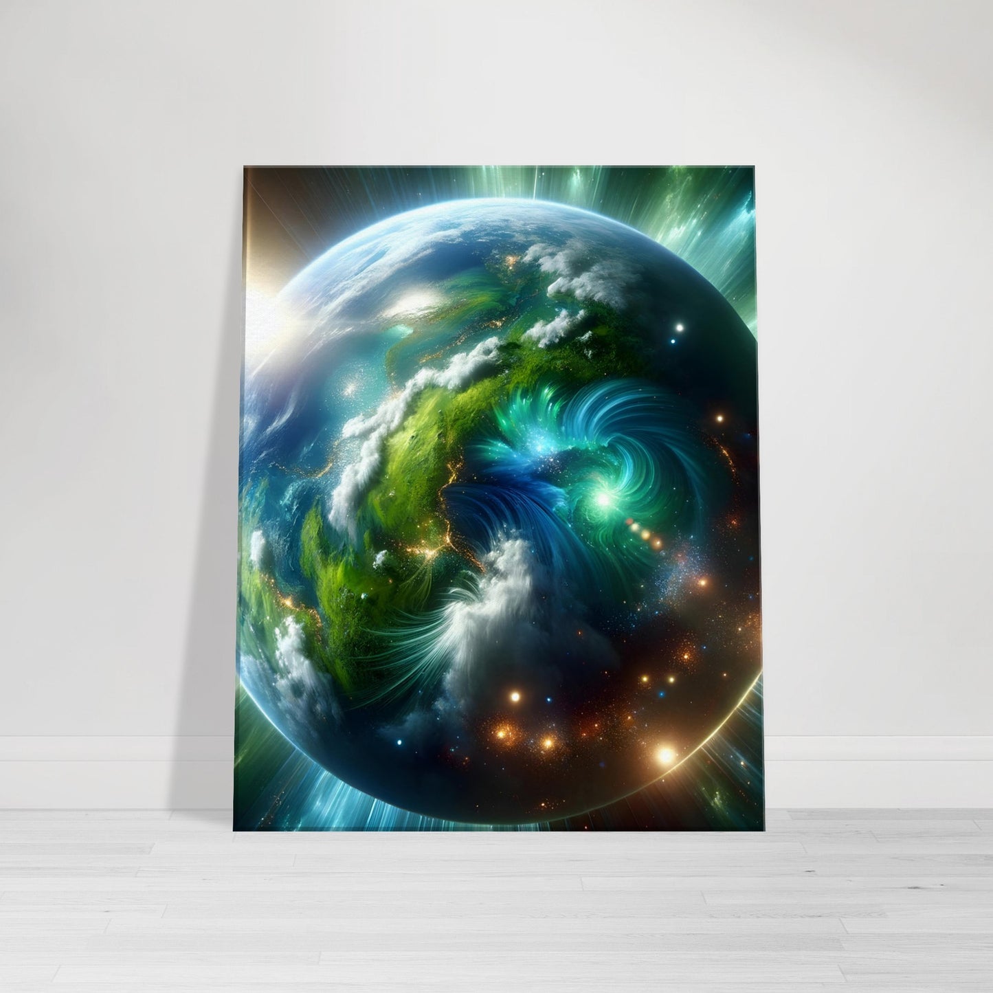 Verdant Cosmic Oasis is a breathtaking canvas artwork that captures the beauty of life thriving within the vast cosmos. A luminous planet, teeming with lush green terrain and deep blue oceans, radiates vitality and calm. The celestial backdrop—featuring vibrant nebulas, sparkling stars, and glowing cosmic elements—envelops the scene in wonder and brilliance.