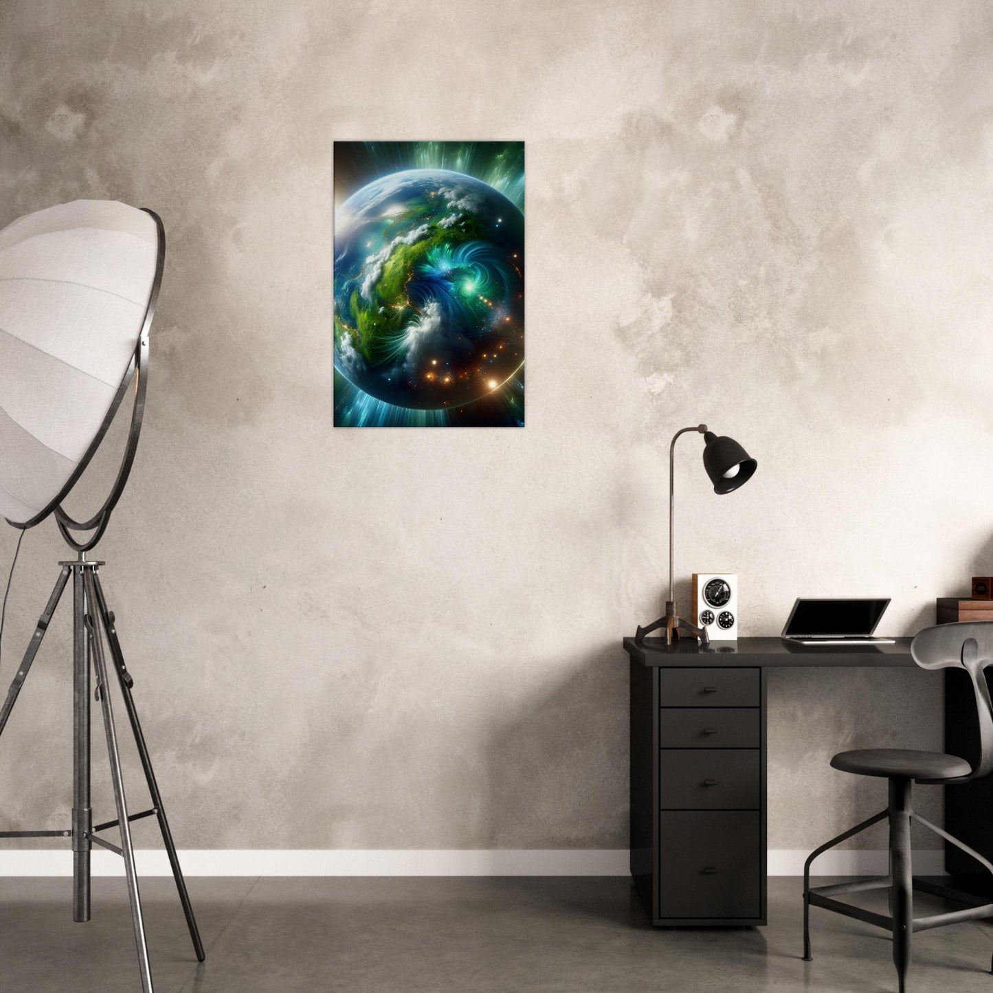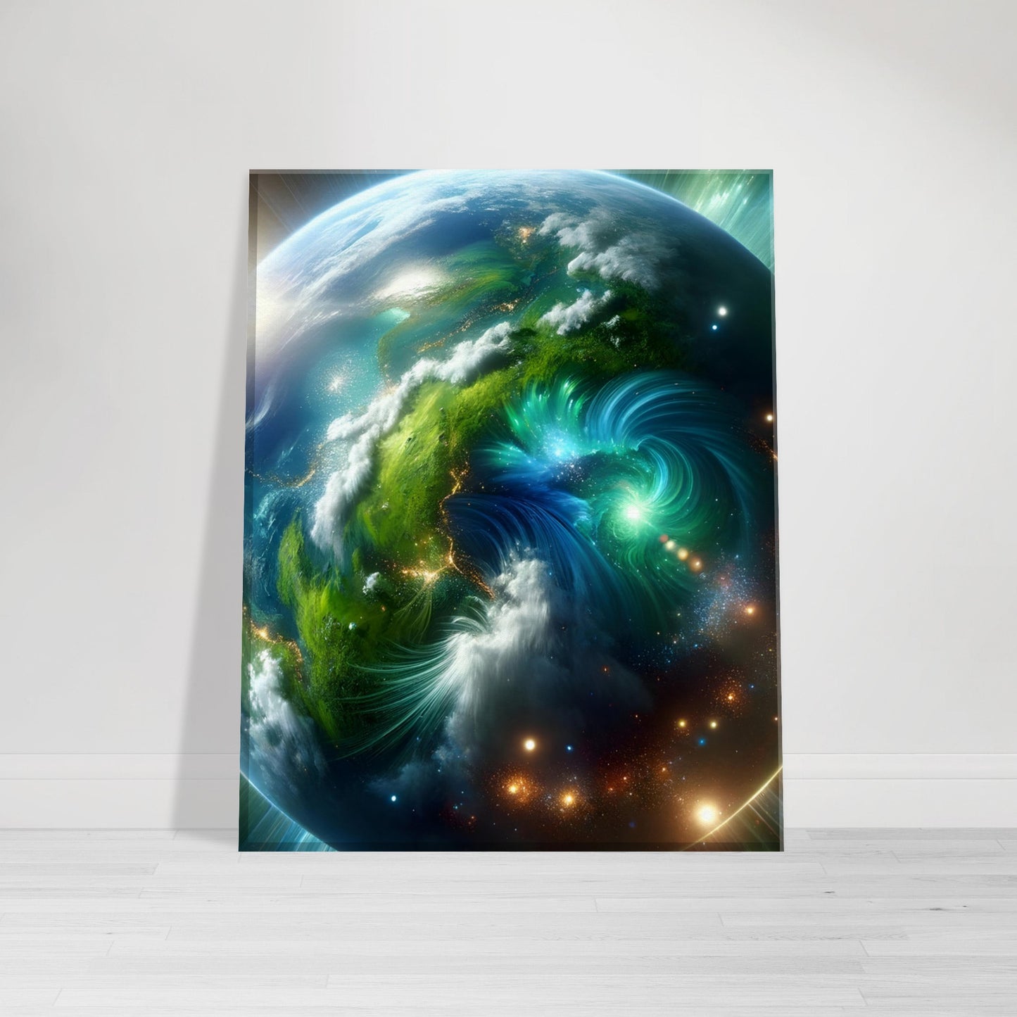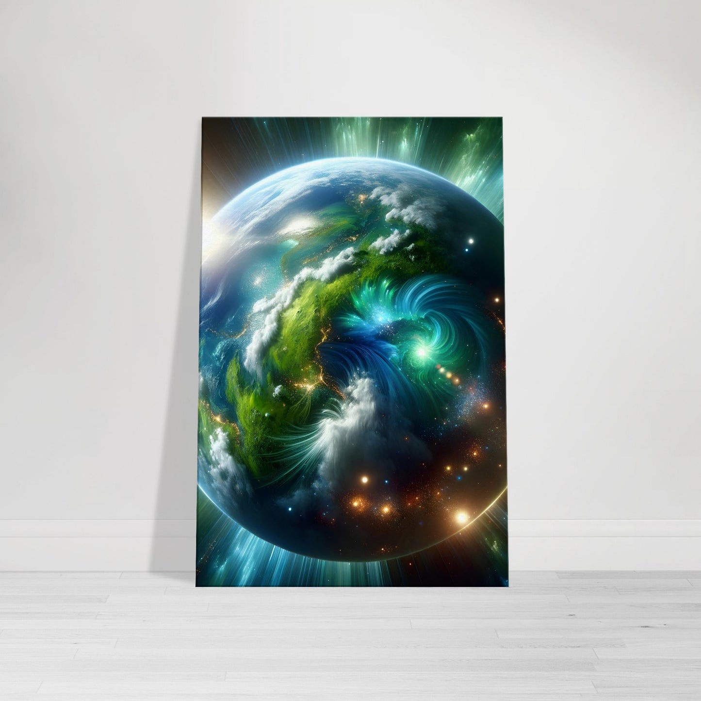Verdant Cosmic Oasis is a breathtaking canvas artwork that captures the beauty of life thriving within the vast cosmos. A luminous planet, teeming with lush green terrain and deep blue oceans, radiates vitality and calm. The celestial backdrop—featuring vibrant nebulas, sparkling stars, and glowing cosmic elements—envelops the scene in wonder and brilliance.