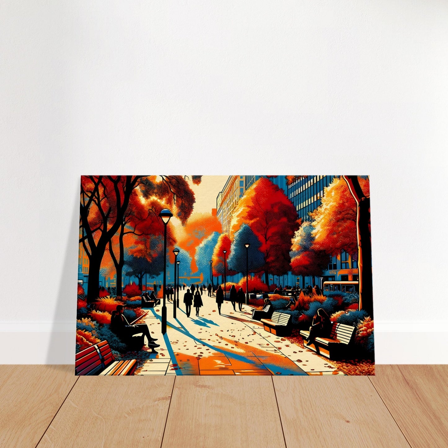 Celebrate the golden energy of autumn in the city with "Vibrant City – Pop Art". This striking canvas bursts with bold colours and graphic flair, capturing a lively urban park illuminated by rich amber, crimson, and ochre tones. Stylised trees line the walkway, casting dramatic shadows, while city dwellers stroll and mingle, all brought to life with the crisp clarity of pop art style.
