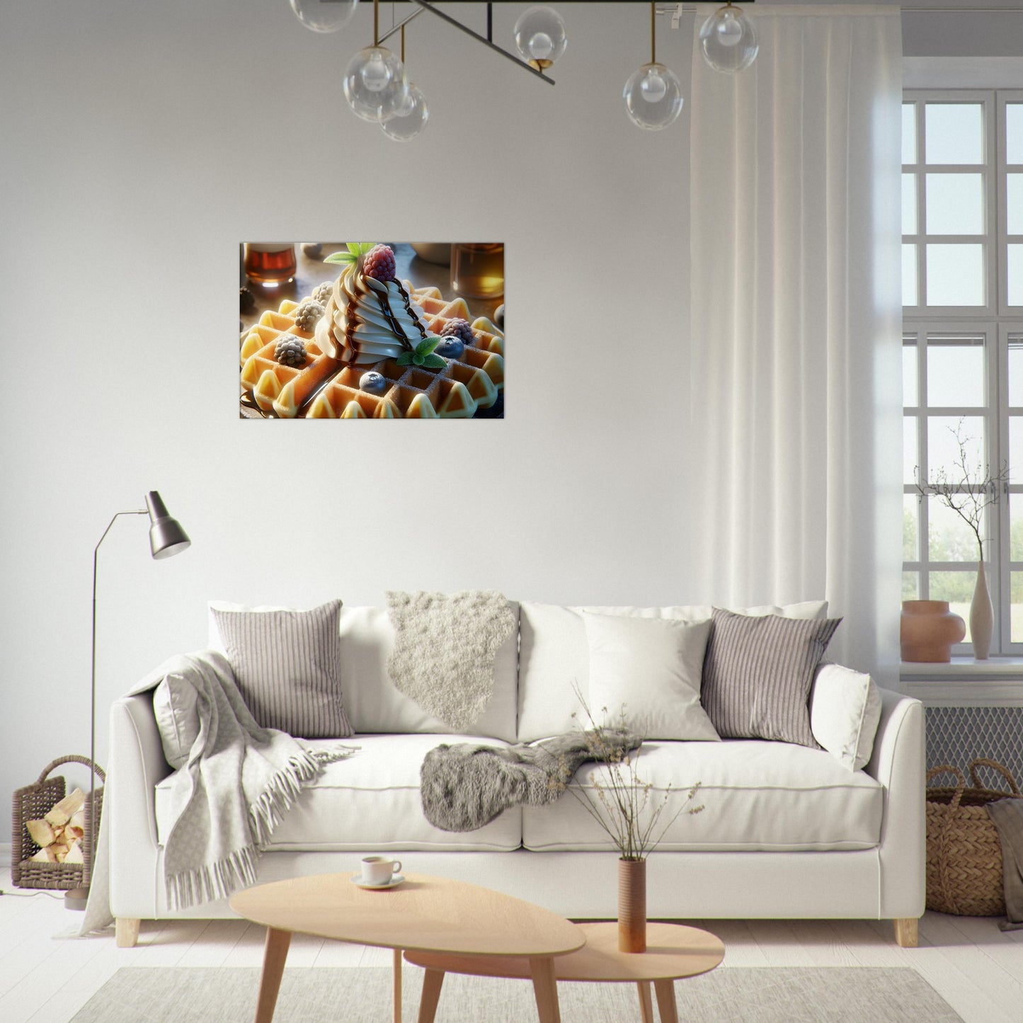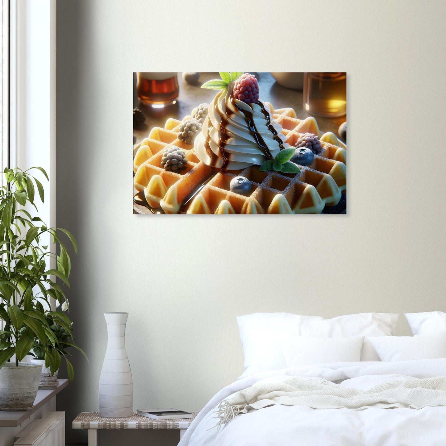Waffle Wonder is a heartwarming celebration of breakfast bliss, featuring golden-brown waffles with perfectly formed grids, each pocket filled with melting cream and silky chocolate drizzles. Crowned with whipped cream, a jewel-like raspberry, and surrounded by fresh berries dusted with icing sugar, this canvas print invites you to savor life’s simple pleasures. Bathed in soft ambient light, the artwork evokes the warmth and comfort of a leisurely morning meal.
