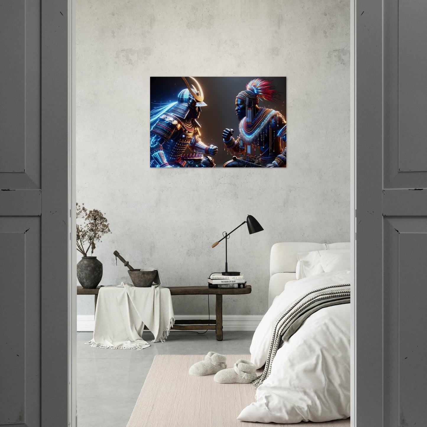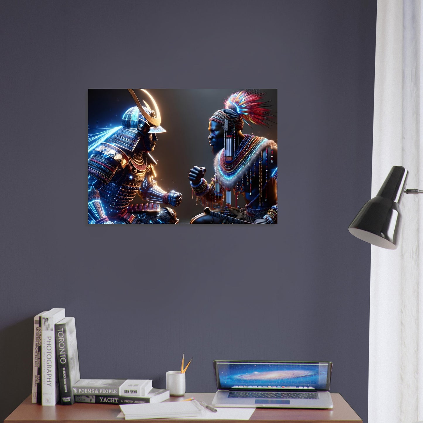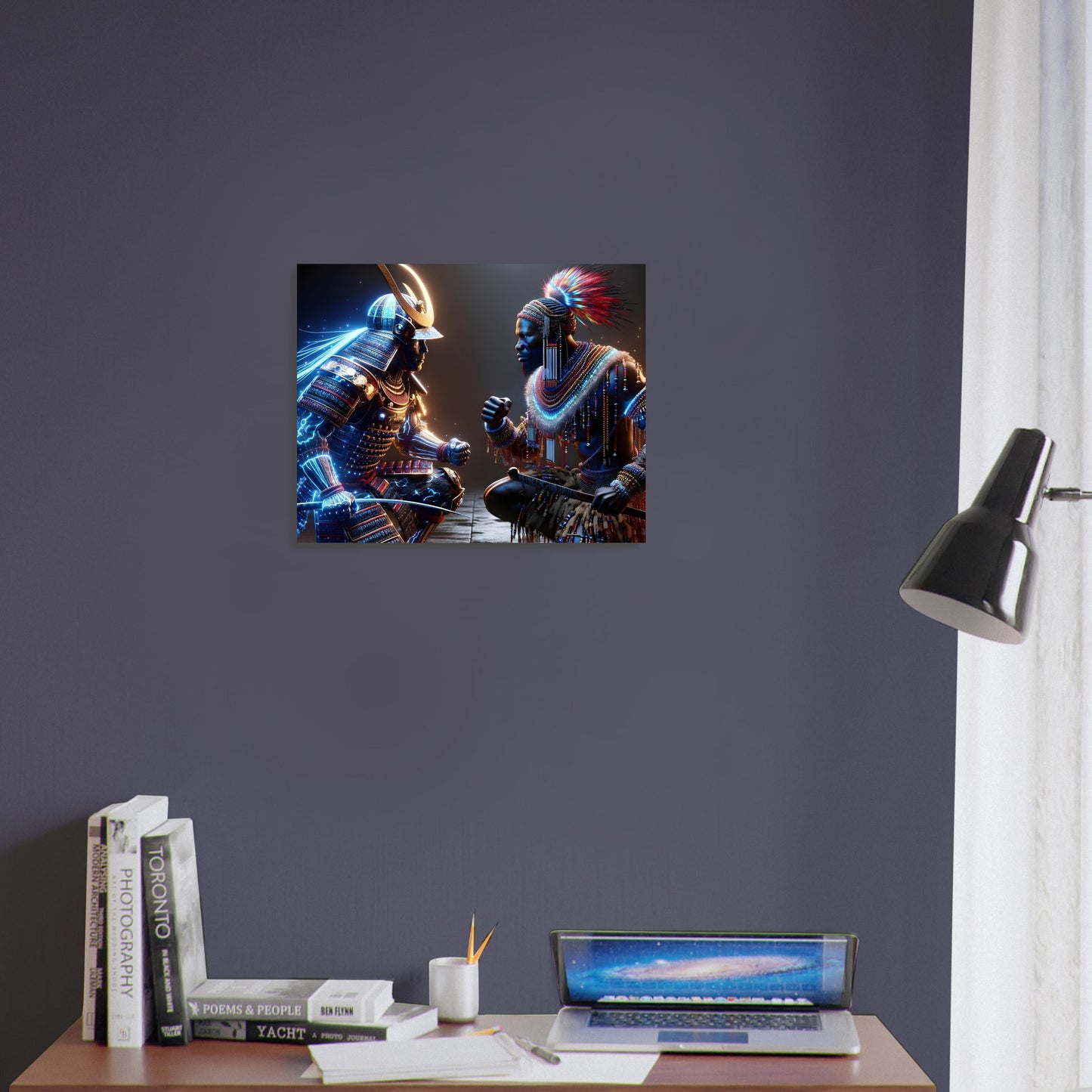 A rare moment of unity and intensity, Warriors' Alliance captures the breathtaking convergence of two distinct warrior traditions—each forged in different corners of the world, yet drawn together like celestial forces during an eclipse. Bathed in surreal cosmic light, the figures stand side by side in full traditional armor, their contrasting styles echoing both harmony and tension. Glowing accents of luminous gold, deep indigo, and fiery crimson weave through their battle attire, enhancing the visual drama and symbolic weight of this encounter. The backdrop is dark, elemental, and timeless—suggesting a battlefield not bound by history, but by legend. With its intricate detail and radiant power, Warriors' Alliance evokes strength in diversity, unity in defiance. Printed on sleek magnetic metal, this piece is a visual epic—a mythic ode to warriors across time and tradition.