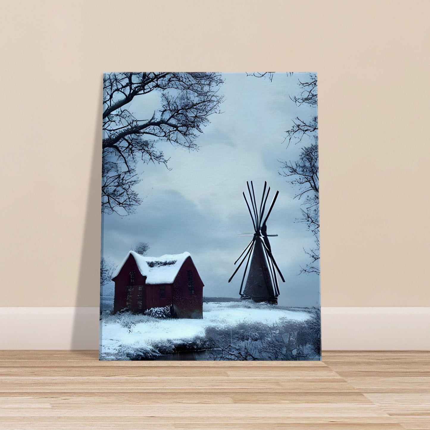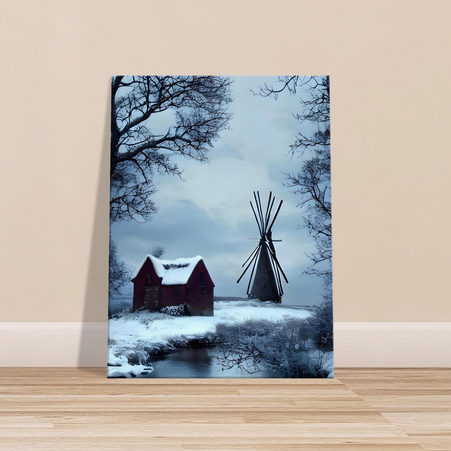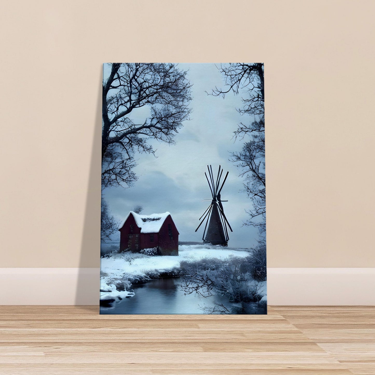 Winter Lake Cabin invites you into a peaceful winter retreat, where a rustic log cabin and timeless windmill stand still beside a frozen lake. Framed by bare trees and a soft, overcast sky, the scene is coated in a gentle layer of snow, reflecting perfectly on the icy surface. This artwork captures the solitude and quiet beauty of the countryside in winter, offering a sense of stillness, warmth, and natural charm.