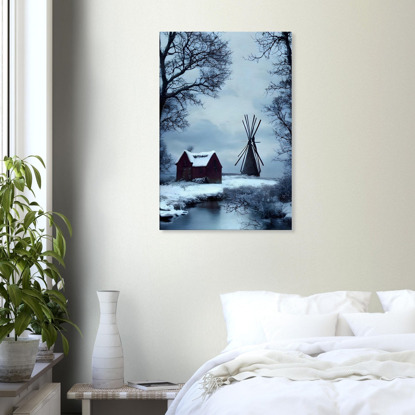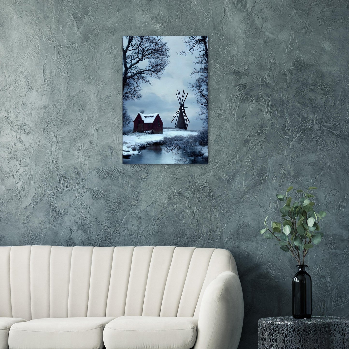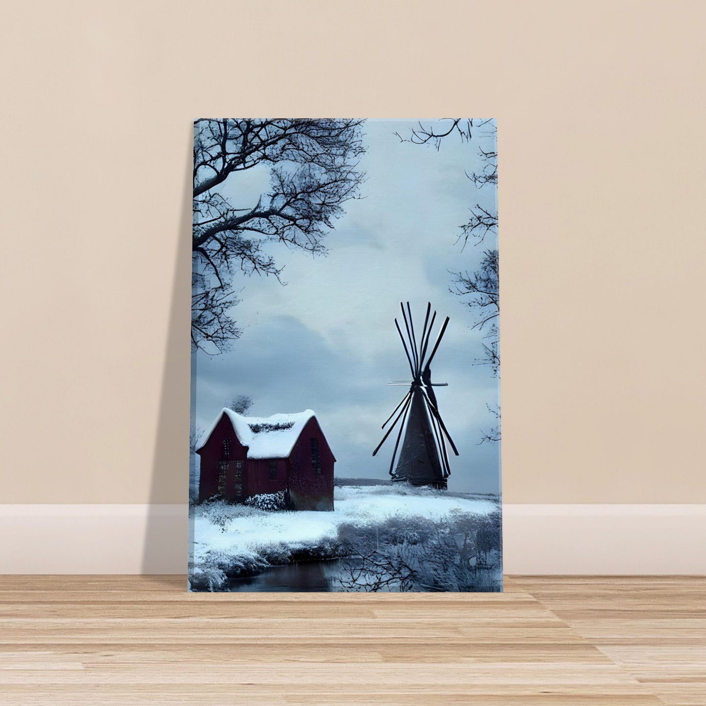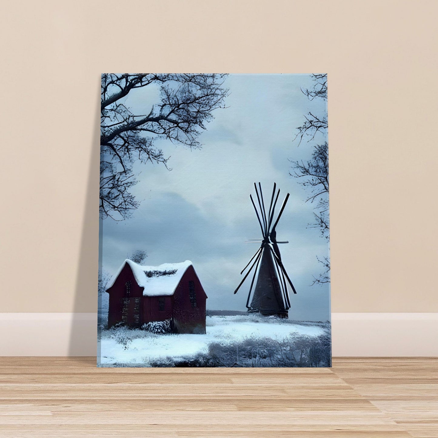 Winter Lake Cabin invites you into a peaceful winter retreat, where a rustic log cabin and timeless windmill stand still beside a frozen lake. Framed by bare trees and a soft, overcast sky, the scene is coated in a gentle layer of snow, reflecting perfectly on the icy surface. This artwork captures the solitude and quiet beauty of the countryside in winter, offering a sense of stillness, warmth, and natural charm.