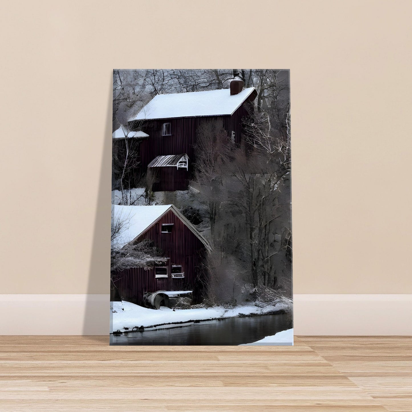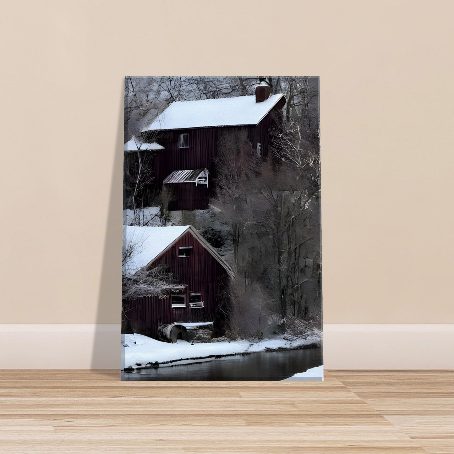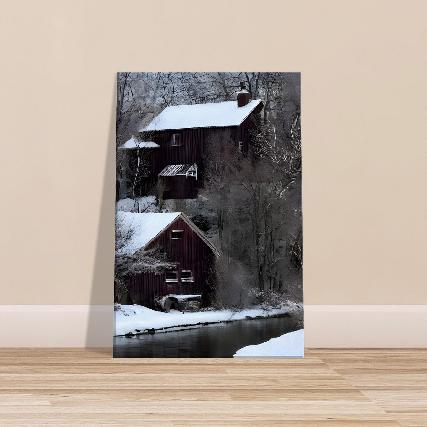 Winter Lake House captures the serene charm of a quiet riverside escape. A rustic home sits peacefully on the snowy riverbank, its reflection mirrored in the gentle waters of a partially thawed river. Surrounded by bare trees and winter stillness, this composition exudes calm and solitude. The soft tones and symmetrical balance invite viewers into a space of peaceful contemplation and seasonal beauty.